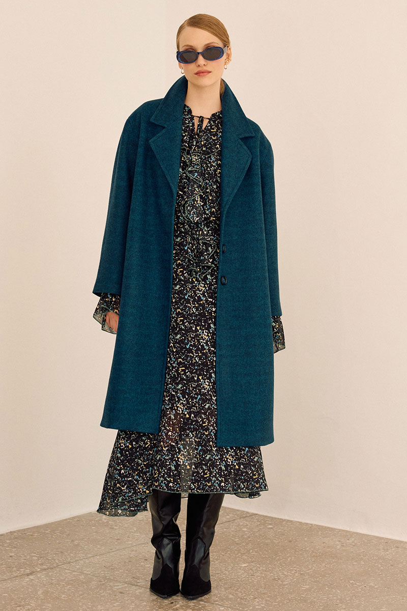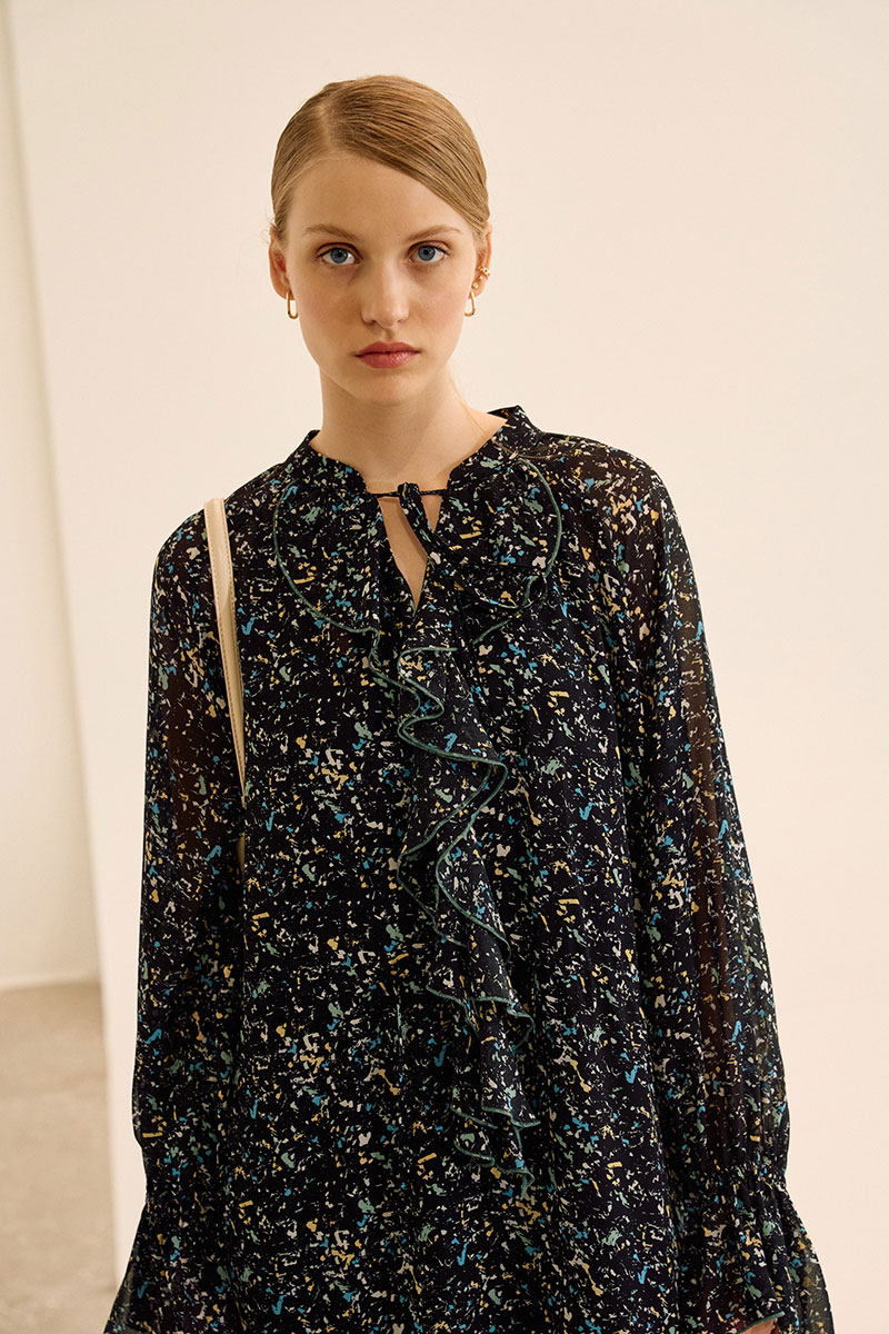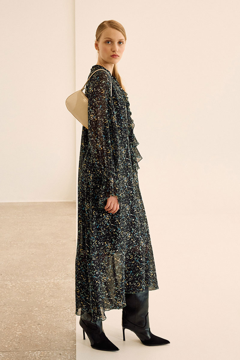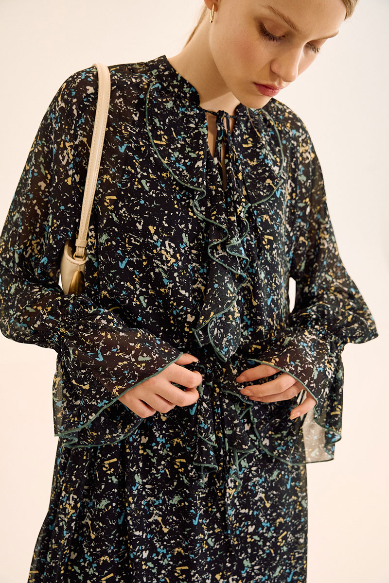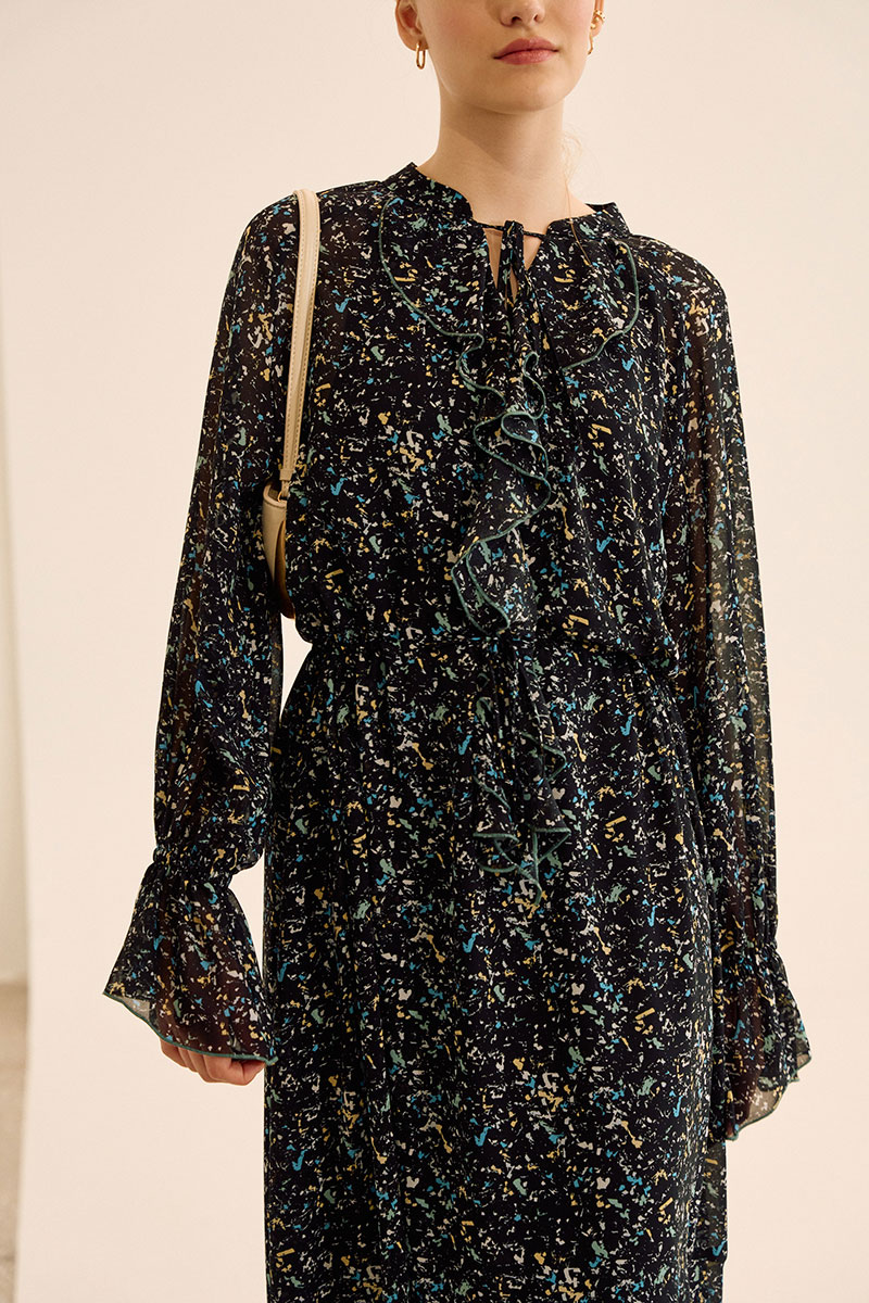 Платье свободного кроя, выполнено из шифона. Рукав длинный реглан, по низу рукава резинка. Глубокий V-образный вырез горловины, в который вставлена рюша, по горловине стойка на завязку, по середине выреза застежка на навесной потайной крючок. По линии талии по переду и спинке кулиса на завязку, по низу платья притачной волан. В комплект входит платье-комбинация из трикотажной подкладки на бретелях.