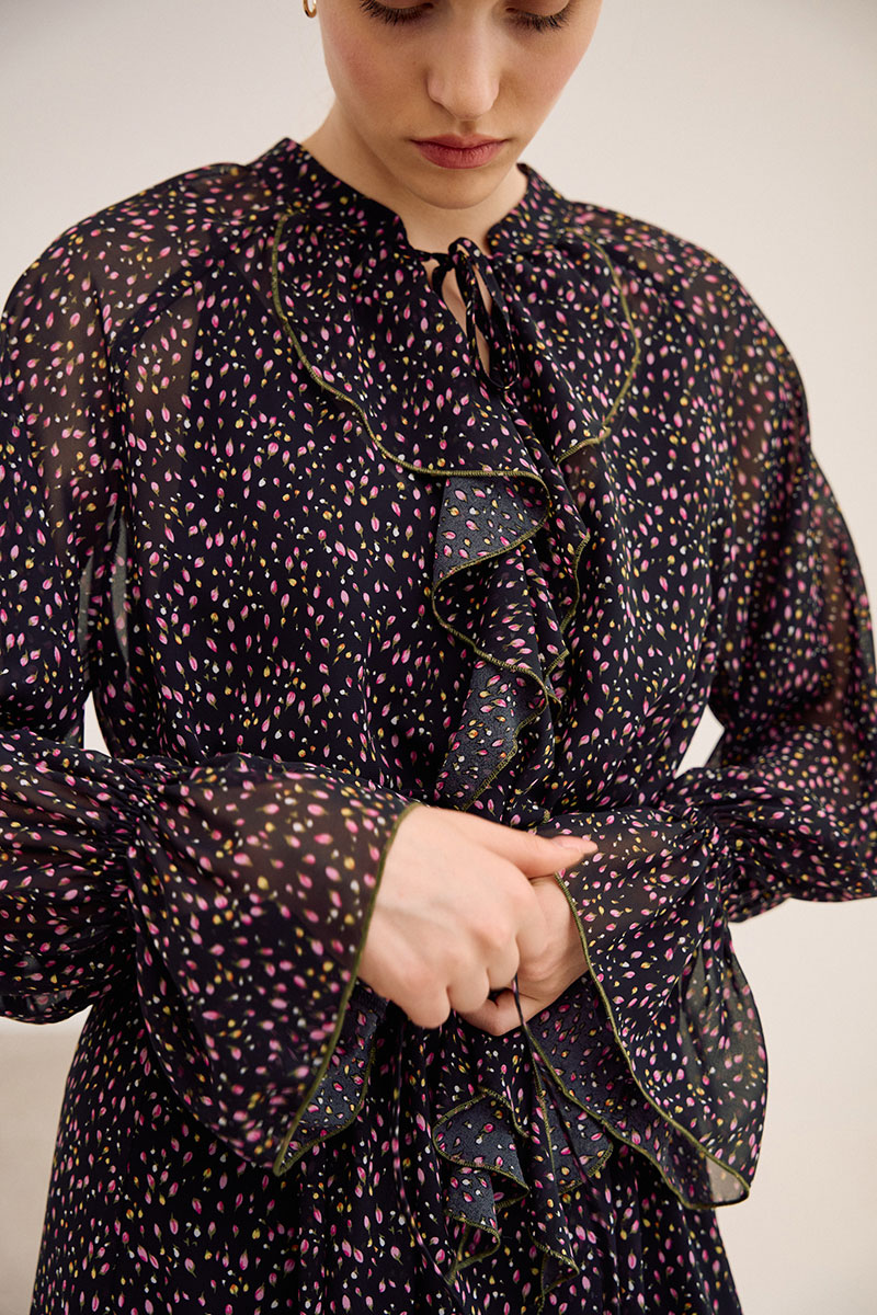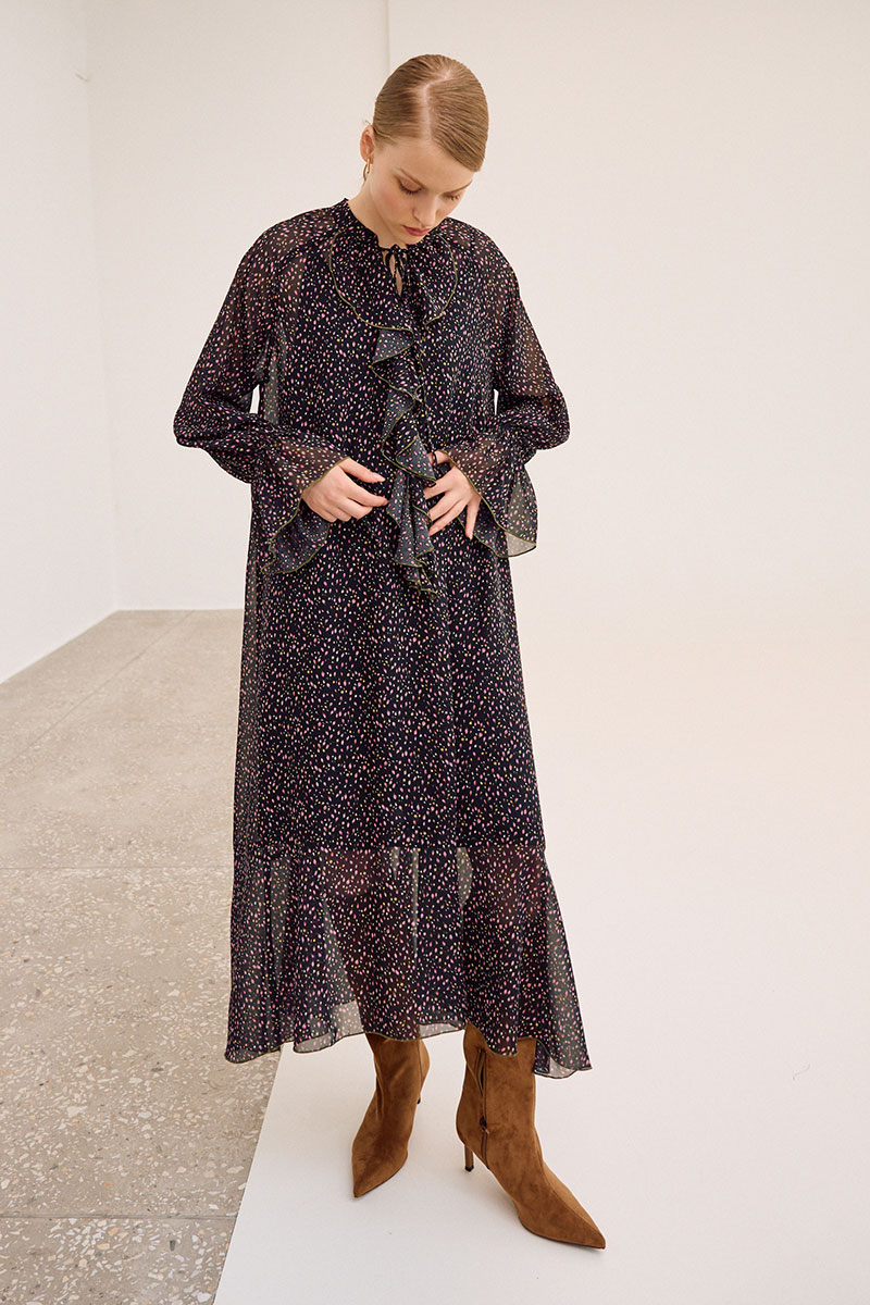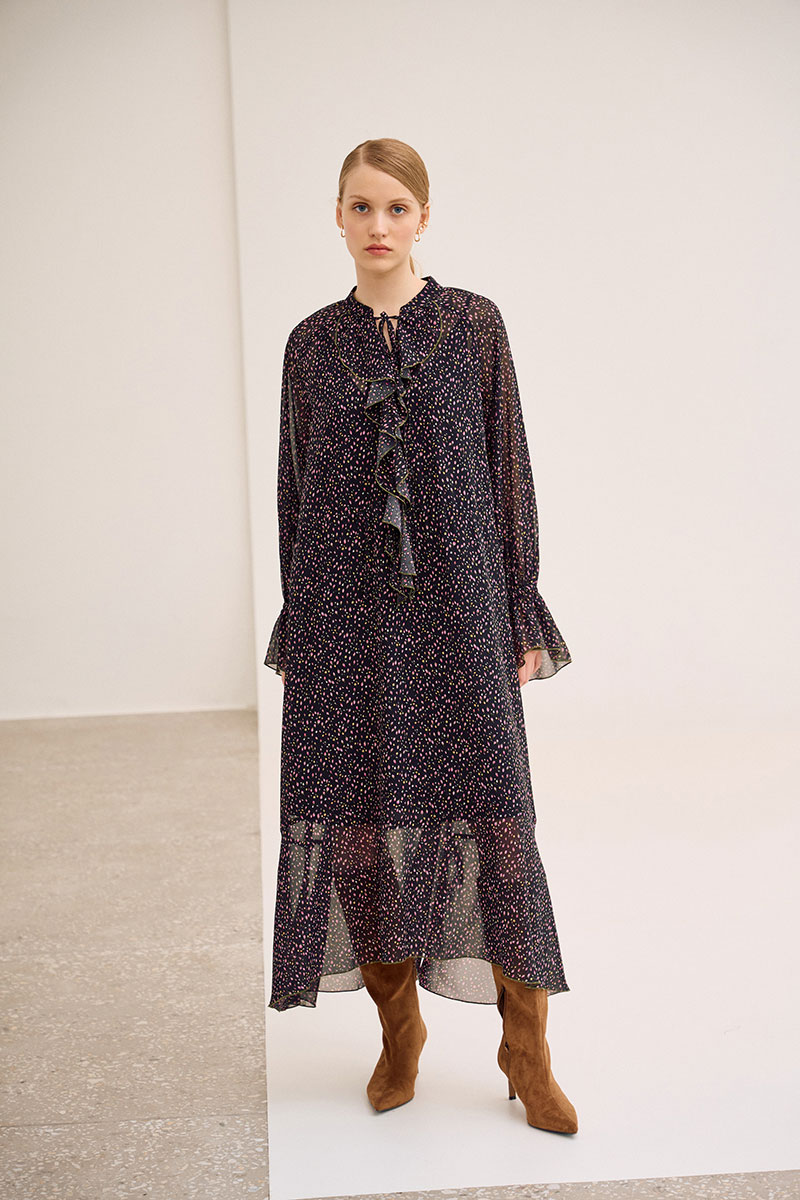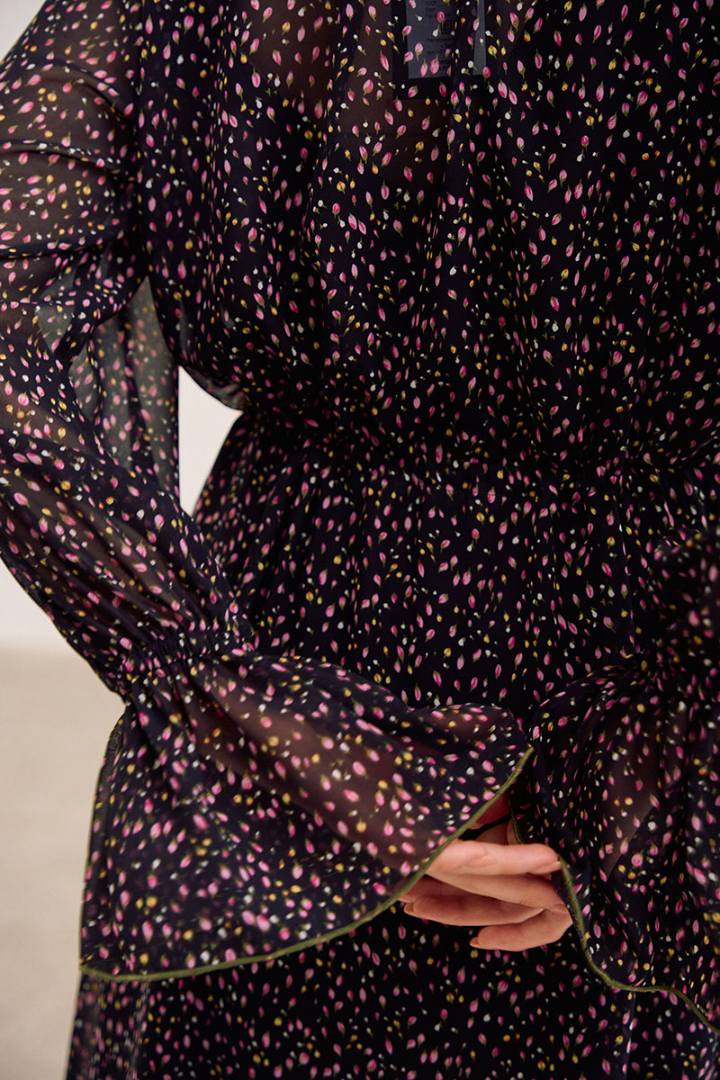 Платье свободного кроя, выполнено из шифона, дизайн мелкий цветочек. Рукав длинный реглан, по низу рукава резинка. Глубокий V-образный вырез горловины, в который вставлена рюша, по горловине стойка на завязку, по середине выреза застежка на навесной потайной крючок. По линии талии по переду и спинке кулиса на завязку, по низу платья притачной волан. В комплект входит платье-комбинация из трикотажной подкладки на бретелях.
