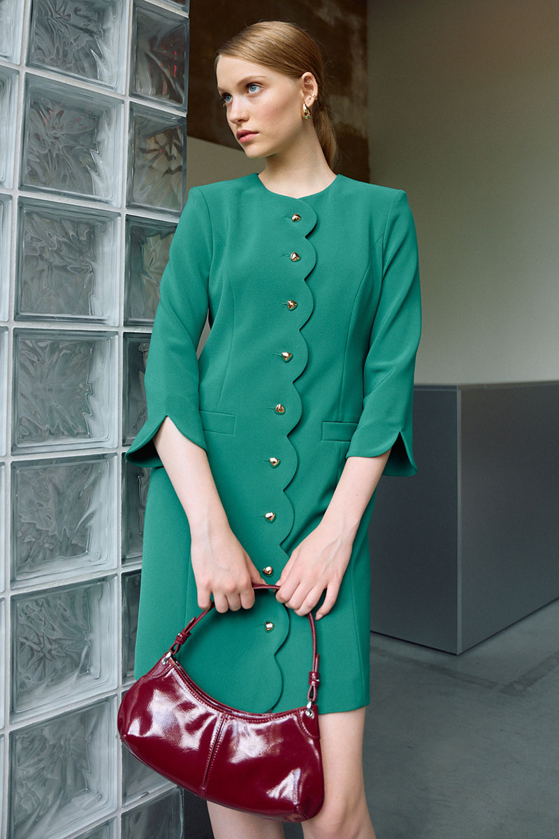 Платье полуприлегающего силуэта, по переду и спинке на подкладке. Рукав втачной ¾, по низу фигурный. Округлый вырез горловины, застежка центральная на петли и пуговицы, борт фигурной формы. По вертикальный рельефы и прорезные карманы. По спинке средний шов и вертикальные рельефы.