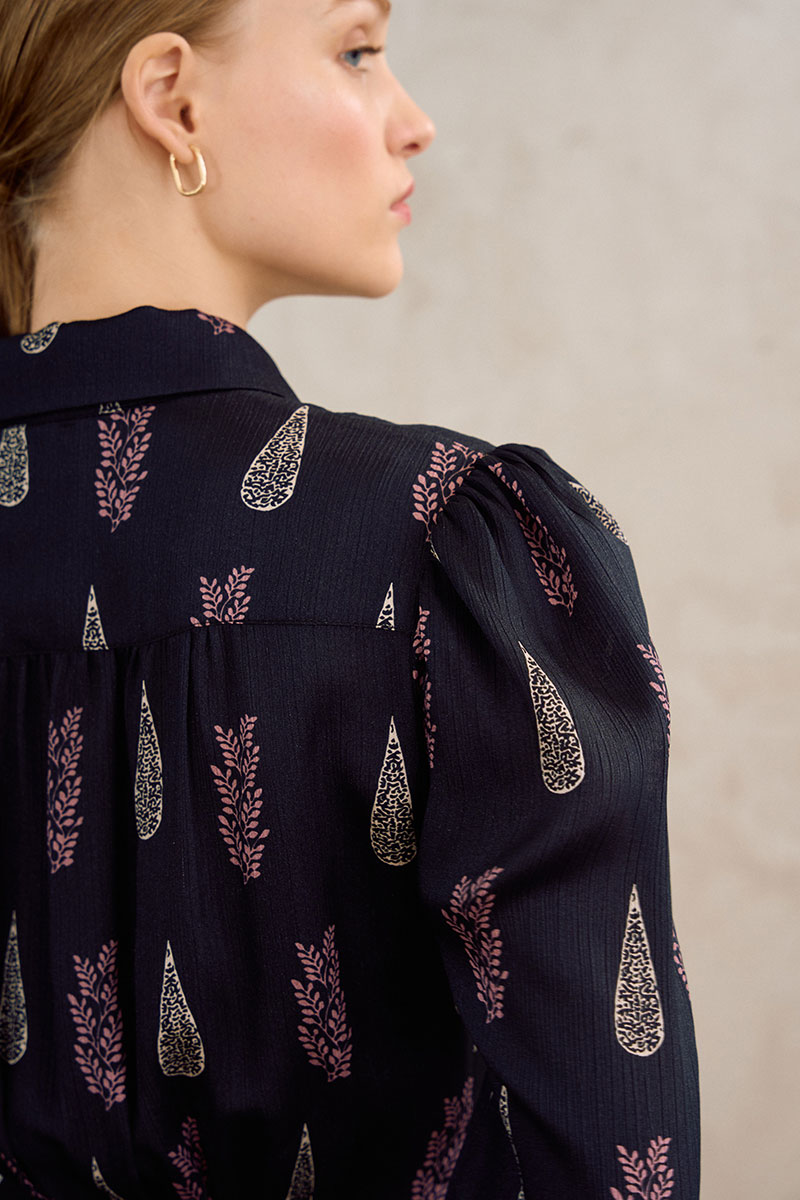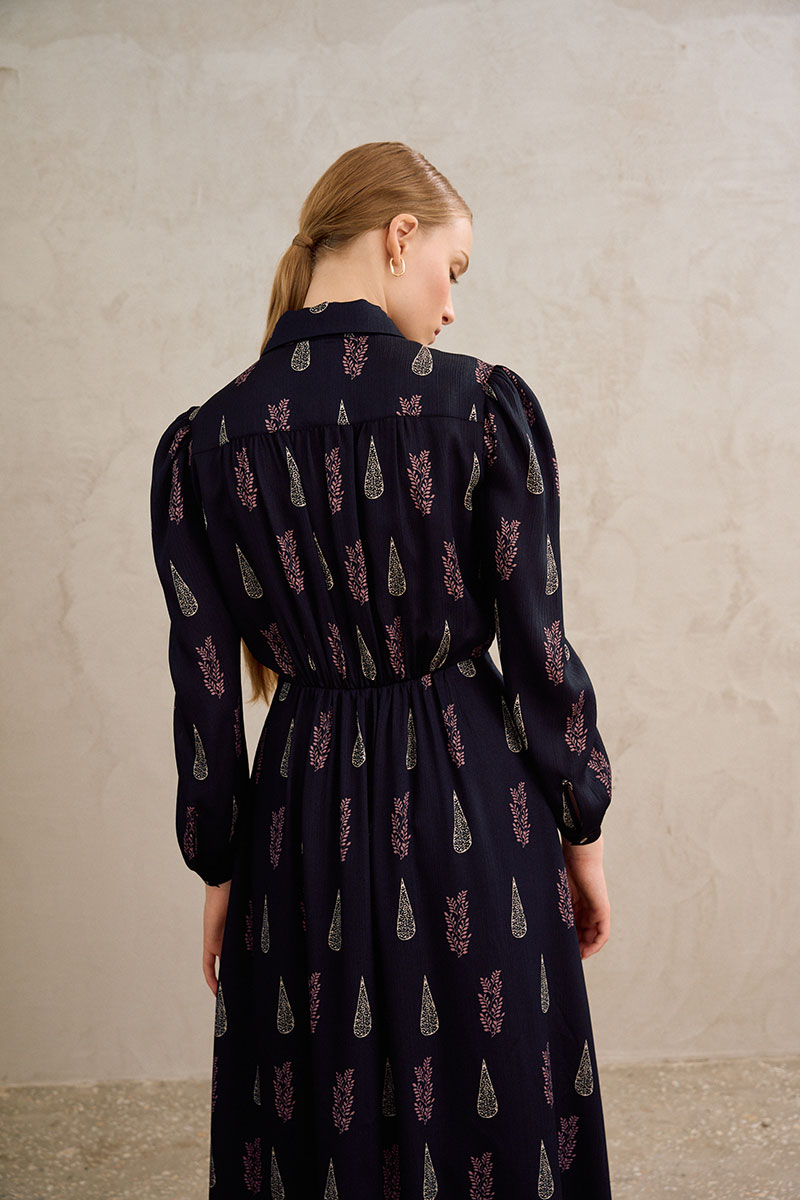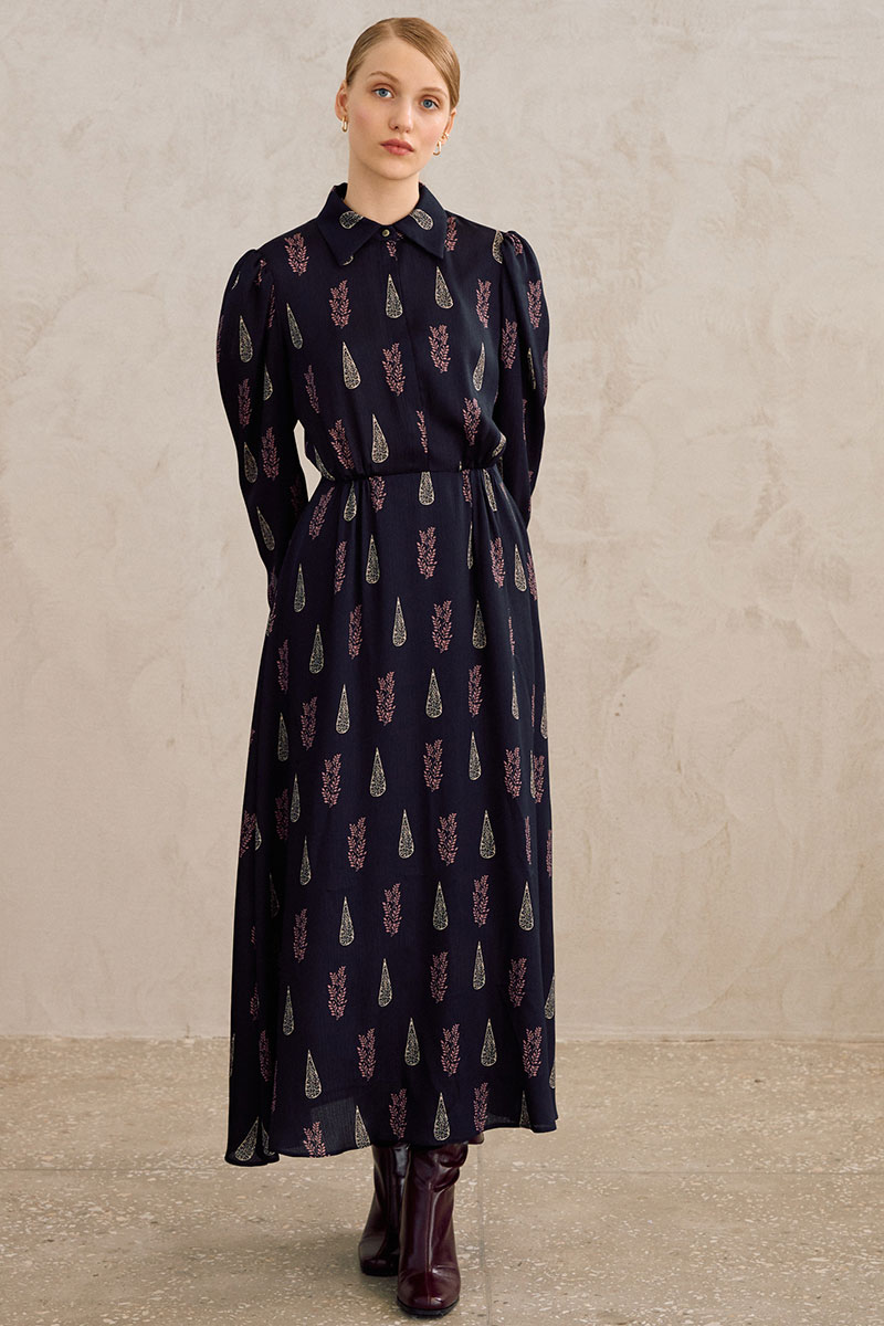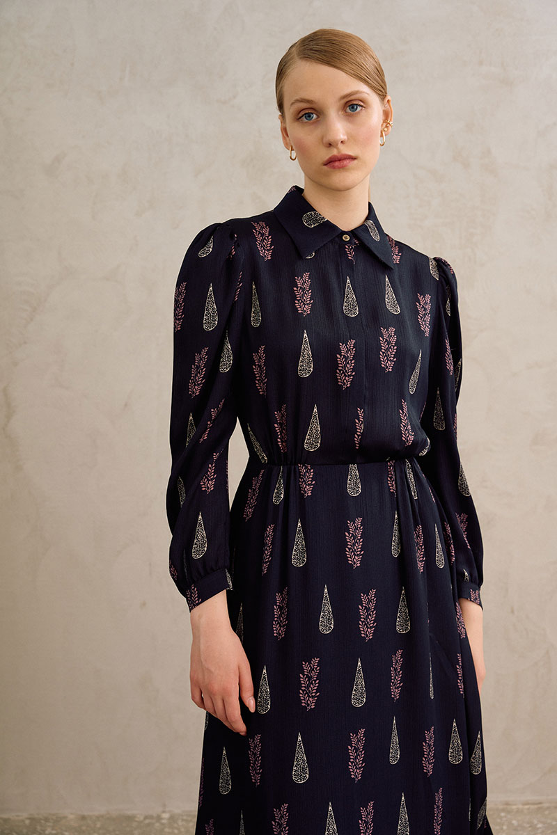 Платье полуприлегающего силуэта, отрезное по талии. Рукав втачной, по низу рукава манжета с застежкой на петли и пуговицы. Воротник рубашечного кроя, по переду центральная потайная застежка на петли и пуговицы до талии. По спинке отрезная кокетка и сборки от кокетки. К платью прилагается пояс.