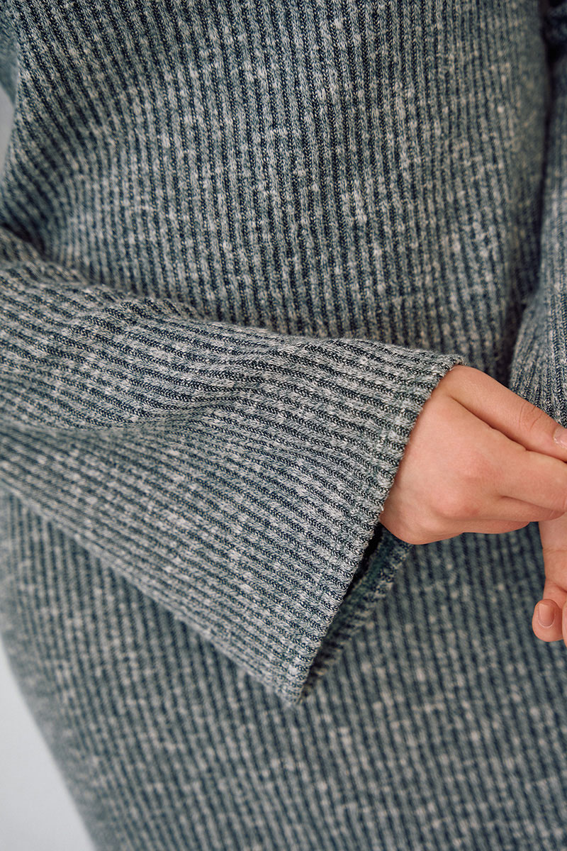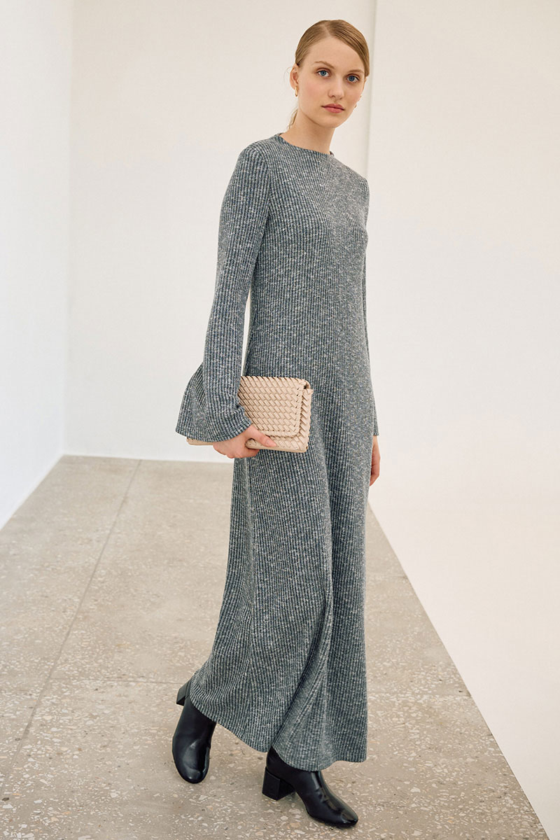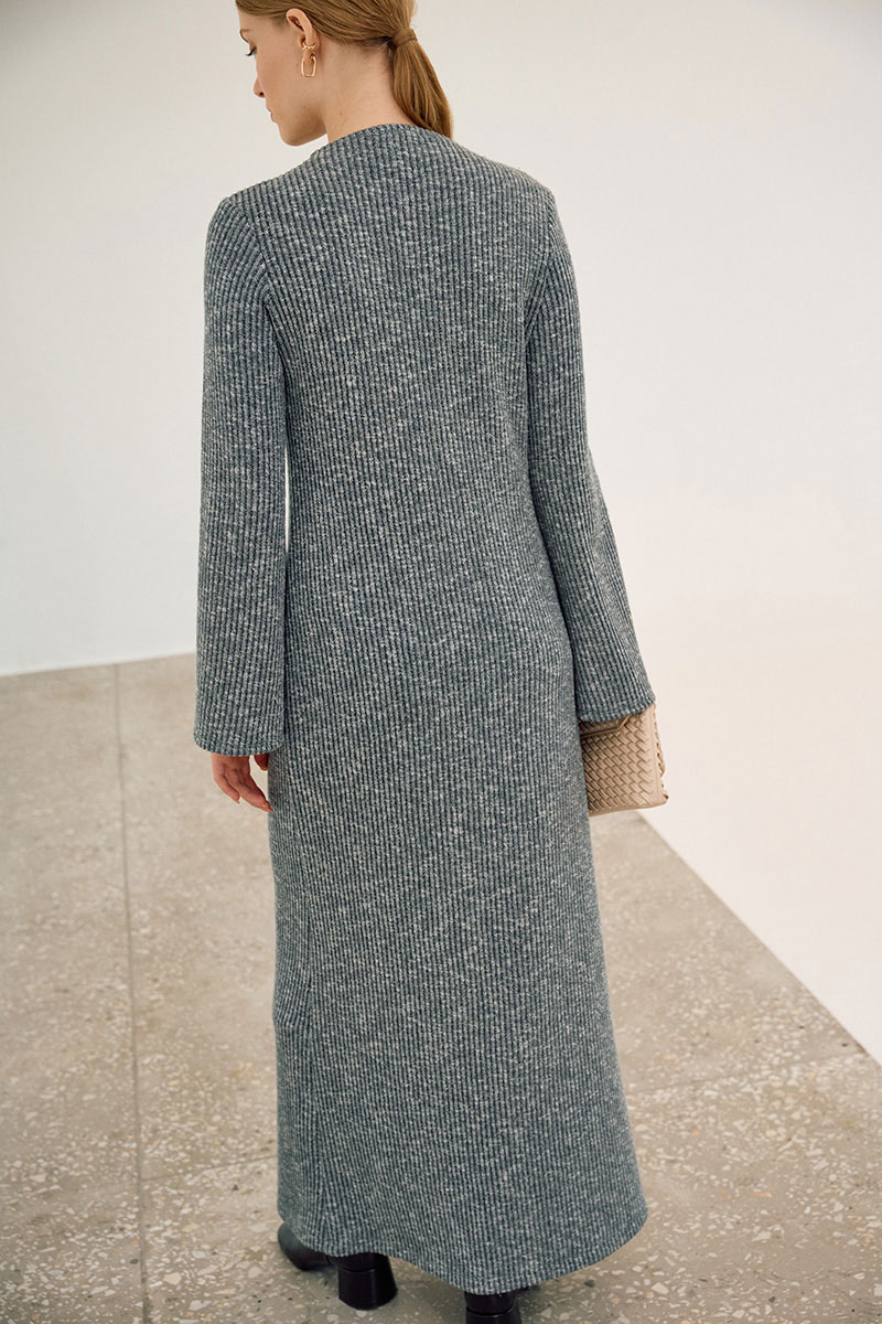 Платье из трикотажного полотна полуприлегающего силуэта в длине макси. Рукав втачной, длинный, к низу расширенный.