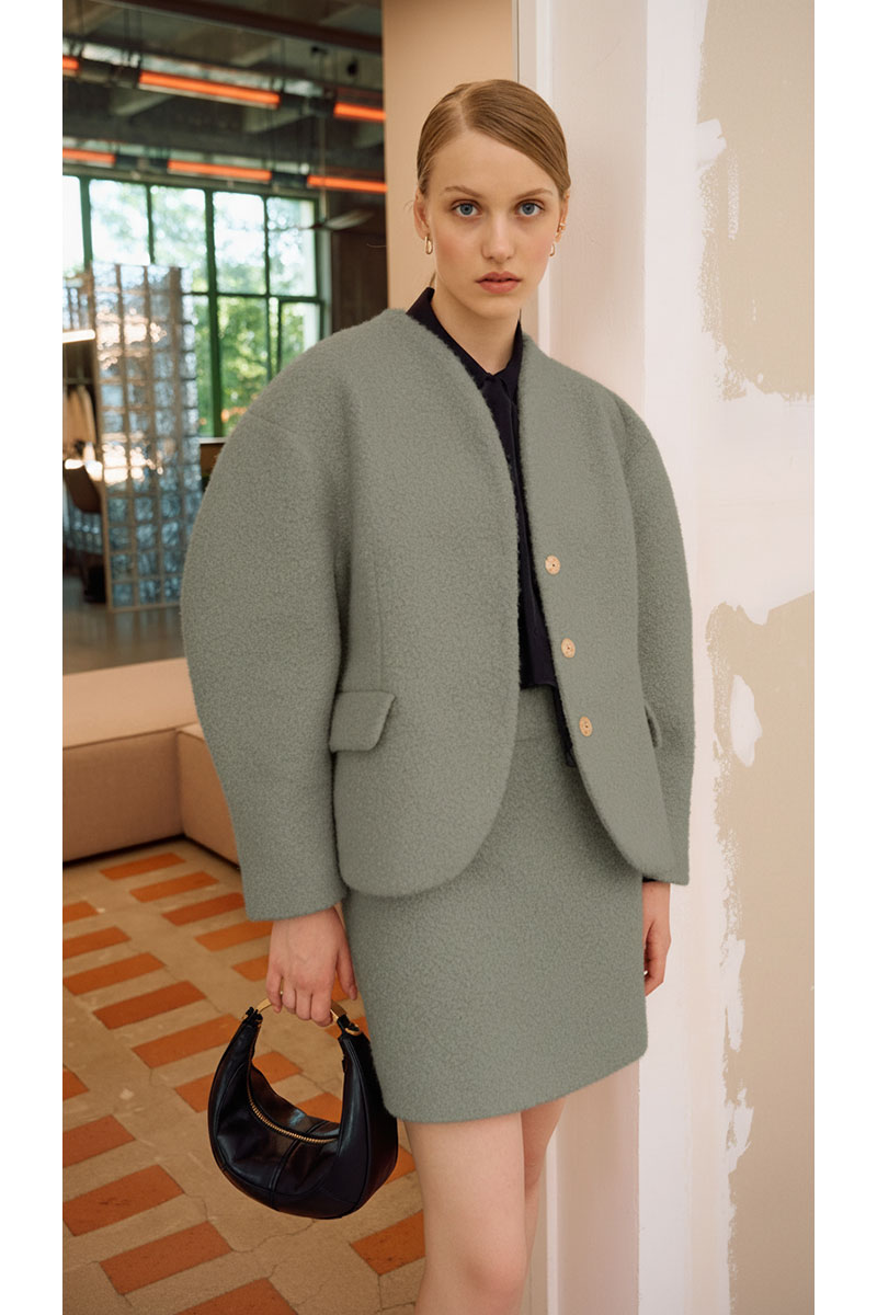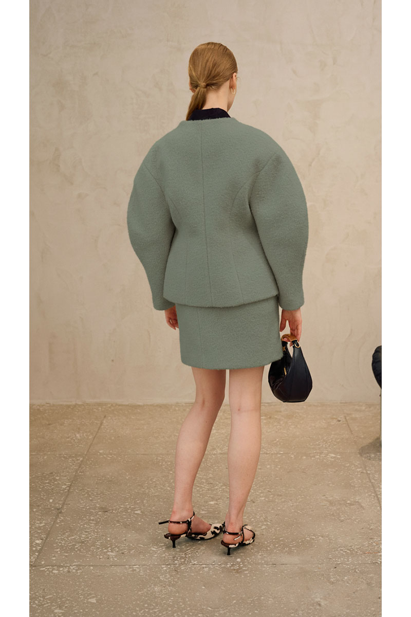 Полупальто полуприлегающего силуэта на подкладке. Линия плеча спущена, рукав фигурной формы. Цельнокроеный воротник, переходящий в центральную застежку на потайные кнопки. По переду прорезные карманы с отлетными клапанами. По спинке средний шов и рельефы.