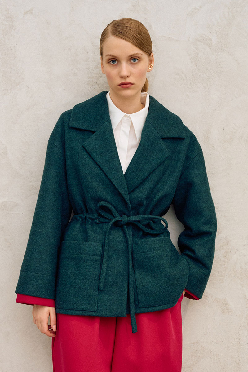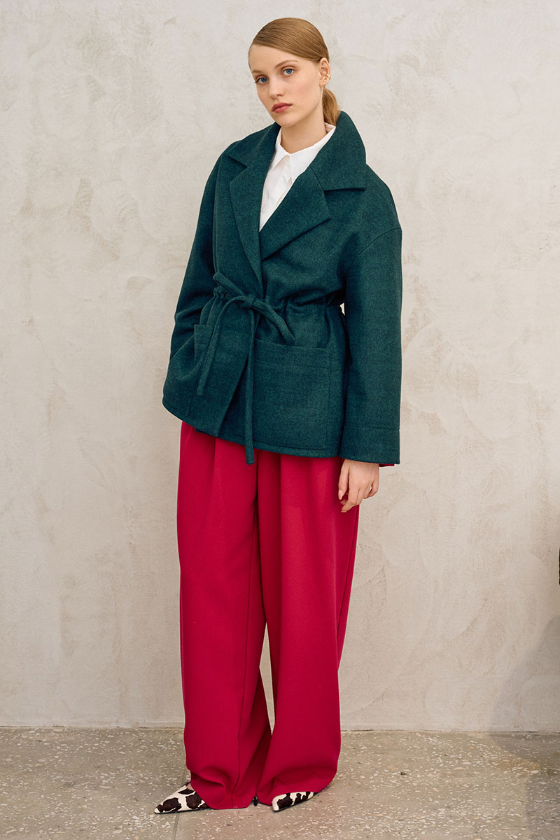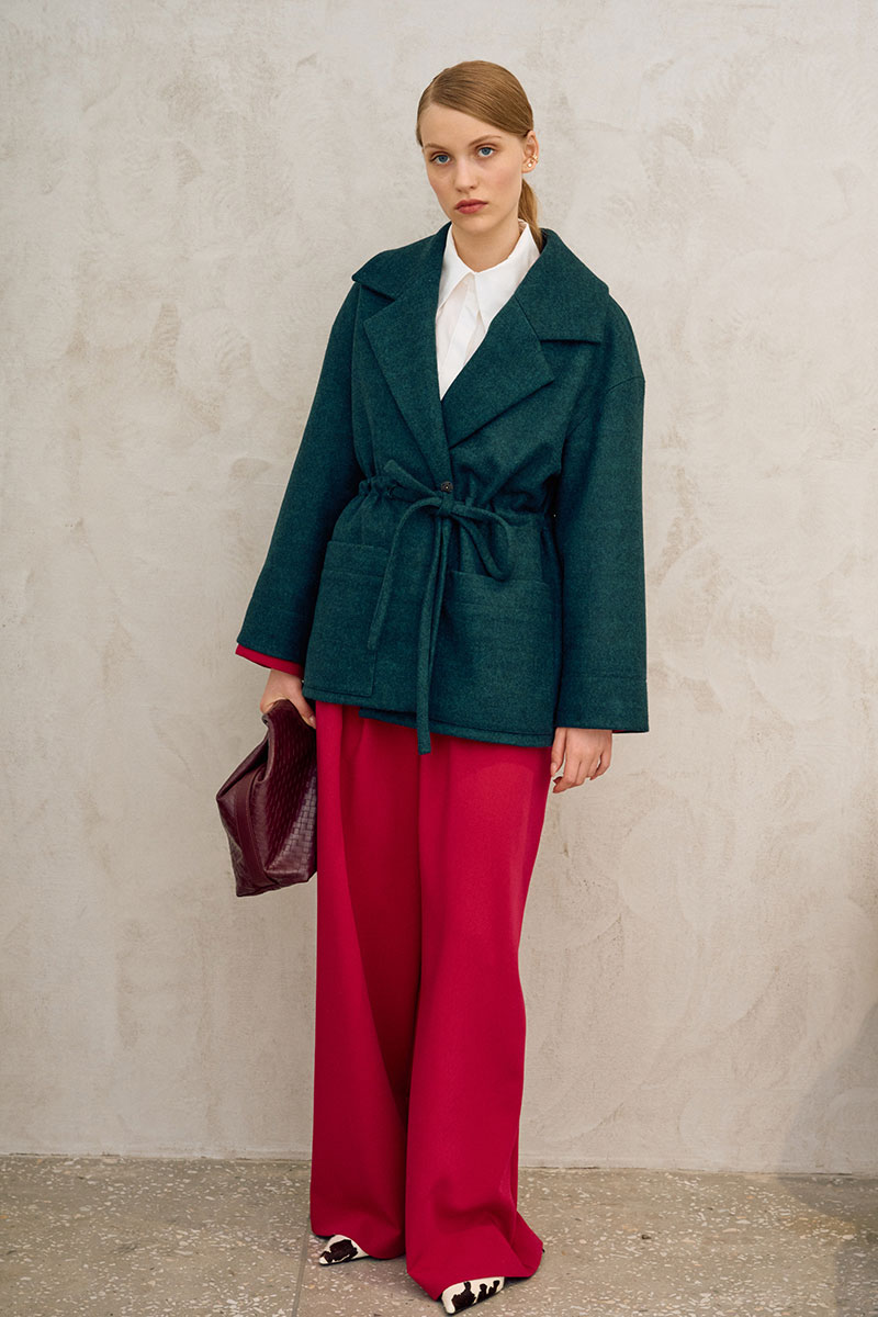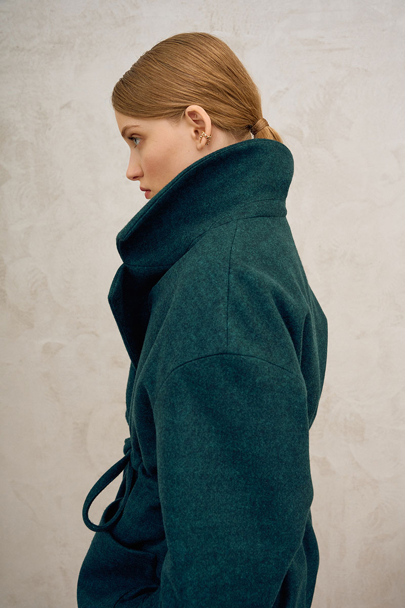 Пальто свободного кроя на подкладке. Линия плеча спущена, рукав длинный. Воротник пиджачного типа, застежка однобортная на потайную кнопку, по линии талии кулиса, в которую втянут пояс на резинке. По бокам накладные карманы.