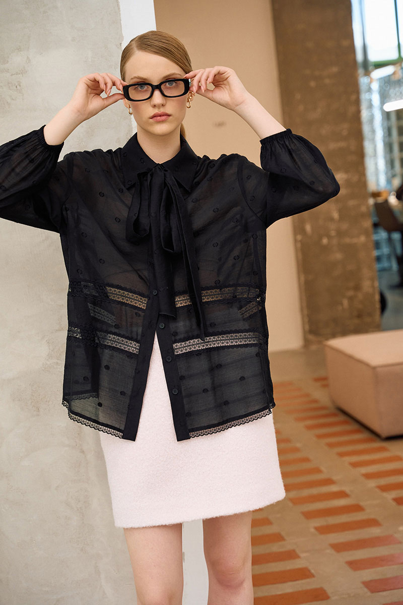 Блуза свободного кроя, прямого силуэта. Линия плеча спущена, по низу рукава приточная манжета на застежку петли и пуговицы. Воротник рубашечного кроя, застежка на петли и пуговицы. По переду и спинке вшито кружево. Ярким дополнительным акцентом является съемный бант, который также можно использовать как пояс.