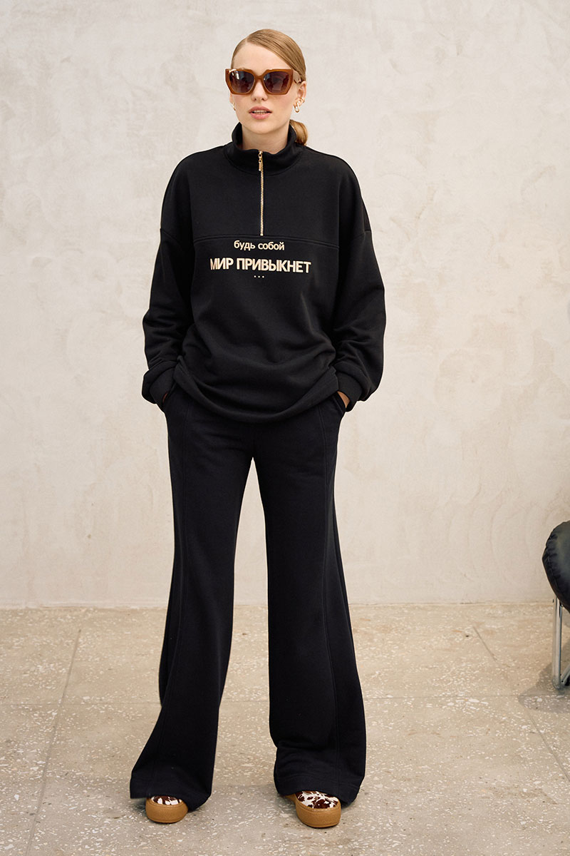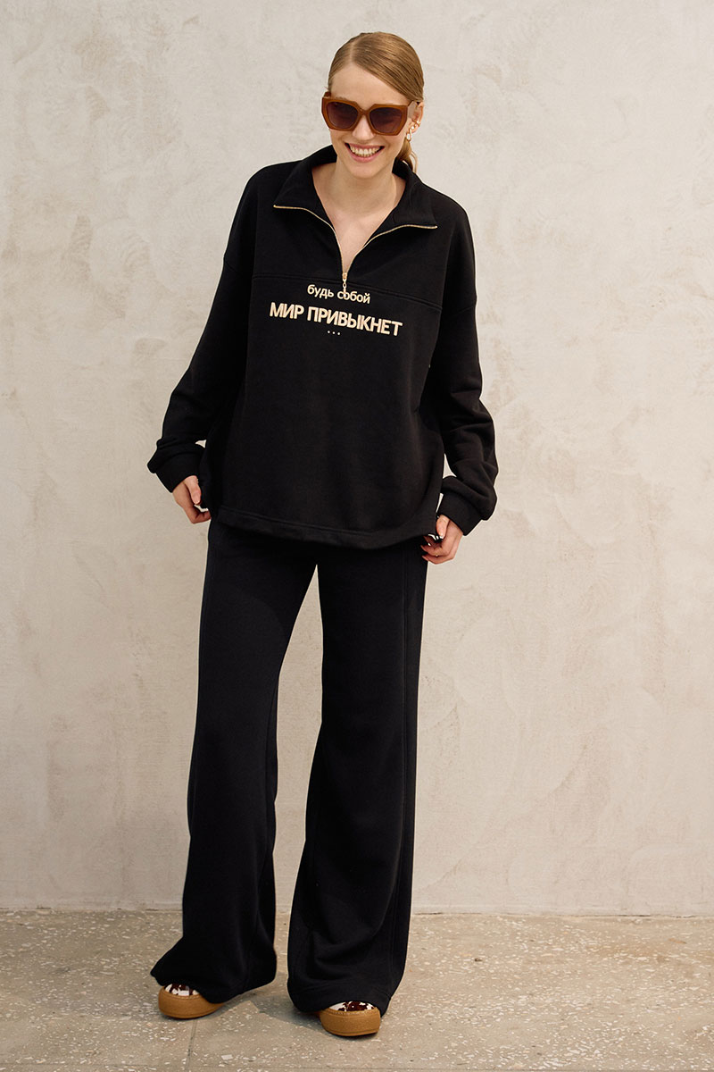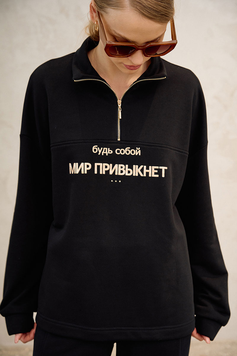 Кофта свободного кроя, прямого силуэта. Линия плеча спущена, рукав длинный, по низу рукава резинка. По горловине воротник-стойка на застежку молнию. По переду горизонтальная кокетка, по центру печать, по низу регулируемая резинка на фиксаторы.