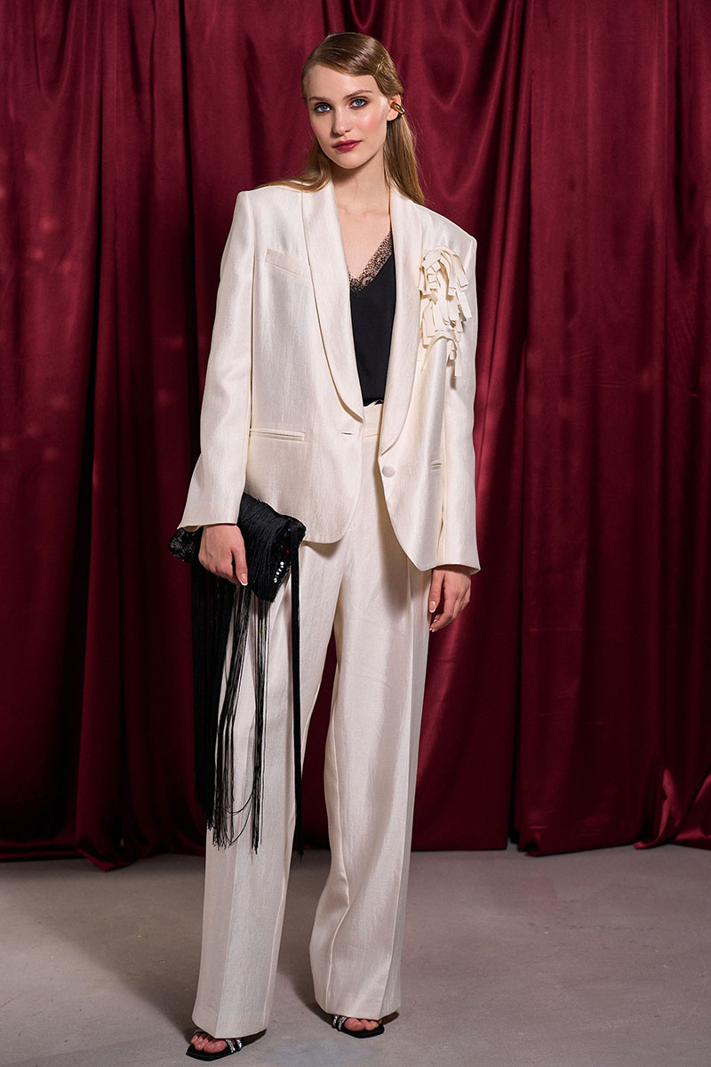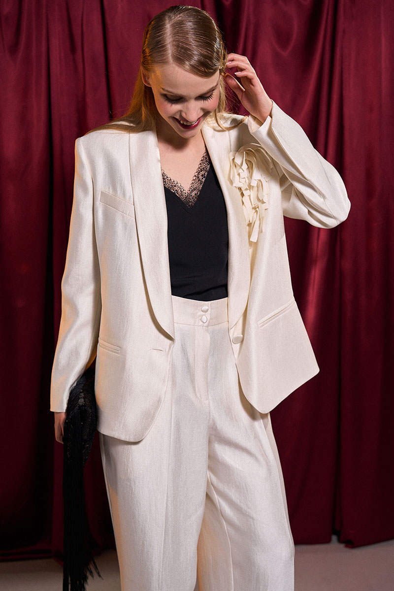 - Состав: жакет и брюки: вискоза 46%; полиамид 40%; ПЭ 14%; топ: ПЭ 100%
