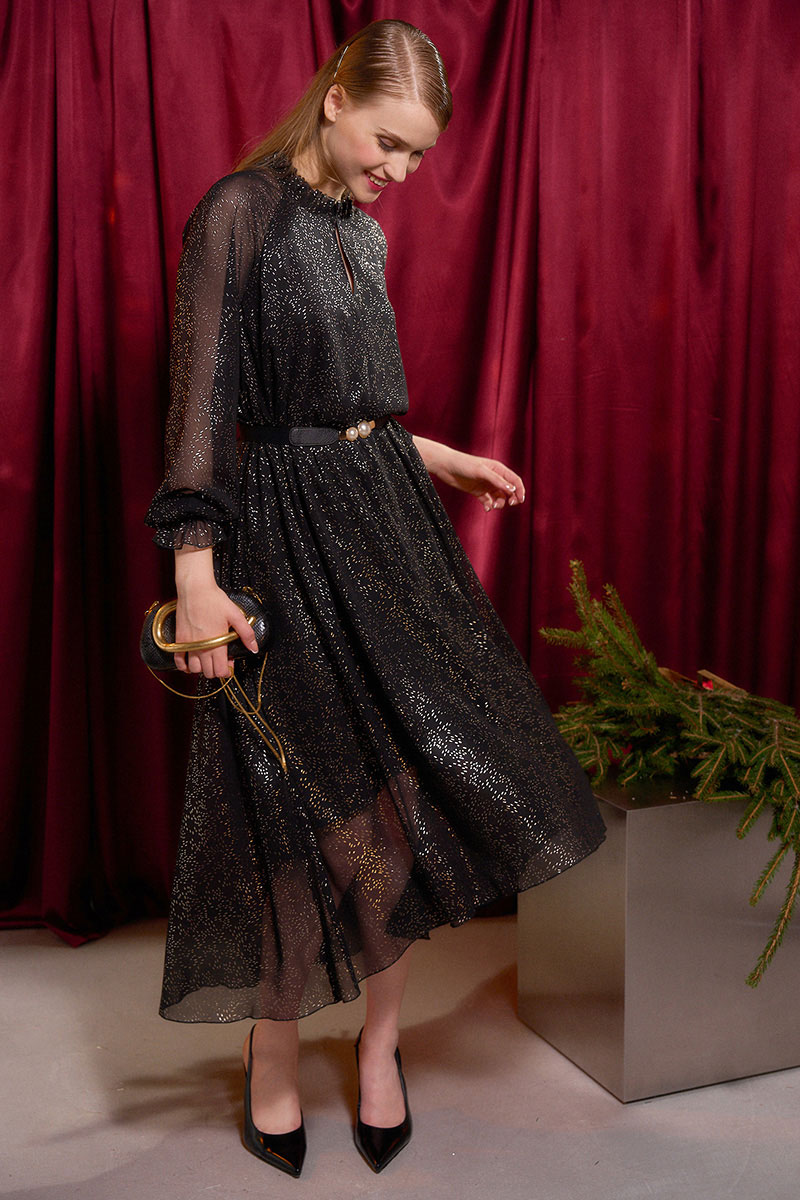 Платье длины миди А-силуэта выполнено из шифона, по переду и спинке на подкладке. Широкий длинный рукав-реглан. По низу рукава прошита резинка в несколько рядов. Горловина с невысокой стойкой на сборку. По переду средний шов, у основания шеи переходящий в застёжку на навесной крючок. Низ платья ассиметричный. Пояс входит в комплектацию.