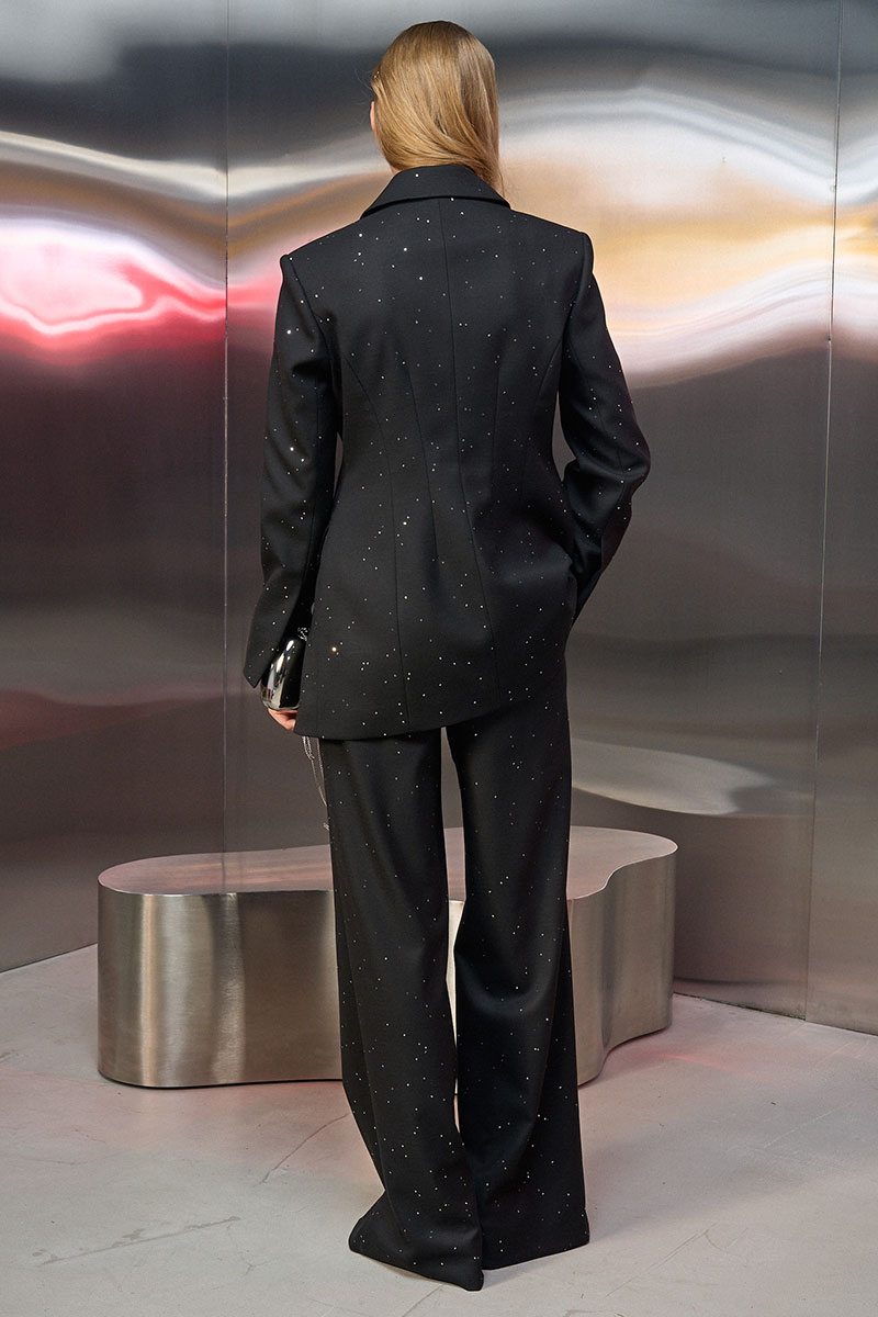 Комплект брючный, состоит из жакета и брюк и выполнен из костюмной ткани с пайетками.