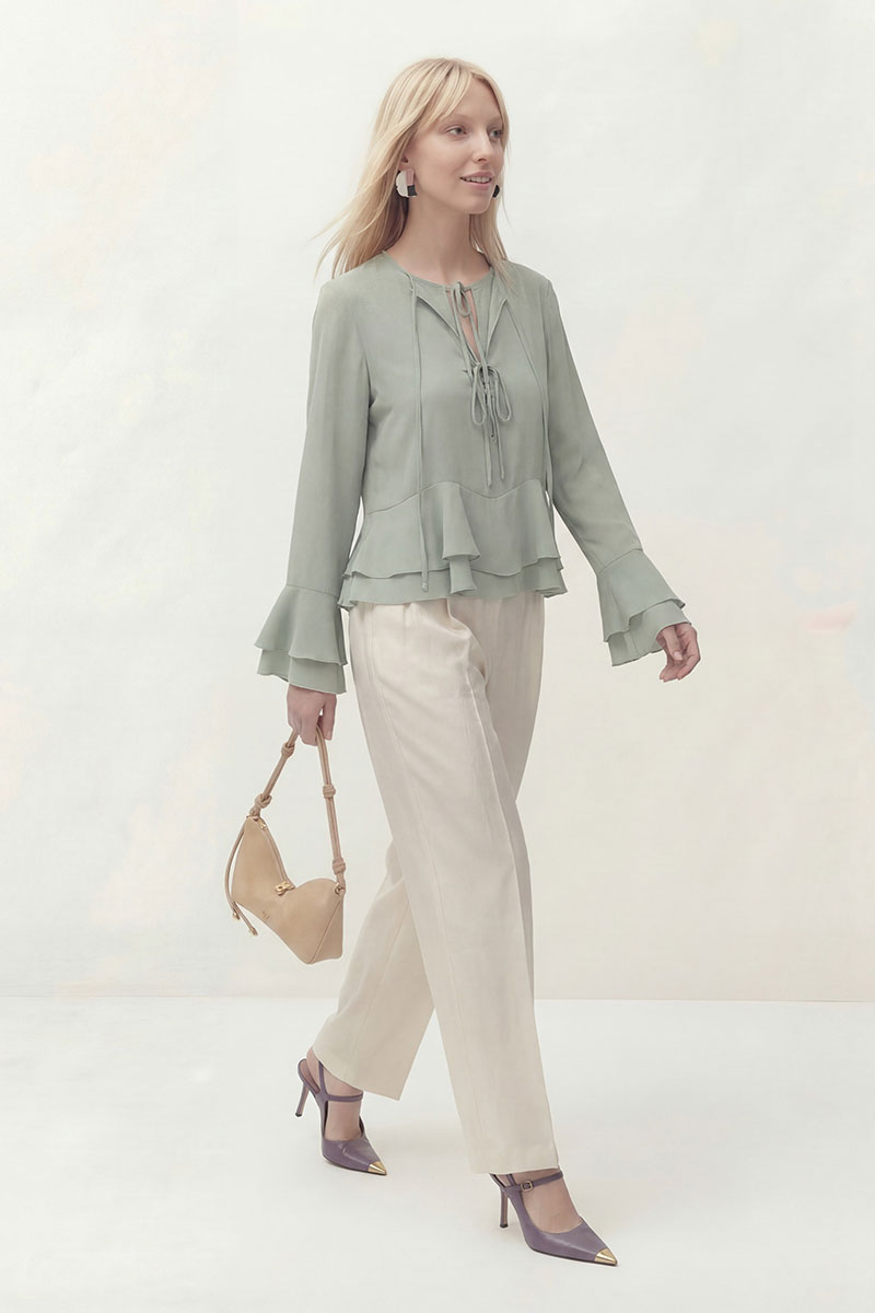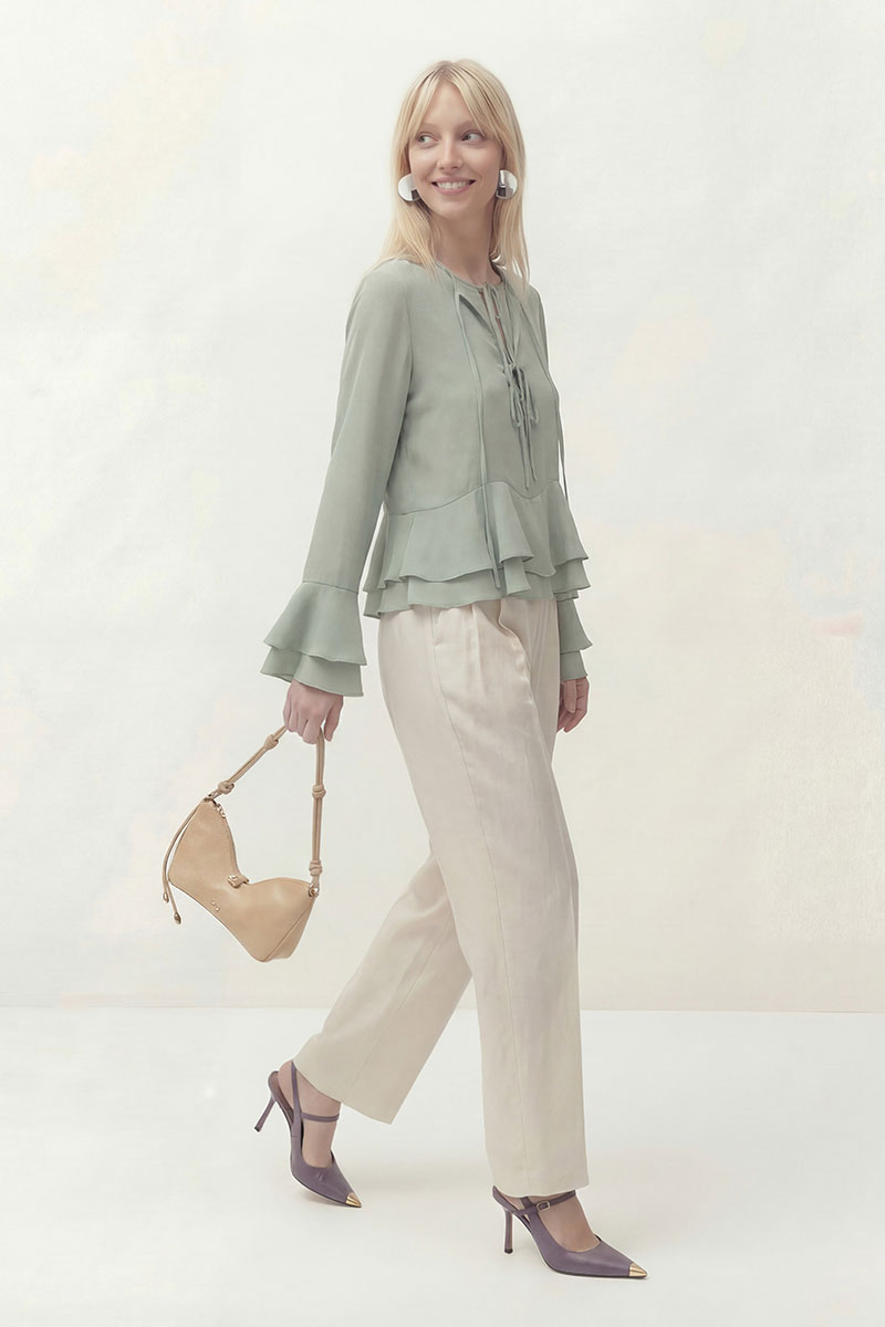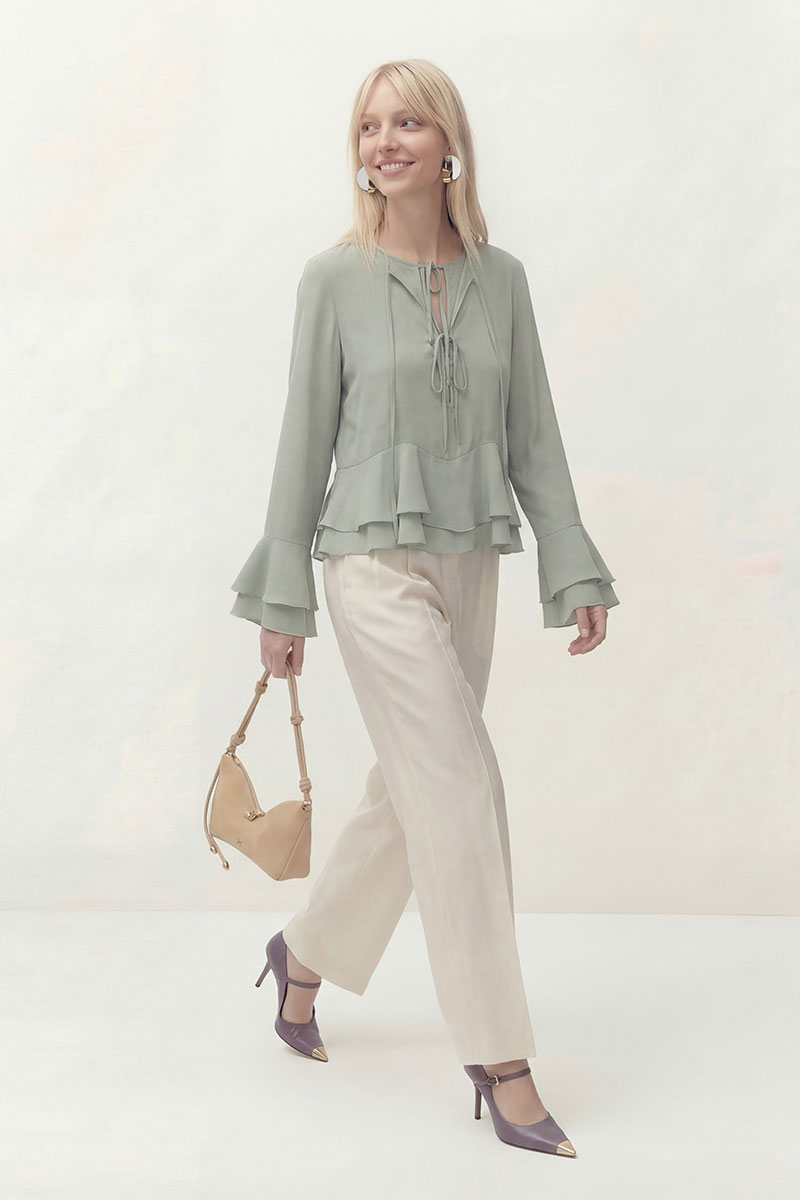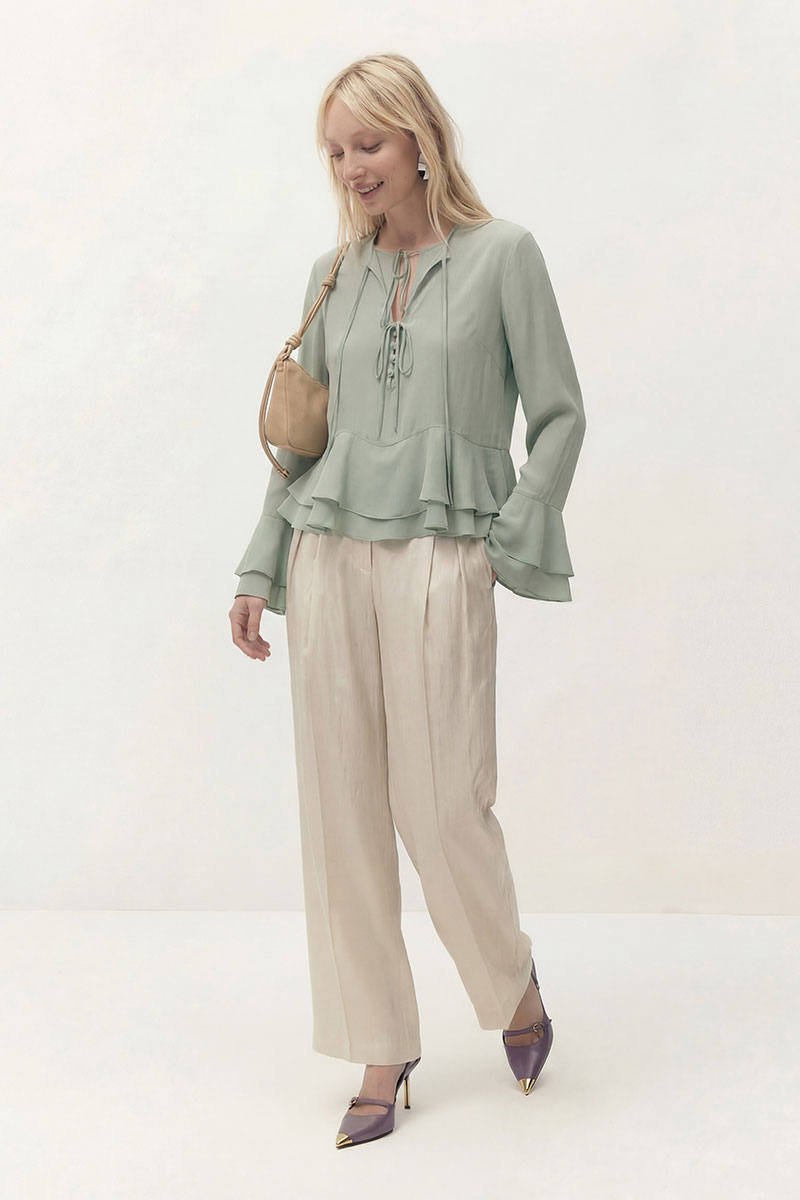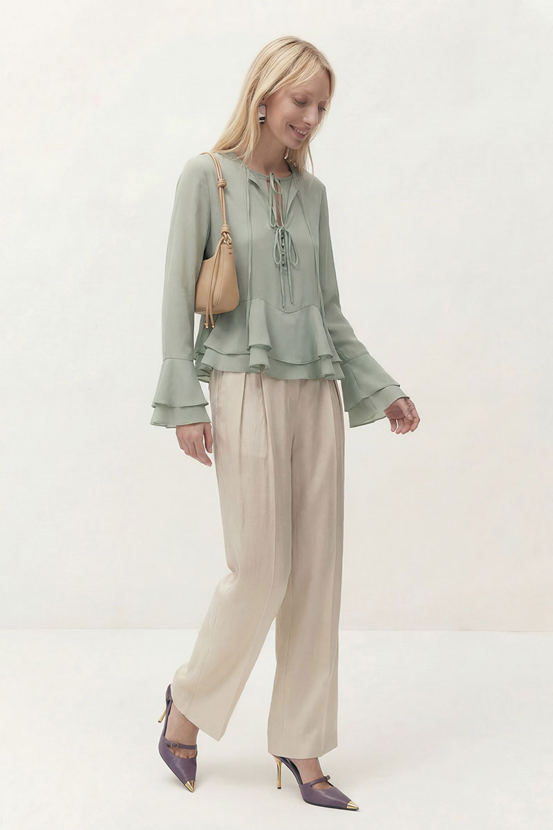 Блуза свободного кроя из шифона. Рукав втачной длинный, по низу рукава волан. Перед блузы состоит из двух слоев. Нижний слой с округлым вырезом горловины с застежкой на завязку и на навесные пуговицы и петли. Верхний, основной слой с округлым вырезом горловины на завязку и в области груди завязки. По низу воланы пришиты по переду и спинке в волнообразный подрез.