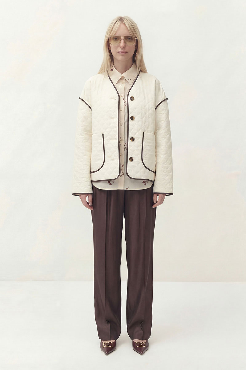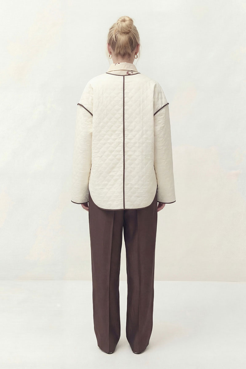 Куртка свободного кроя, облегченная, без подкладки и синтепона. Линия плеча спущена, рукав длинный. V-образный вырез горловины. Застежка однобортная на петли и пуговицы. По бокам накладные карманы. По спинке средний шов. Шов втачивания рукава, низ рукава, горловина, борт, карман, средний шов спинки обработан окантовкой из отделочной ткани.