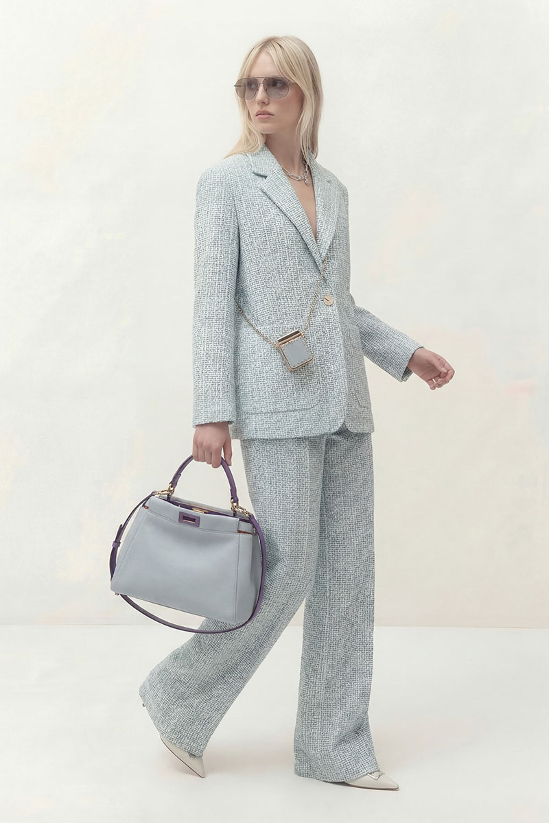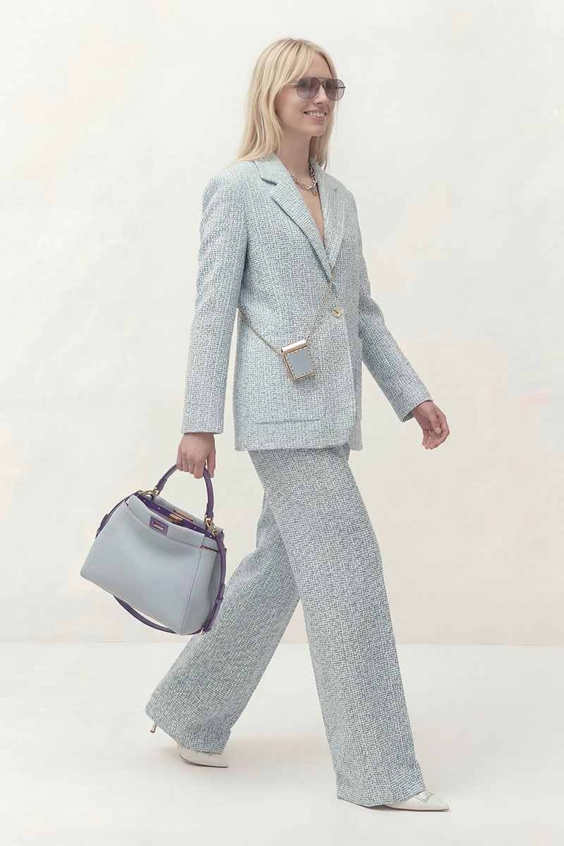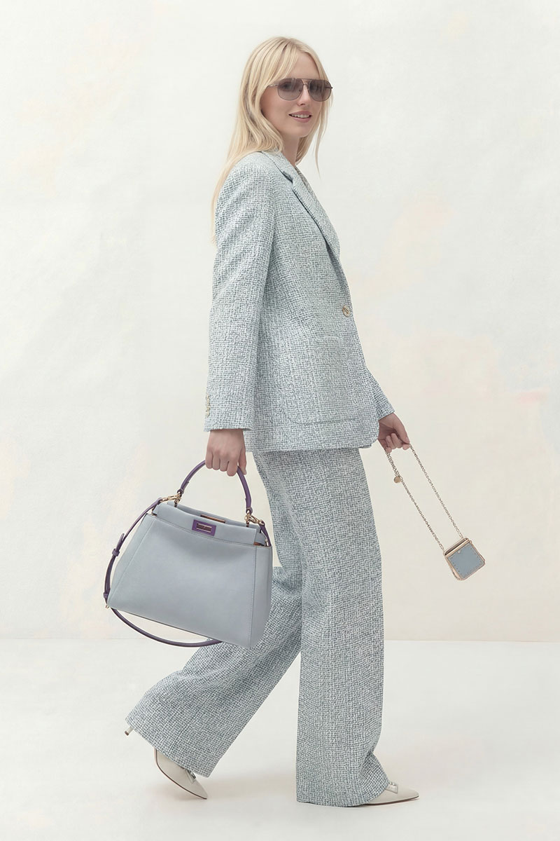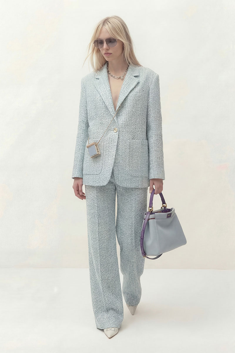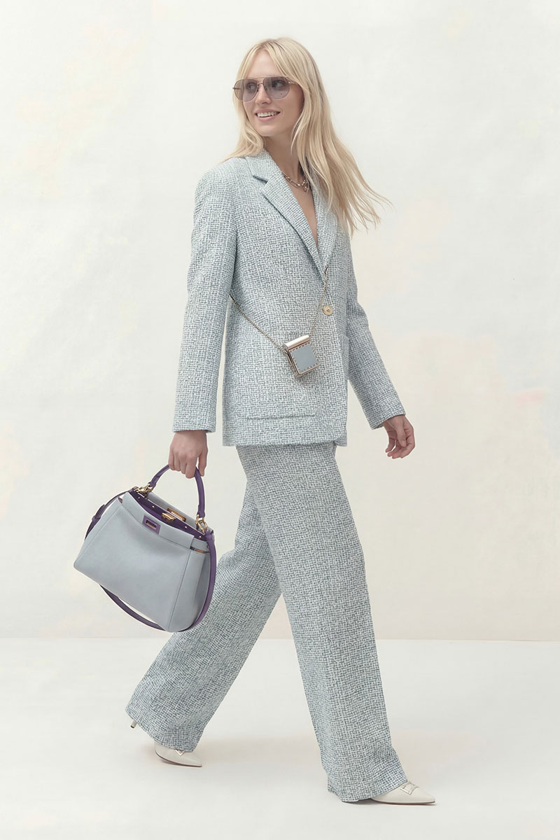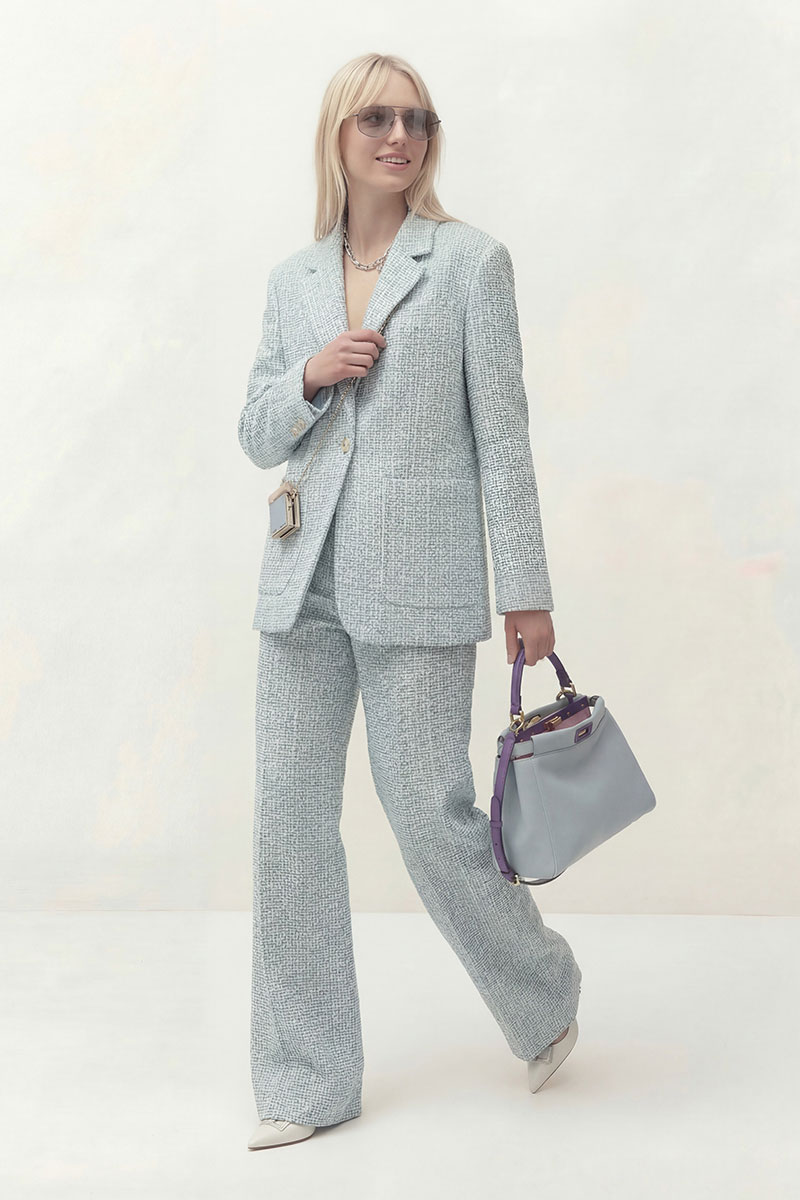 Брюки прямого силуэта с завышенной линией талии и цельнокроеным поясом, по бокам прорезные карманы. Застёжка на задней половине брюк по линии сидения. По переду брюк от линии пояса вертикальные защипы.