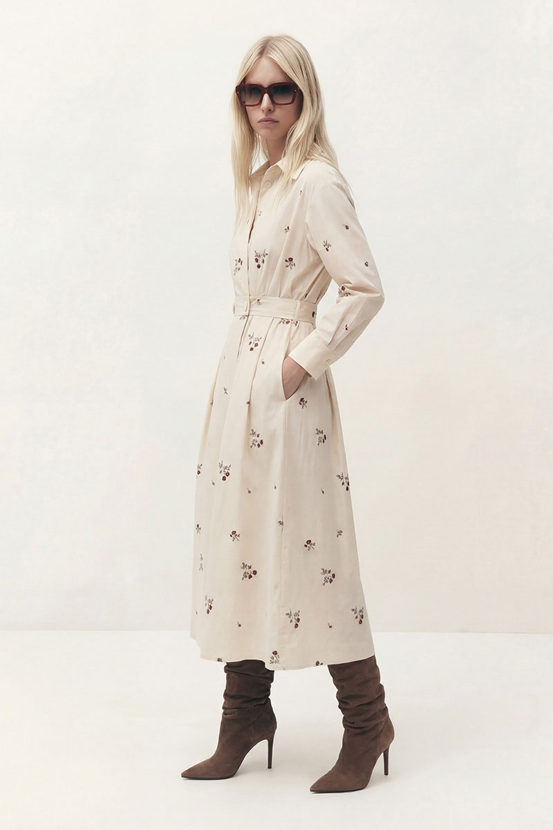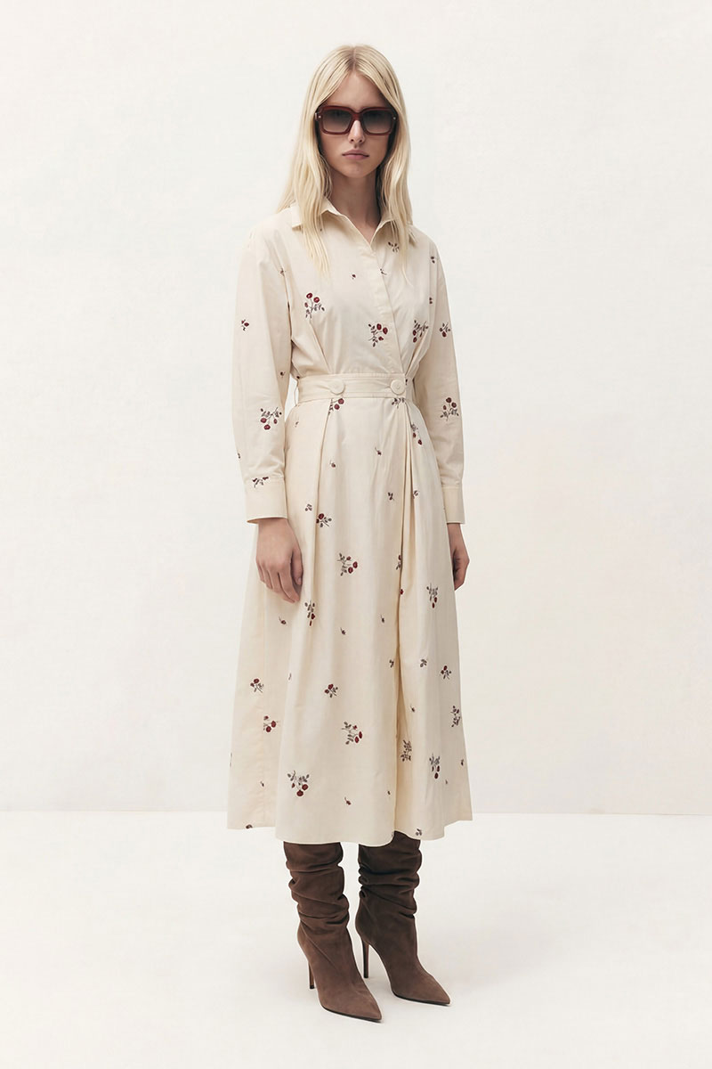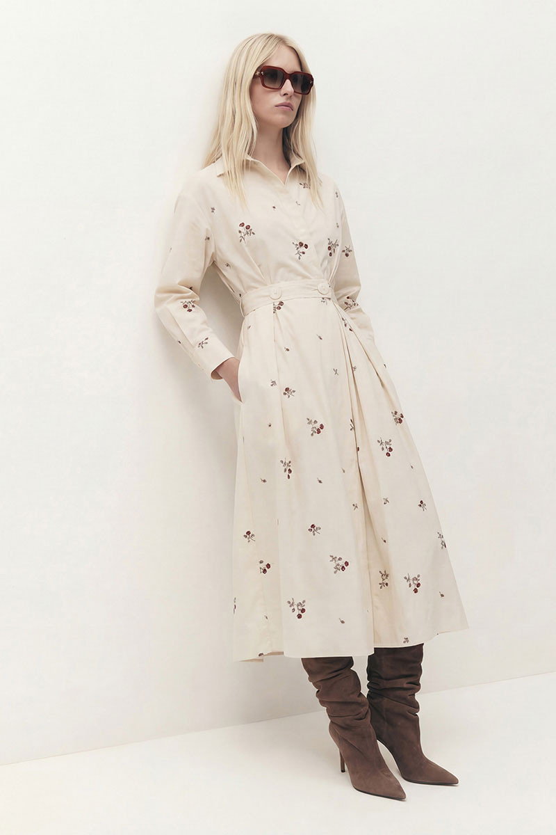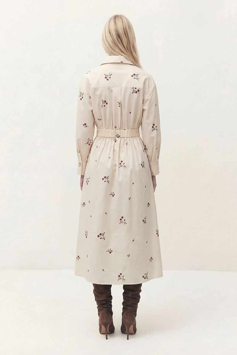 Платье свободного кроя отрезное по линии талии. Рукав спущенный со складками в верхней части, с манжетой по низу. Воротник рубашечного кроя, застёжка на запах, двубортная на петлю и пуговицу. В боковых швах карманы. По спинке отрезная кокетка, по линии талии широкая резинка.