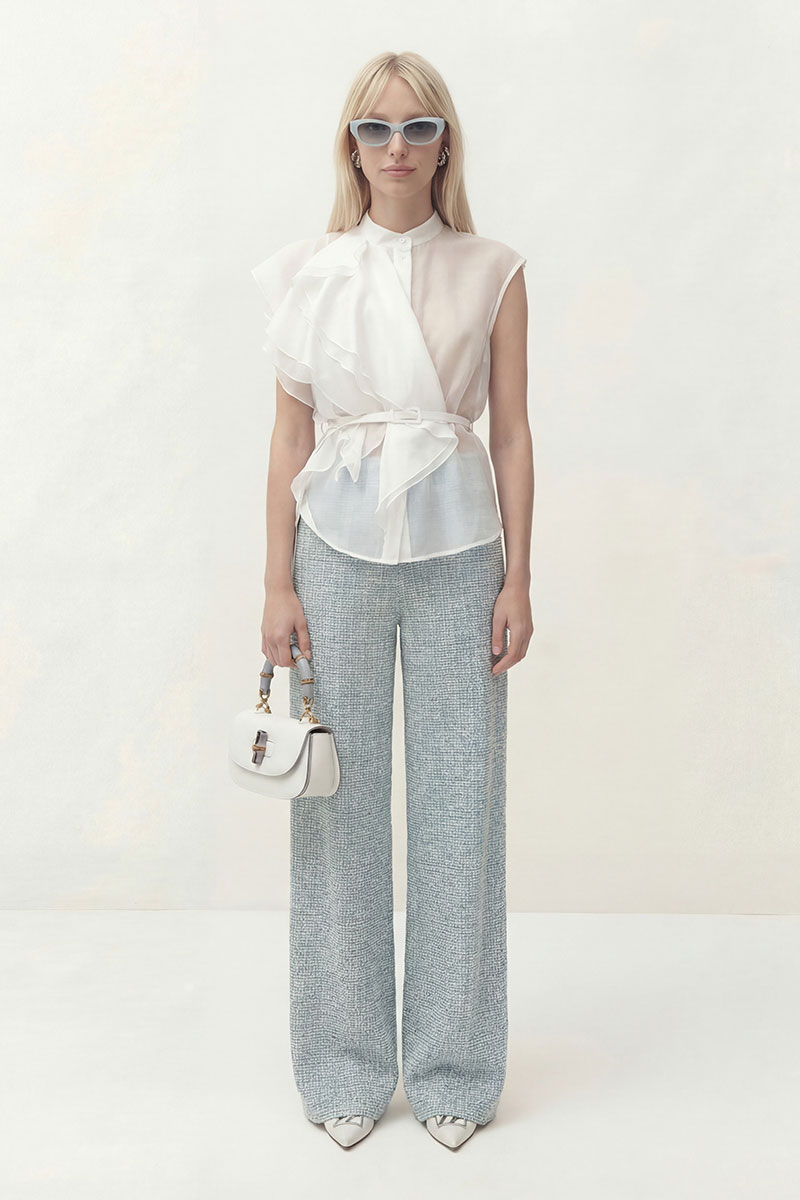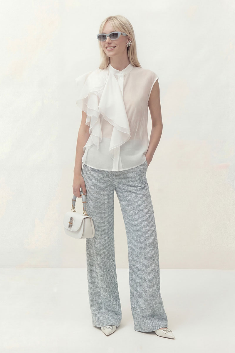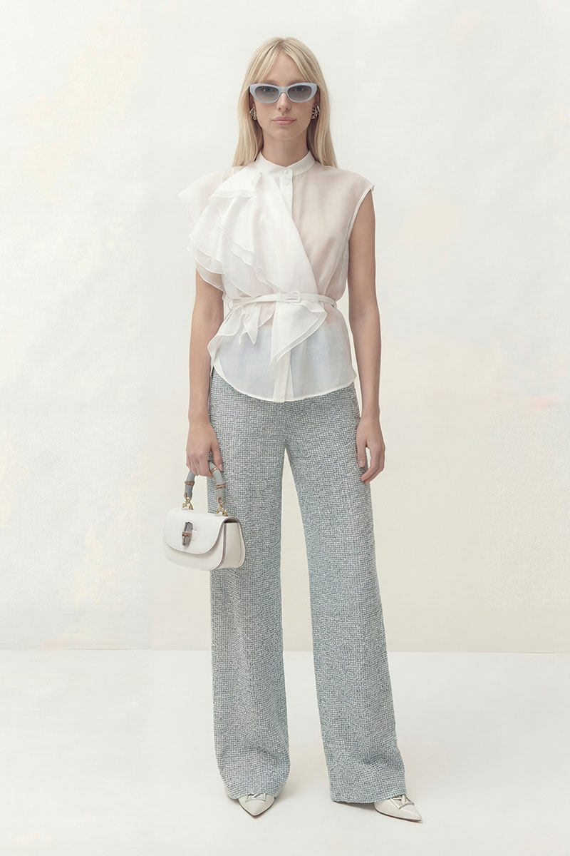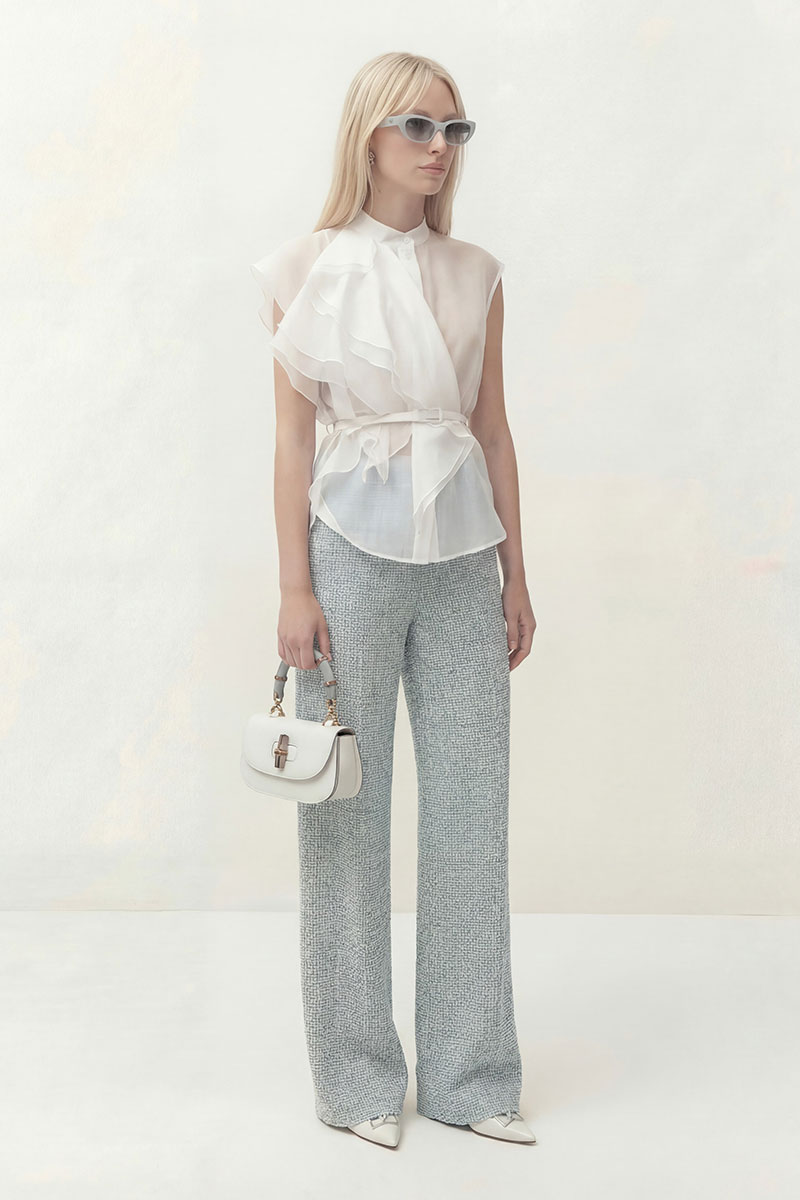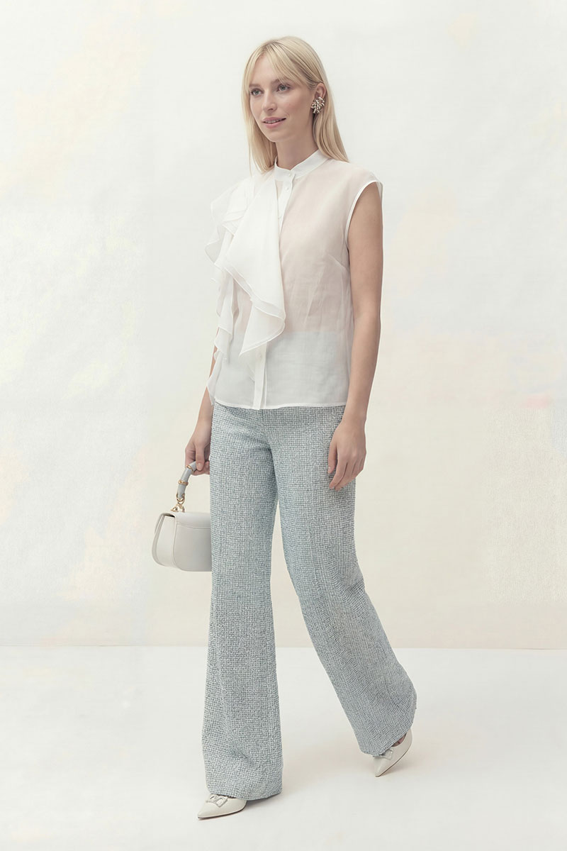 Блуза прямого силуэта, по горловине воротник-стойка. Центральная застежка на петли и пуговицы. На левой стороне блузы настрочные воланы.