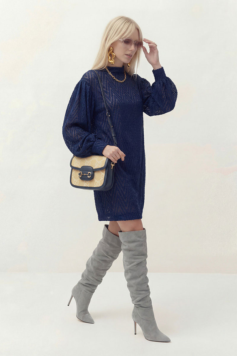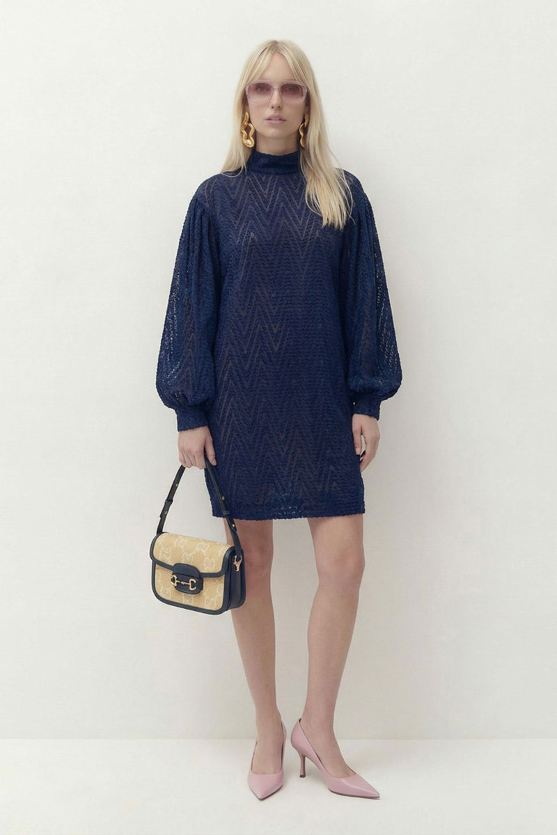 Платье силуэта «кокон». Имеет спущенную линию плеча, рукав длинный со сборкой по плечу и с манжетой по низу. В среднем шве спинки застежка на навесные петли-пуговицы. Воротник-стойка. Имеет второе платье-комбинацию на бретелях.