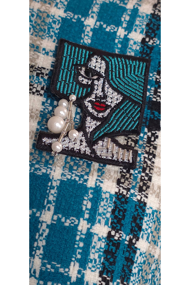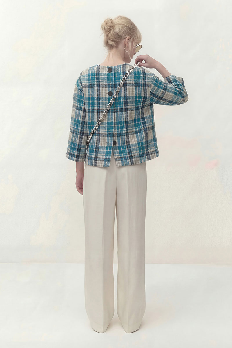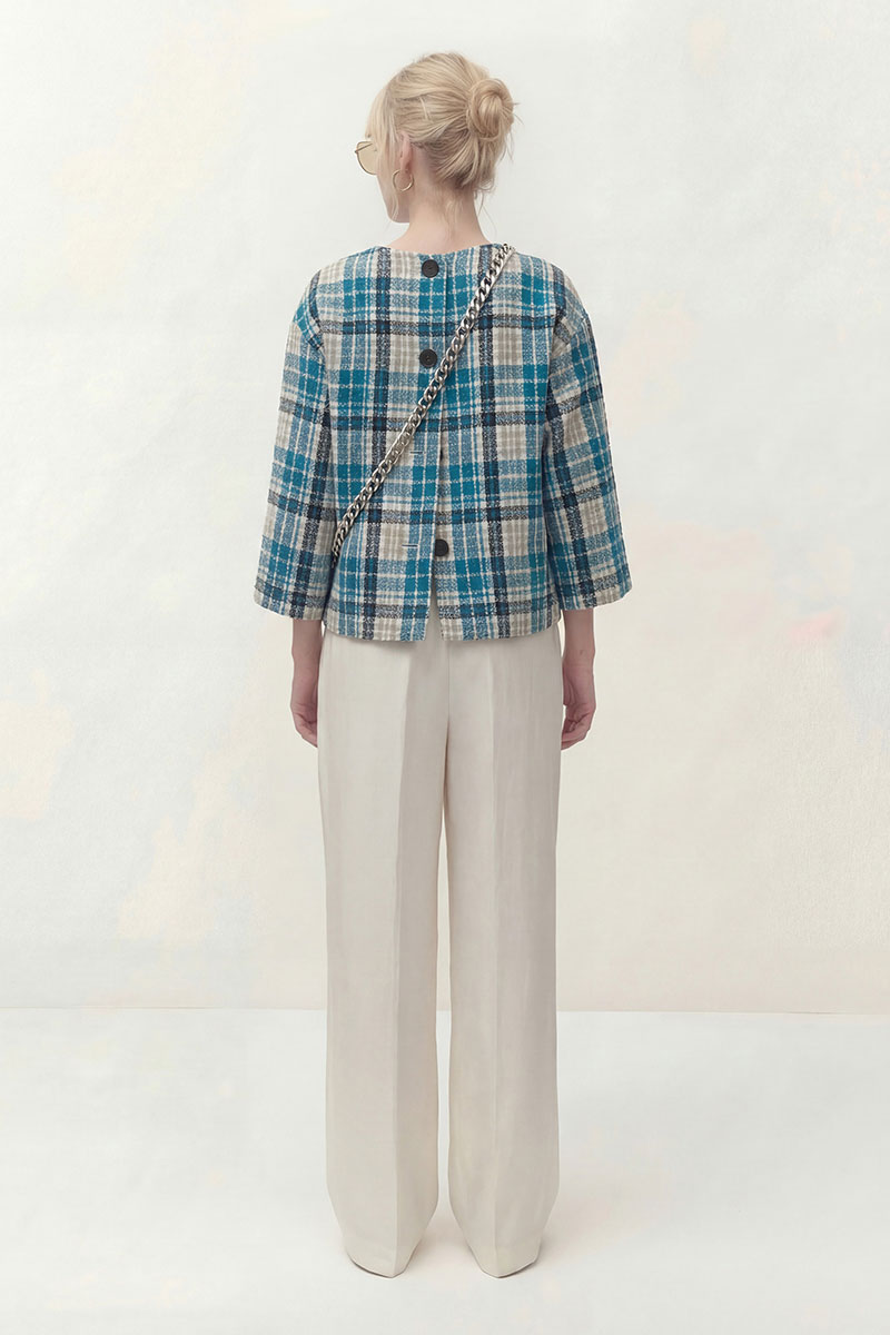 Топ выполнен из текстильной ткани дизайн клетка, на трикотажной подкладке. Линия плеча спущена, рукав укороченный 3/4. По переду округлый вырез горловины. По спинке застёжка на петли и пуговицы. В комплект входит брошь ручной работы.