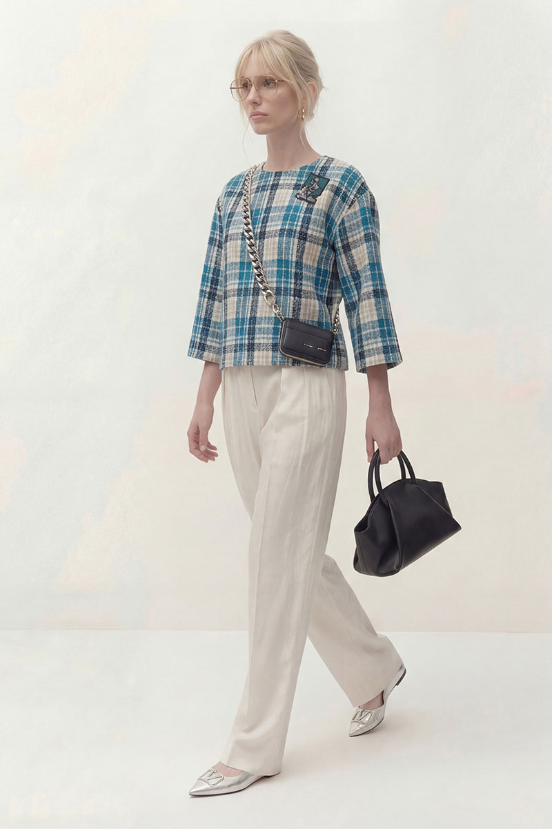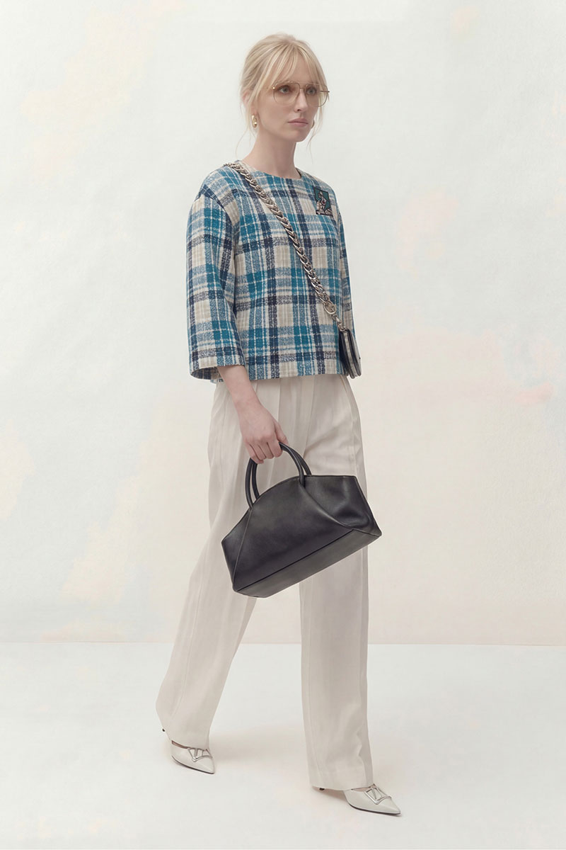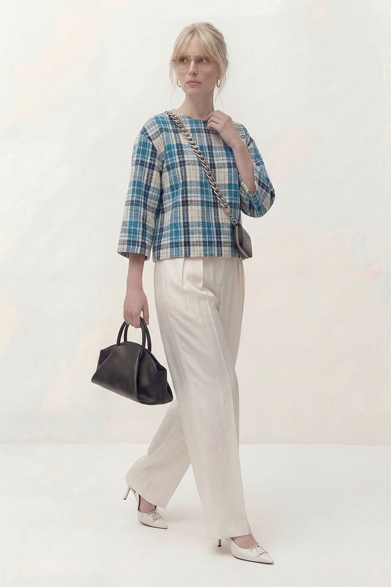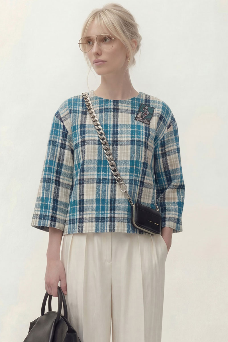 Топ выполнен из текстильной ткани дизайн клетка, на трикотажной подкладке. Линия плеча спущена, рукав укороченный 3/4. По переду округлый вырез горловины. По спинке застёжка на петли и пуговицы. В комплект входит брошь ручной работы.