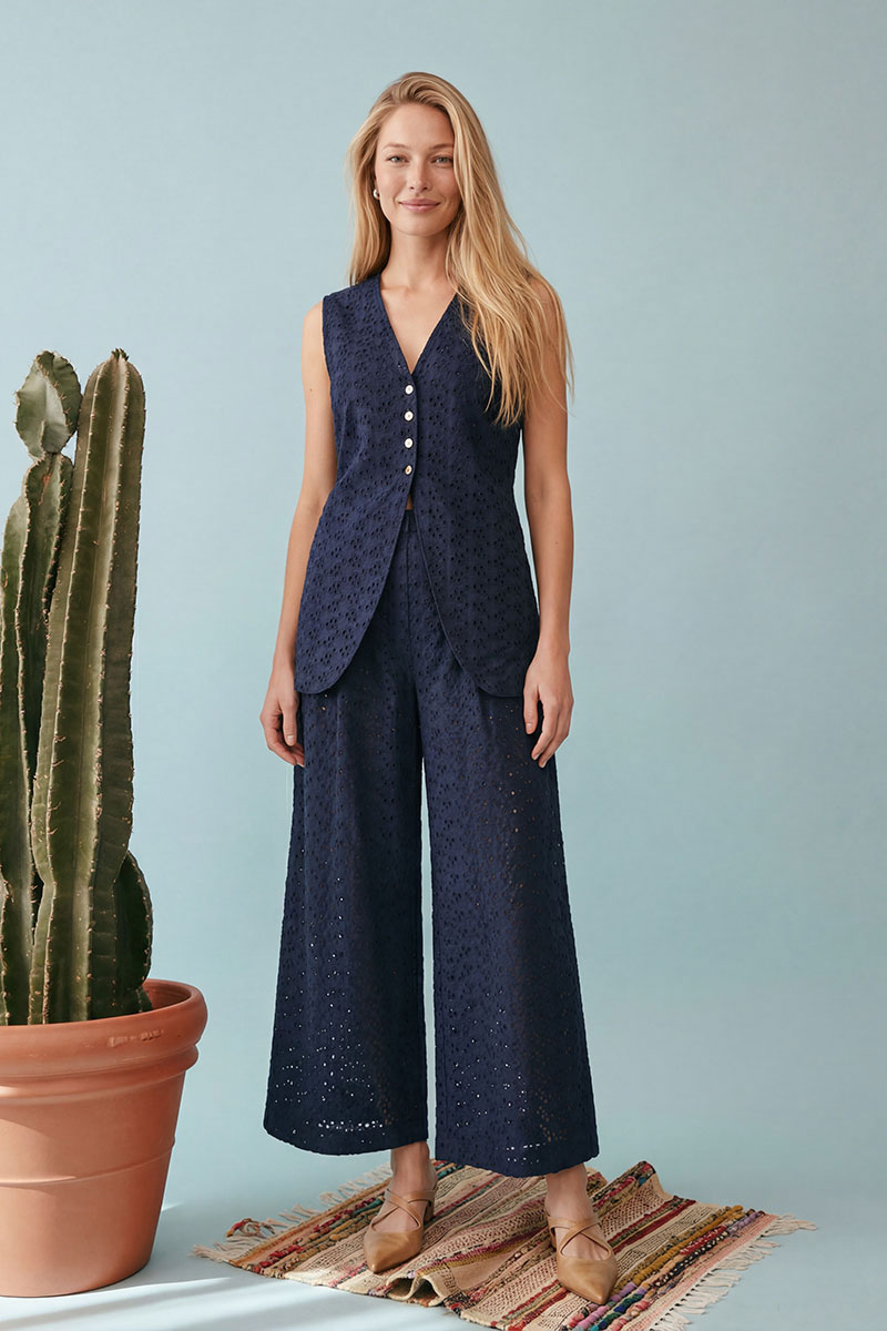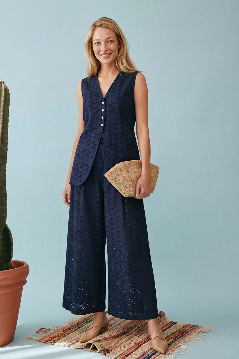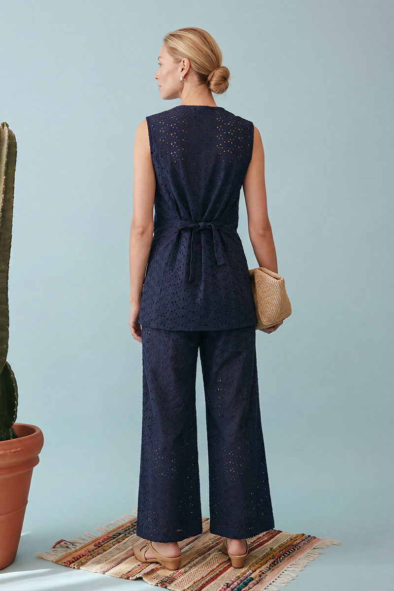 хлопкового полотна с вышивкой ришелье (английское шитье) насыщенного темно-синего цвета. Жилет полуприлегающего силуэт, удлиненный, закрывающий линию бедер на подкладке. Застежка