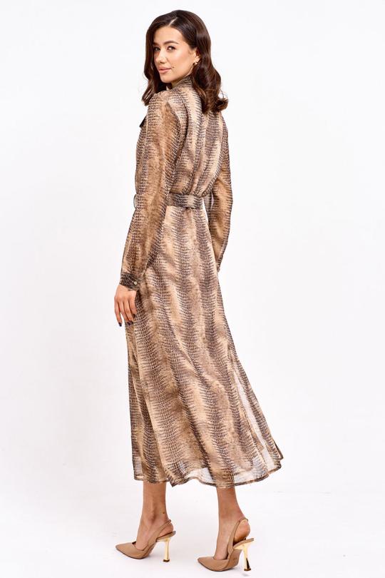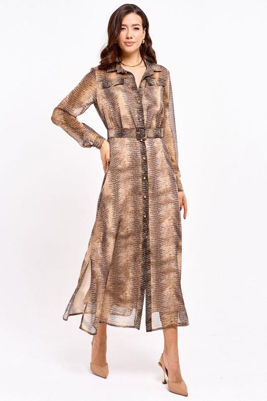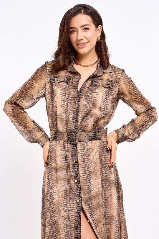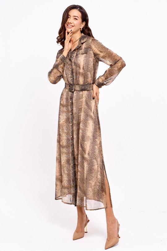 Платье полуприлегающего силуэта из шифоновой ткани. Воротник на стойке рубашечного типа с застежкой по центру на петли и пуговицы. Рукав втачной длинный, по низу застежка на петлю и пуговицу. Платье отрезное на линии талии. По переду и спинке по низу лифа сборка. По переду от плеча кокетка и декоративные клапаны с пуговицами. По низу в боковом шве длинные разрезы. Платье частично на подкладке. В комплект входит съемный ремень. Обращаем ваше внимание, что фурнитура может незначительно отличаться от фото.