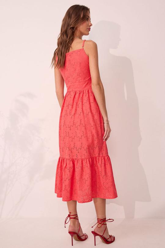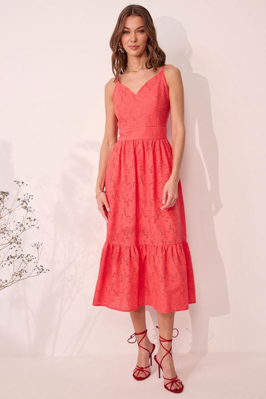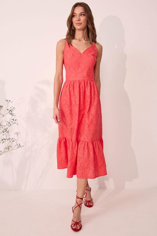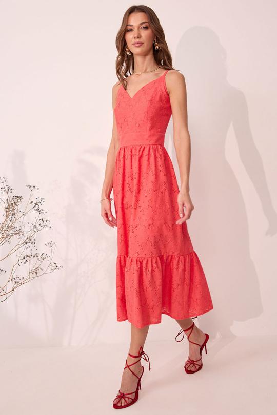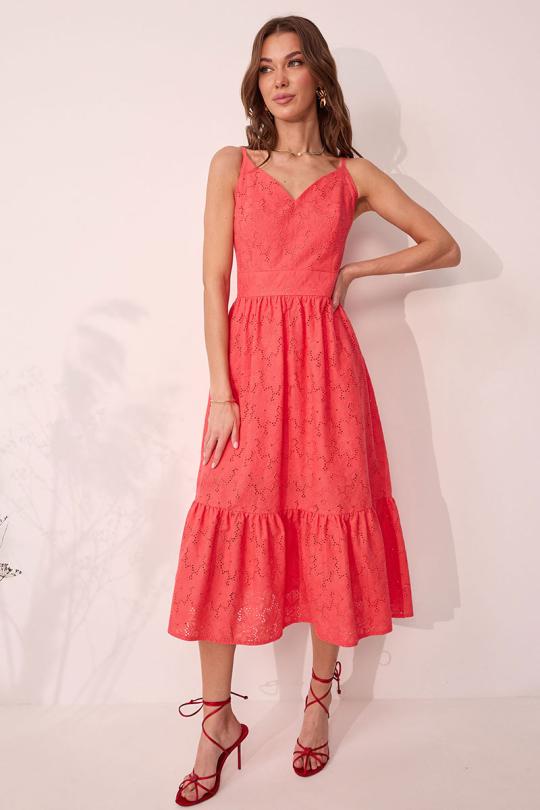 Платье на бретелях полуприлегающего силуэта из ришелье. По переду и спинке притачной пояс. На лифе переда нагрудные вытачки, на спинке – талиевые. Нижняя часть платья со сборкой по линии притачивания с поясом. В боковом шве потайная молния.