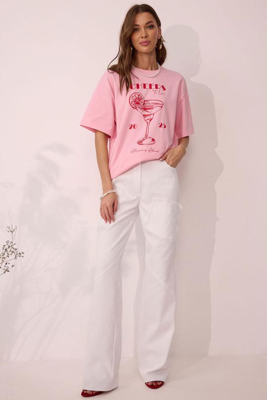 Джемпер женский свободного силуэта из комфортного трикотажного полотна, длиной до линии бедер. Горловина округлая. Рукав со спущенной линией плеча длиной до локтя. По переду расположена дизайнерская печать.