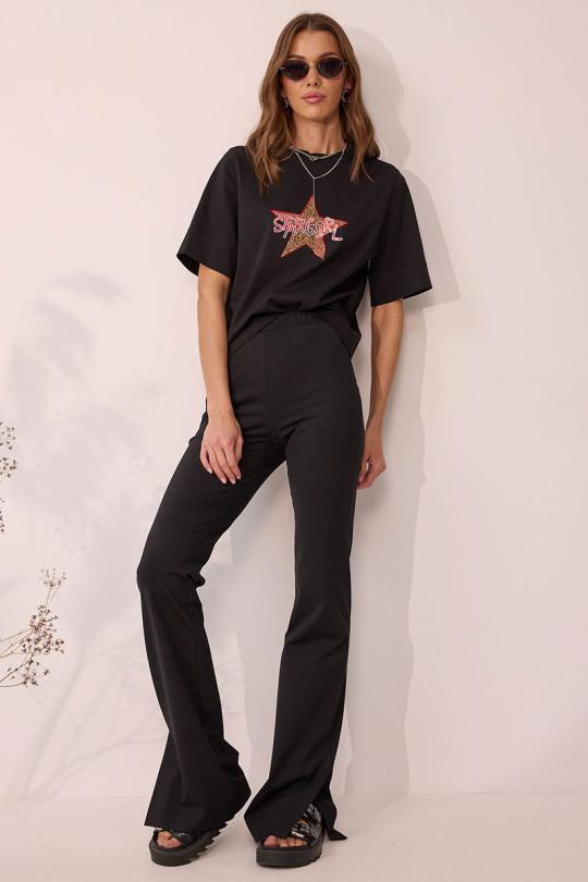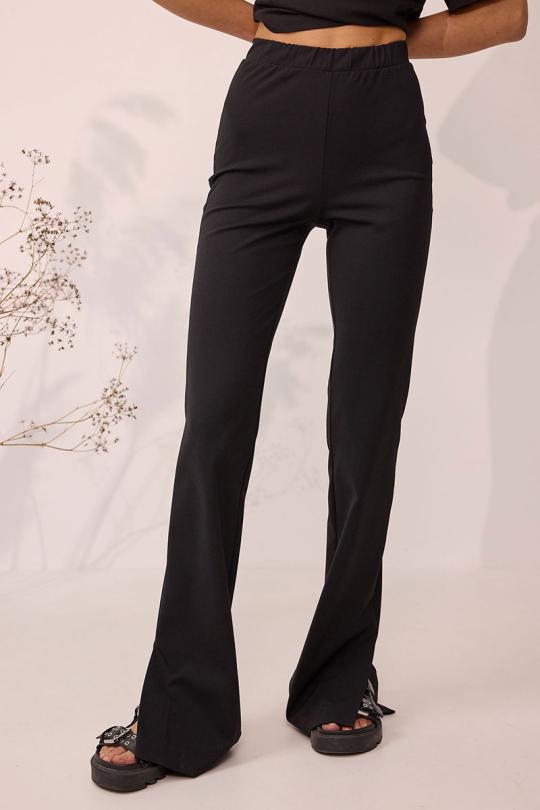 Брюки прилегающего силуэта расширенные книзу из трикотажного полотна. По верху брюк притачной пояс на эластичной тесьме(резинке). По низу брюк в боковом шве шлица.