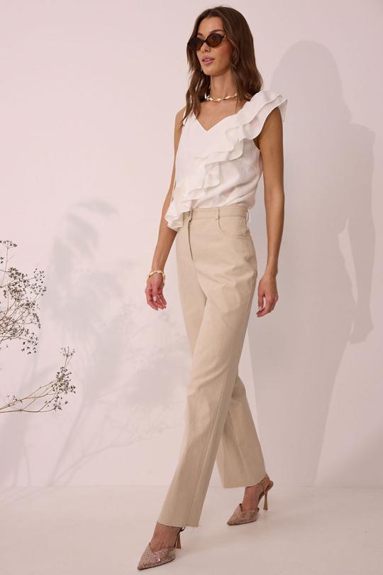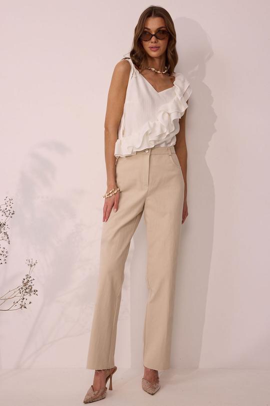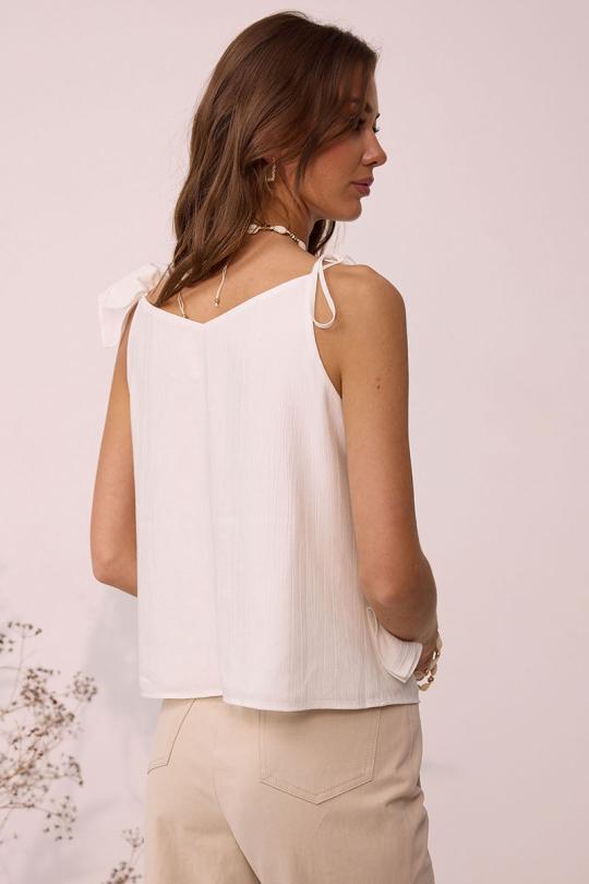 Блузка на бретельках прямого силуэта из струящейся ткани. Волан по переду переходящий на спинку. Одна бретель фиксированной длины, другая регулируется (на завязки).