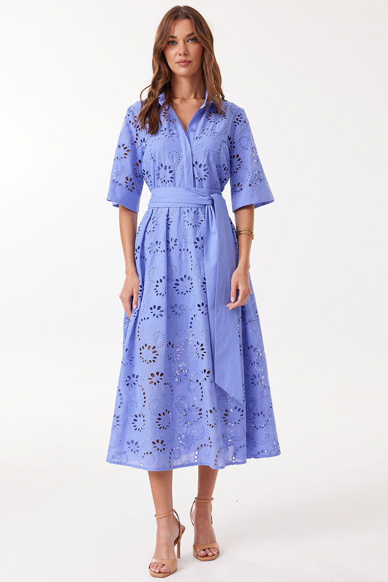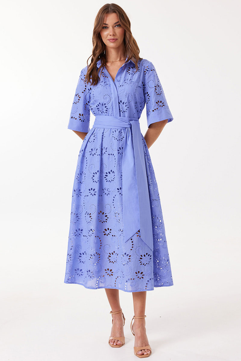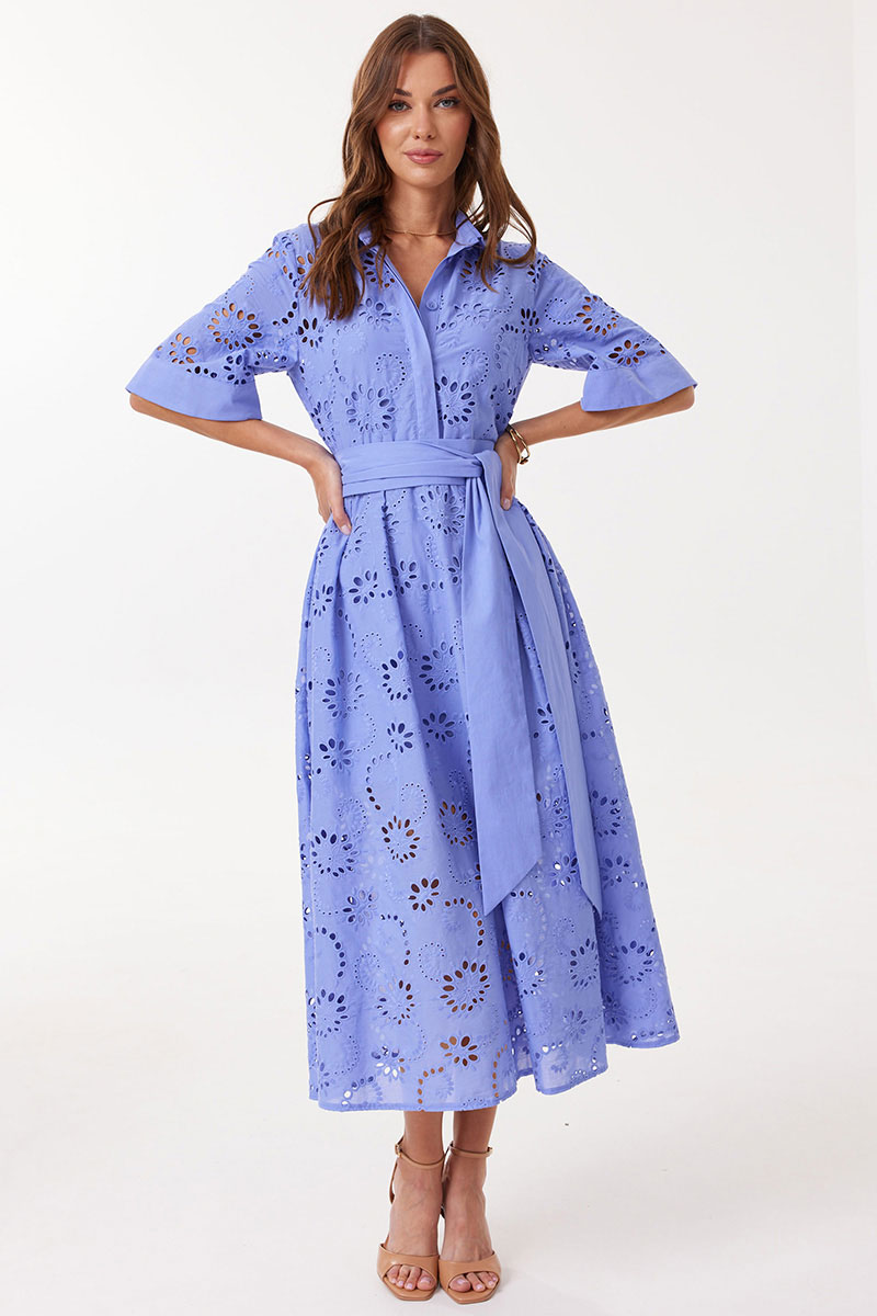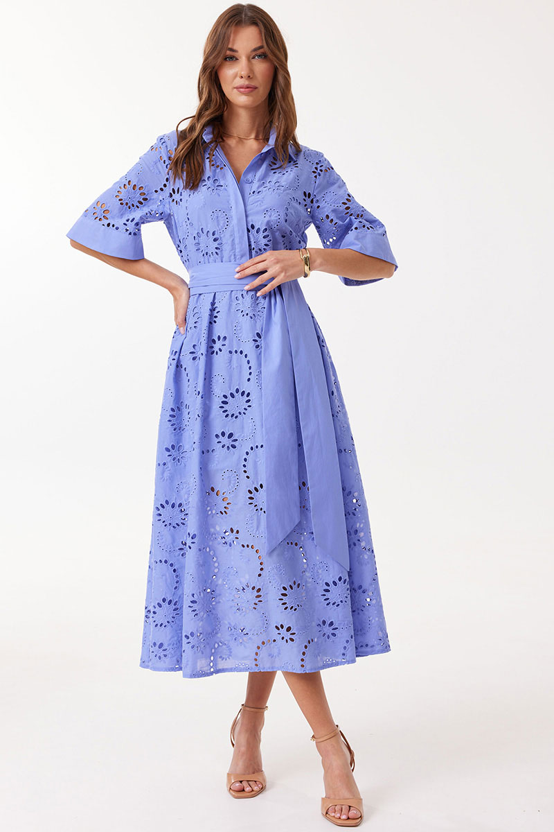 Платье прямого силуэта расширенное книзу из ришелье. Воротник рубашечного типа с застежкой по центру на петли и пуговицы. Рукав втачной длиной до локтя, расширенный книзу. Платье отрезное по линии талии. Нижняя часть платья со складками по линии притачивания с лифом. Платье частично на подкладке. В комплект входит пояс. В комплект входит платье на бретелях. Модель подойдет на рост 164-170 см.