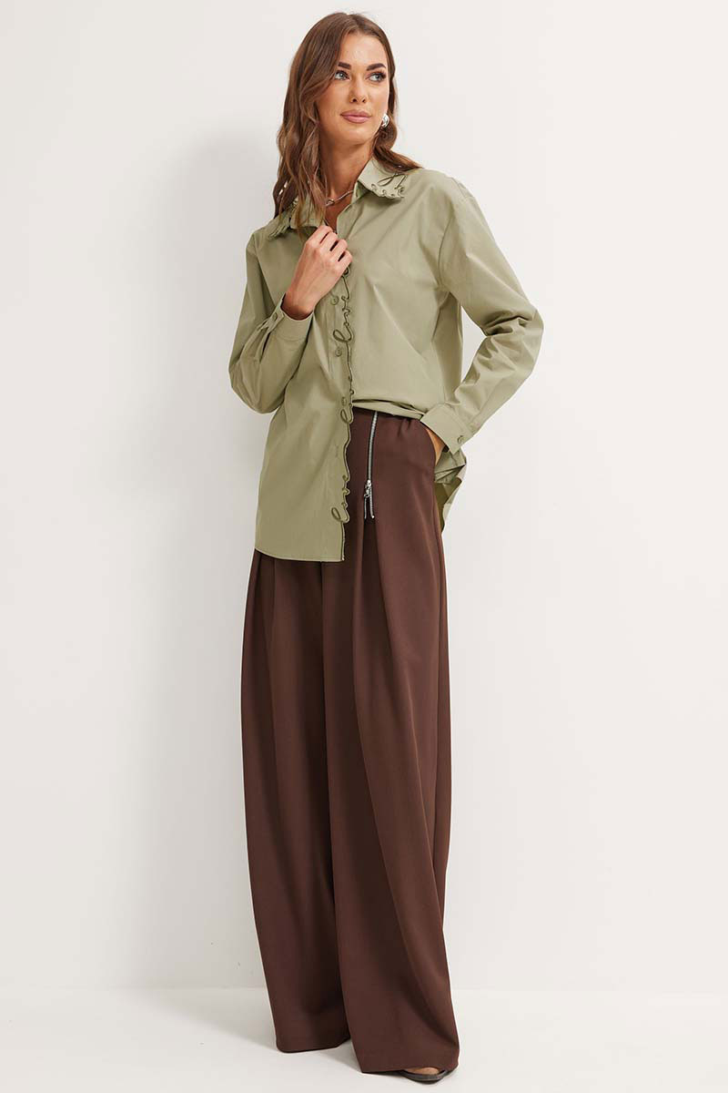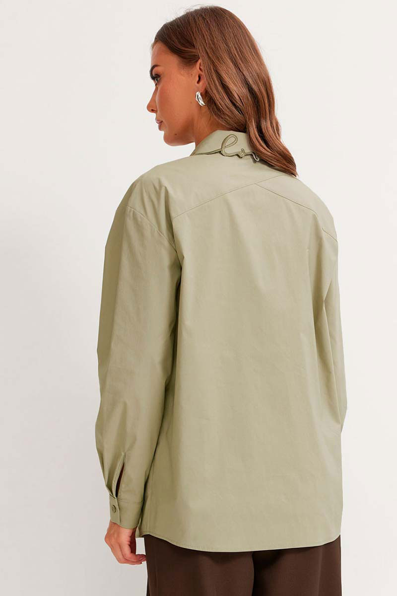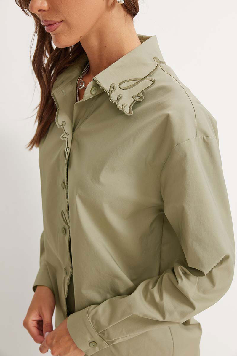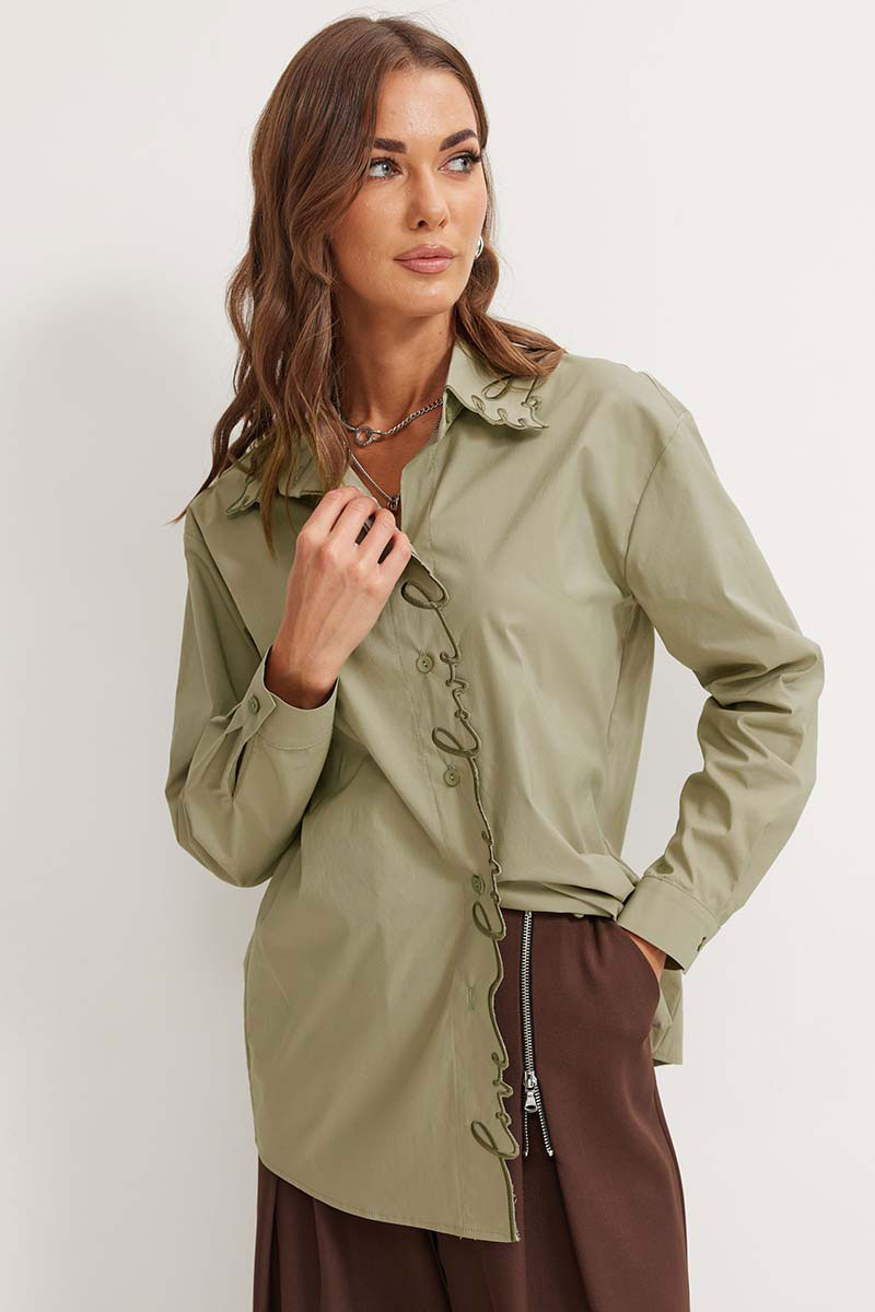 Стильная блузка прямого силуэта из хлопковой ткани с фигурным низом. Воротник на стойке с застежкой по центру на петли и пуговицы. Рукав со спущенной линией плеча, по низу манжета с застежкой на петлю и пуговицу. На спинке фигурная кокетка. По переду на планке и на воротнике - дизайнерская вышивка.