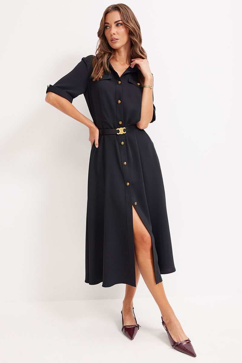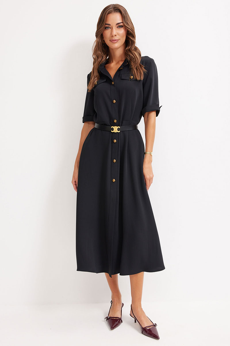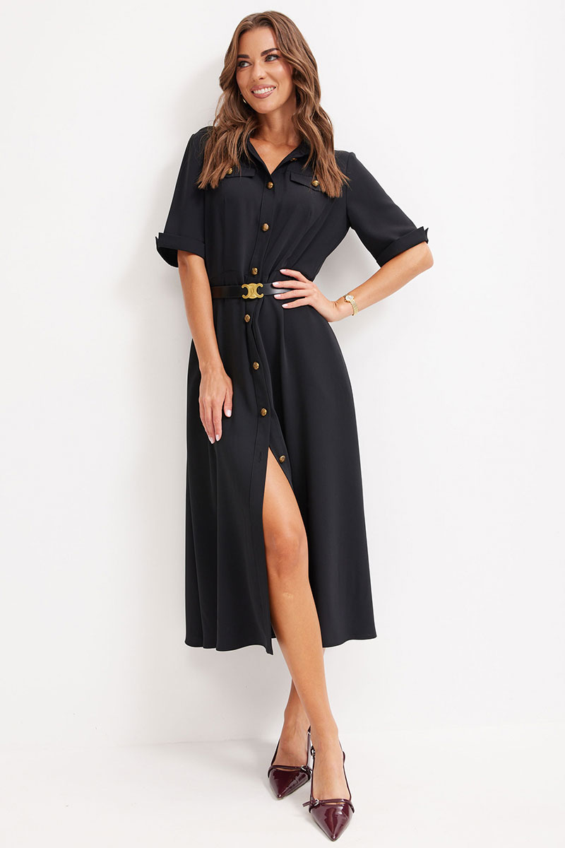 Платье из струящейся ткани, полуприлегающего силуэта. Воротник стояче-отложной с застежкой по центру на петли и пуговицы. Рукав втачной, длиной до локтя, по низу притачной манжет с разрезом. Платье отрезное по линии талии. По переду и спинке талиевые вытачки. В верхней части переда кокетки расположены декоративные клапаны. В комплект входит ремень. Обращаем ваше внимание, что фурнитура может отличаться от фото.