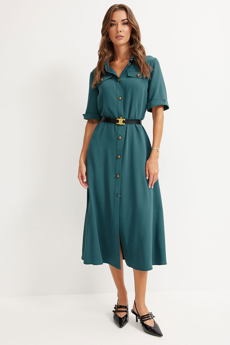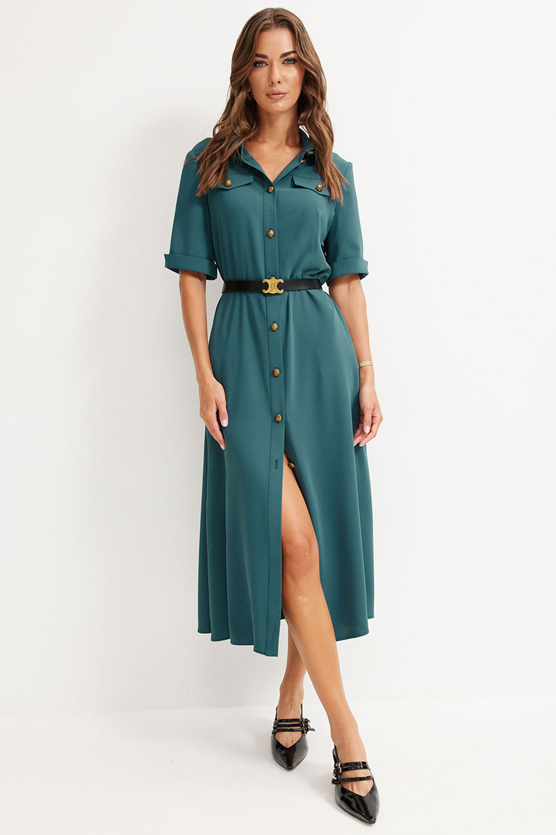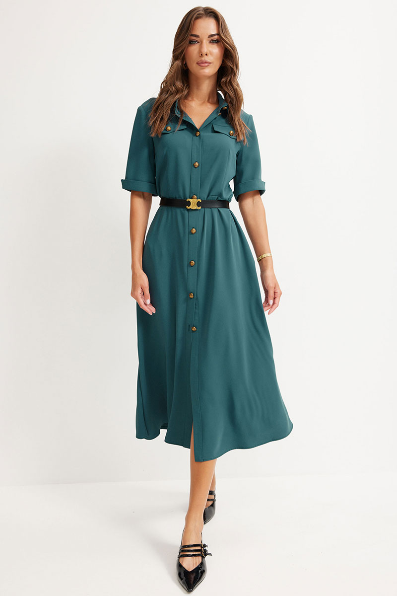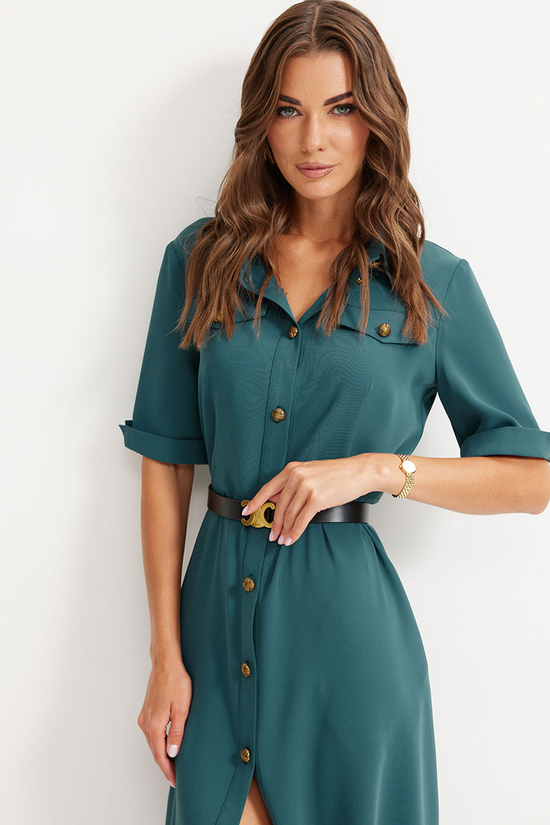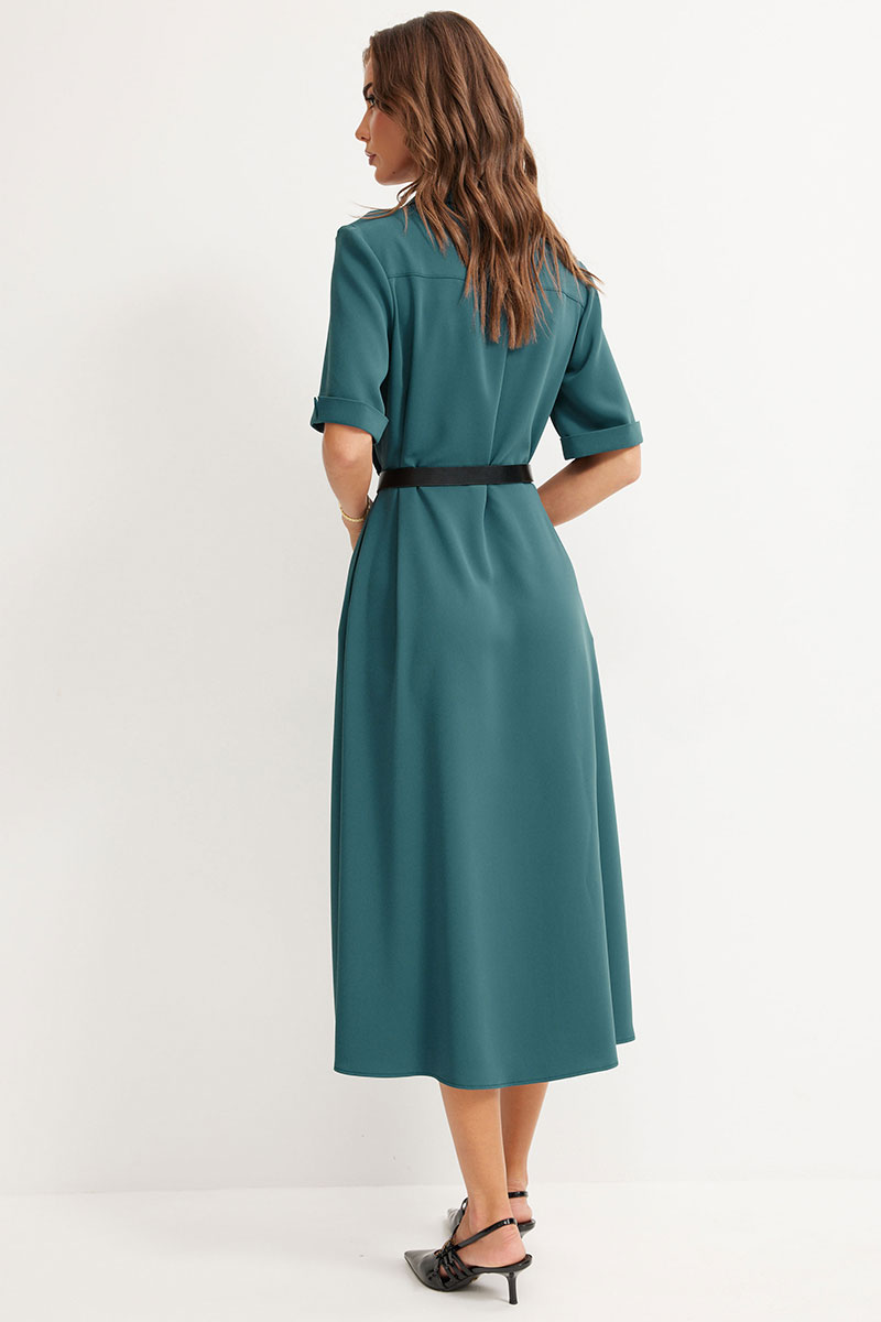 Платье из струящейся ткани, полуприлегающего силуэта. Воротник стояче-отложной с застежкой по центру на петли и пуговицы. Рукав втачной, длиной до локтя, по низу притачной манжет с разрезом. Платье отрезное по линии талии. По переду и спинке талиевые вытачки. В верхней части переда кокетки расположены декоративные клапаны. В комплект входит ремень. Обращаем ваше внимание, что фурнитура может отличаться от фото.