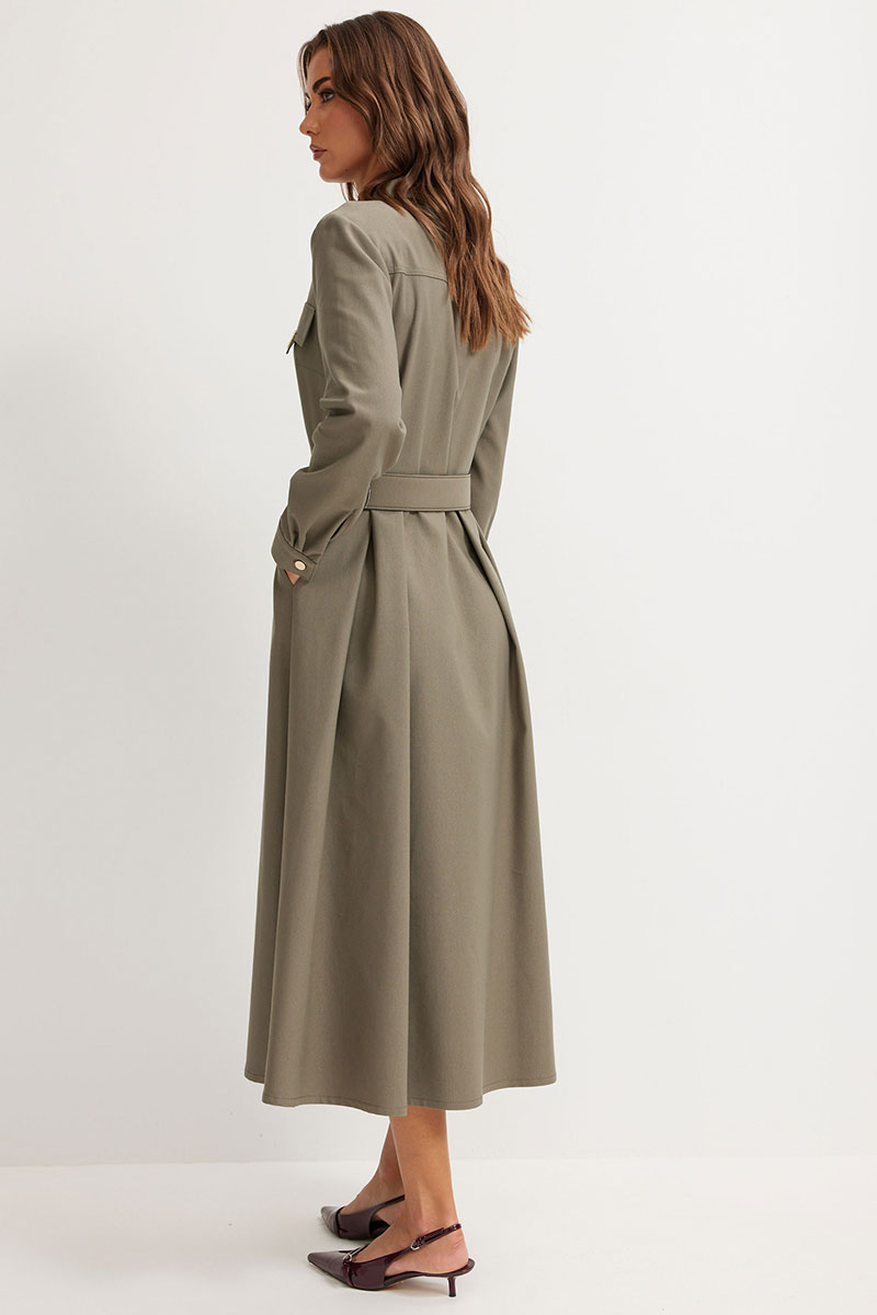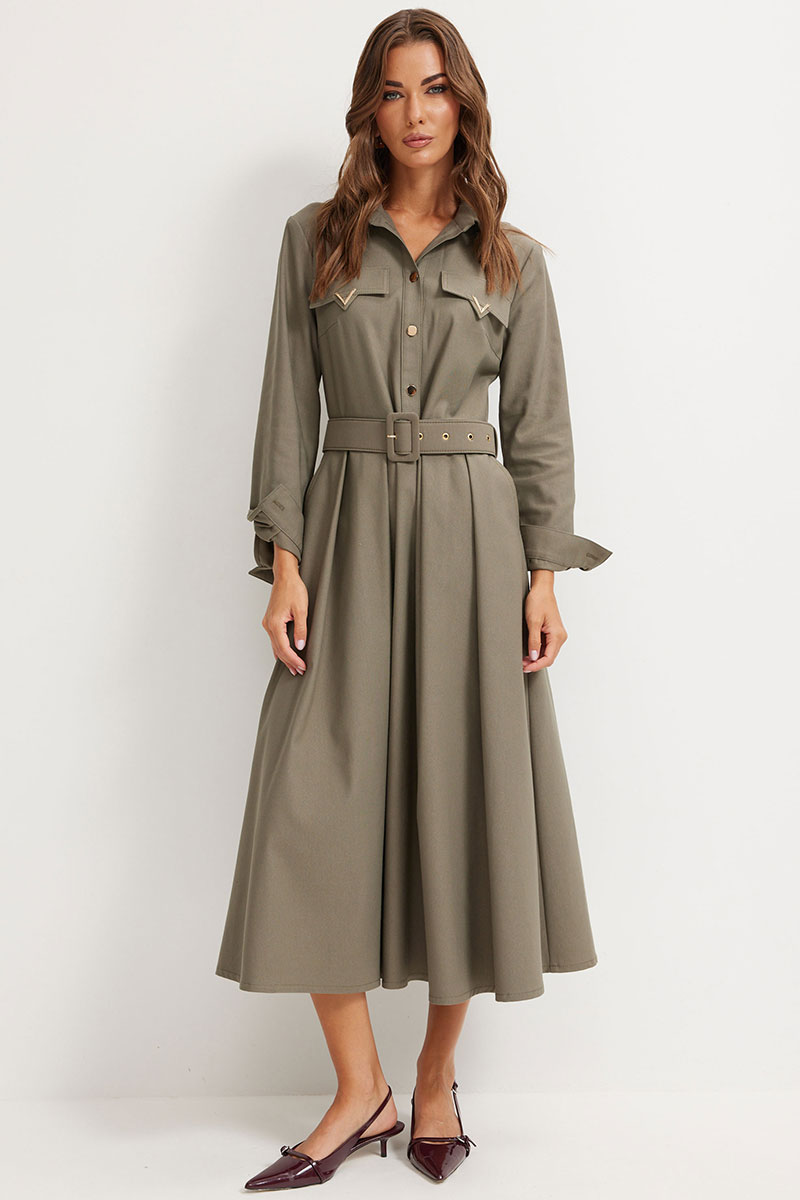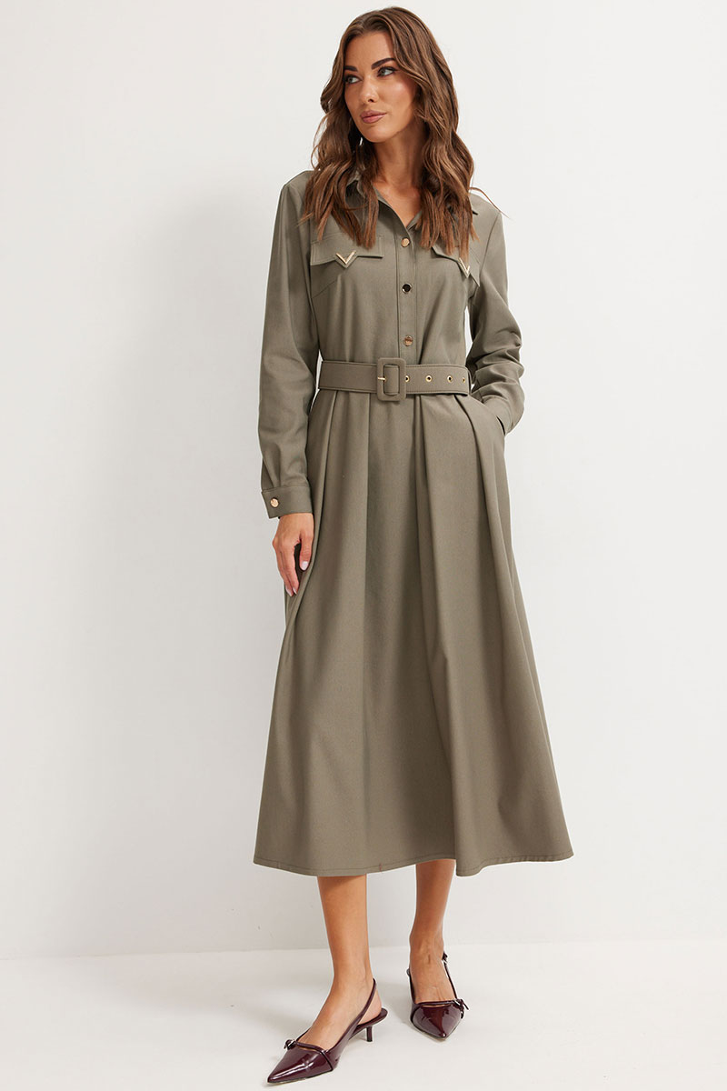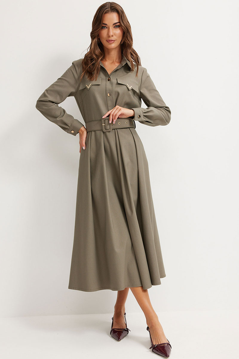 Платье прямого силуэта расширенное к низу из плательной ткани. Воротник рубашечного типа с застежкой по центру на петли и пуговицы. Платье отрезное по линии талии. От подреза на талии вниз заложены декоративные складки. В боковых швах карманы. По переду на лифе нагрудные вытачки и декоративные клапаны. В комплект входит пояс из основной ткани. Обращаем ваше внимание, что фурнитура может отличаться от фото.