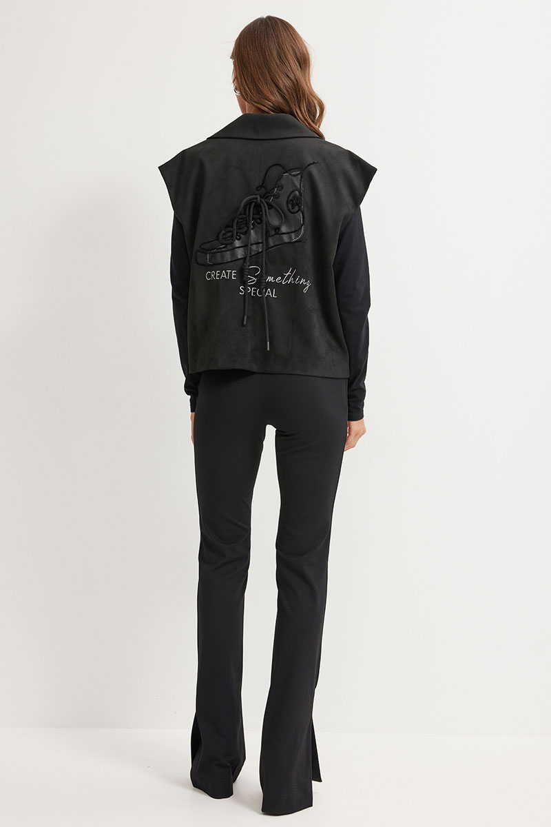 Жилет прямого силуэта из костюмной ткани комбинированной экозамшей. Воротник пиджачного типа с двубортной застежкой. Рукав цельнокроеный. По переду функциональные карманы с листочкой. На спинке дизайнерская вышивка. Жилет на подкладке. Обращаем ваше внимание, что фурнитура может отличаться от фото.