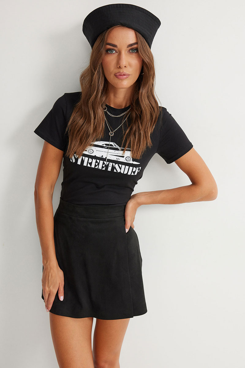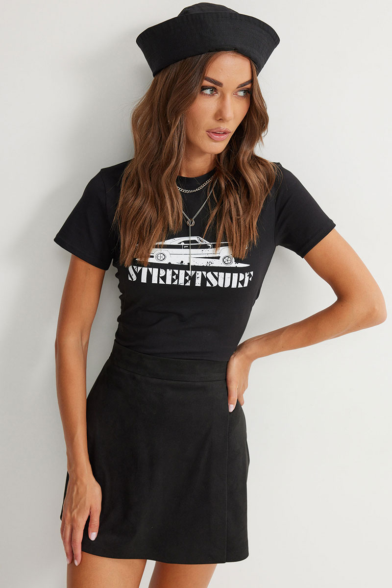 Джемпер укороченный прилегающего силуэта из трикотажного полотна. Горловина округлая. Рукав втачной короткий. По переду дизайнерский принт.