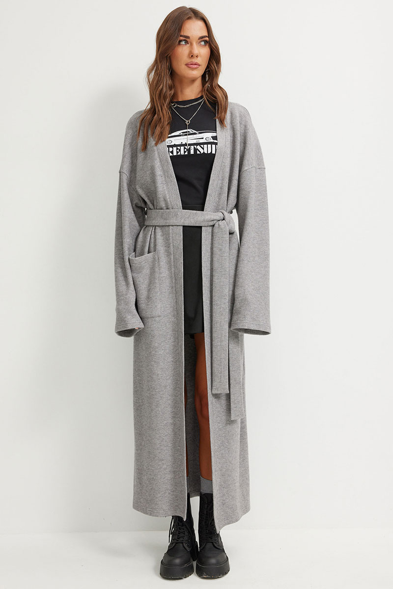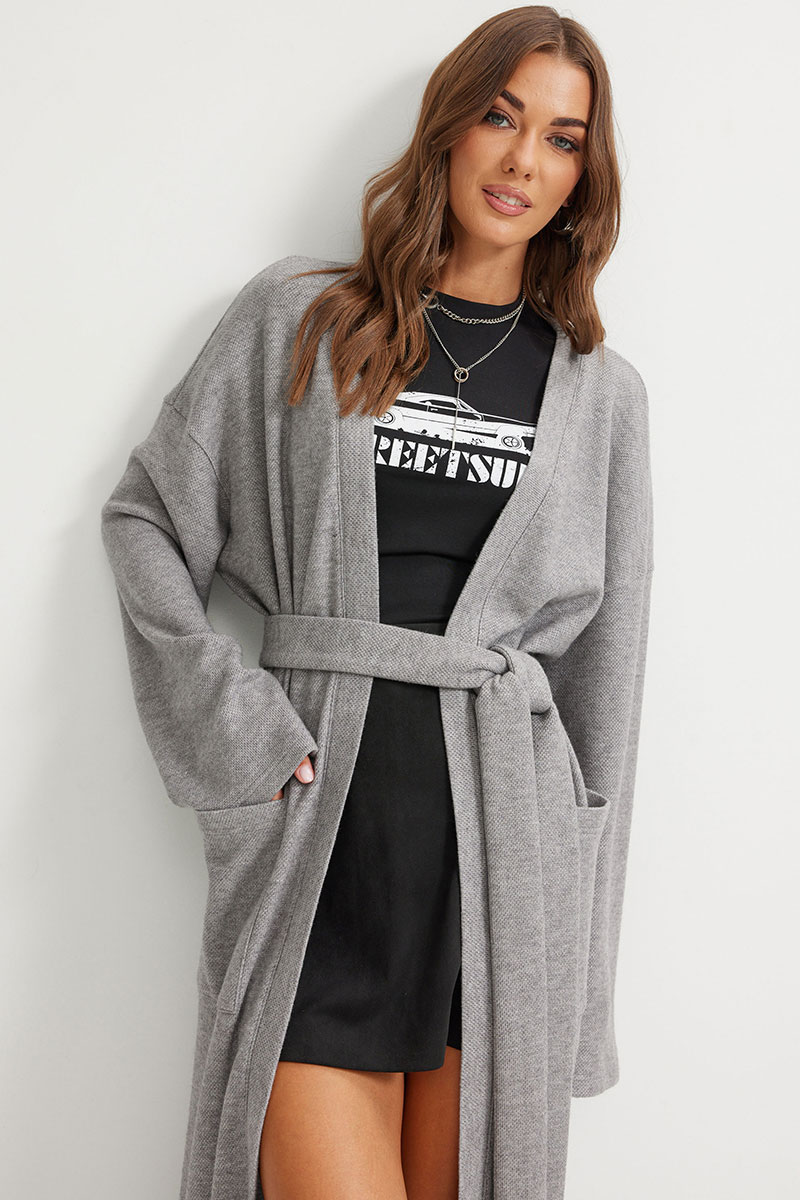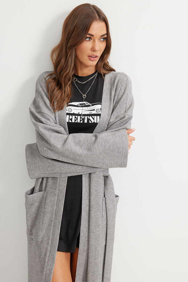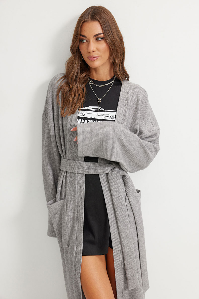 Кардиган свободного силуэта из трикотажного полотна. Рукав со спущенной линией плеча удлиненный и расширенный книзу. В комплект входит пояс.