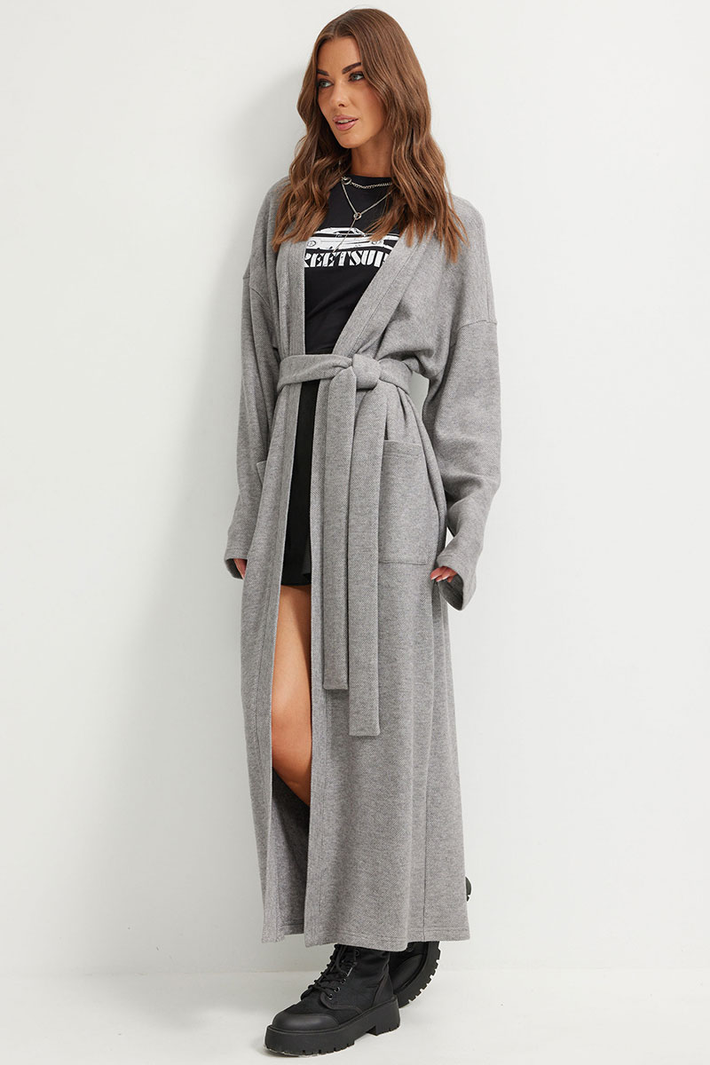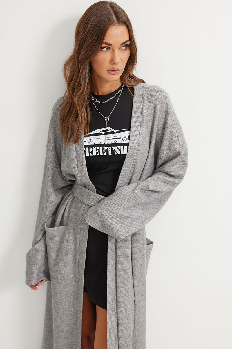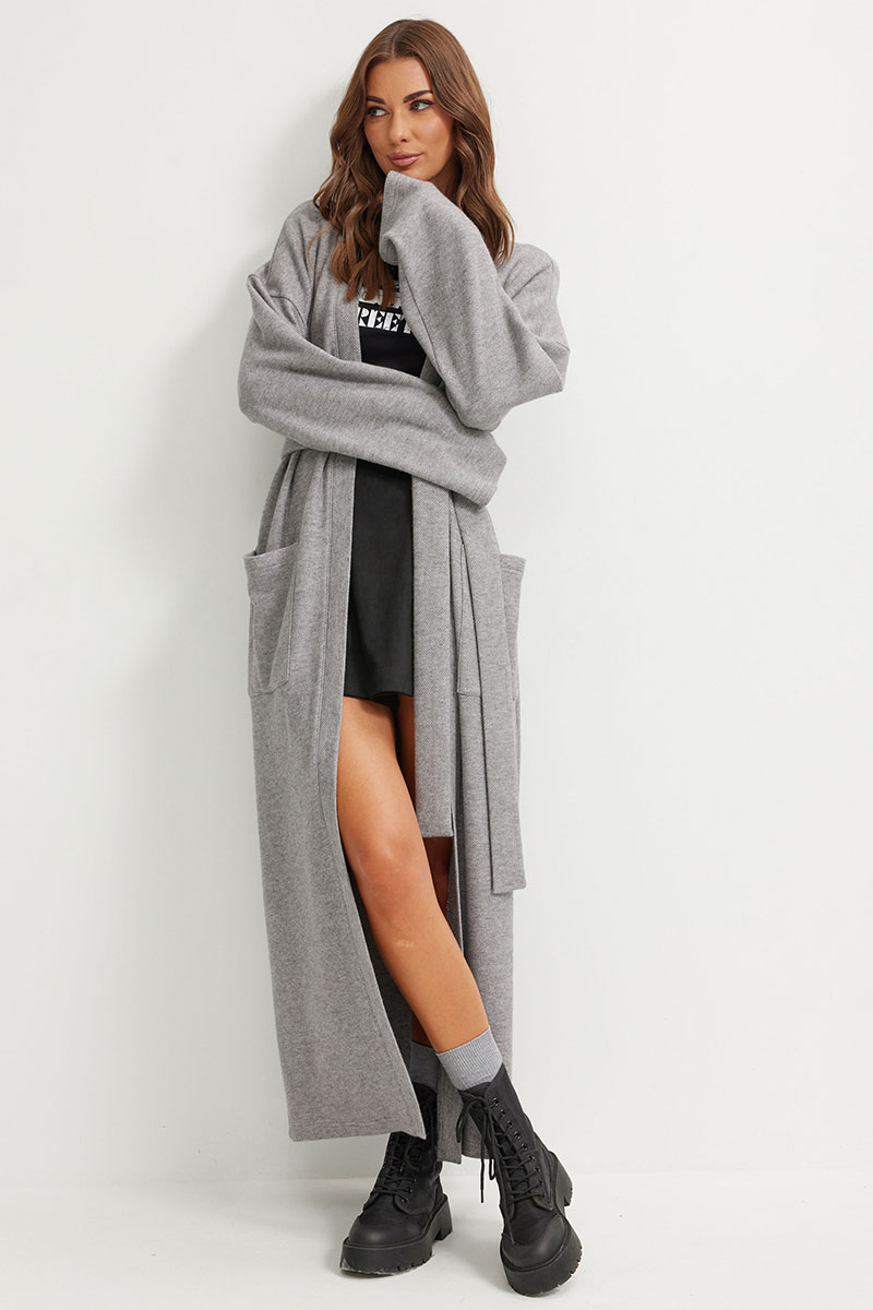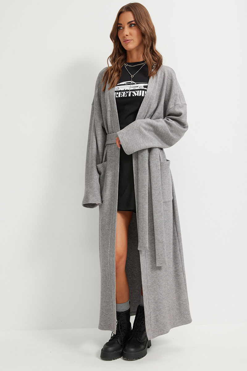 Кардиган свободного силуэта из трикотажного полотна. Рукав со спущенной линией плеча удлиненный и расширенный книзу. В комплект входит пояс.