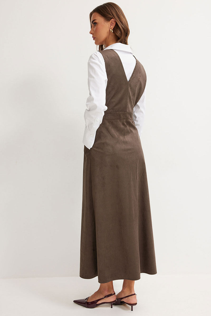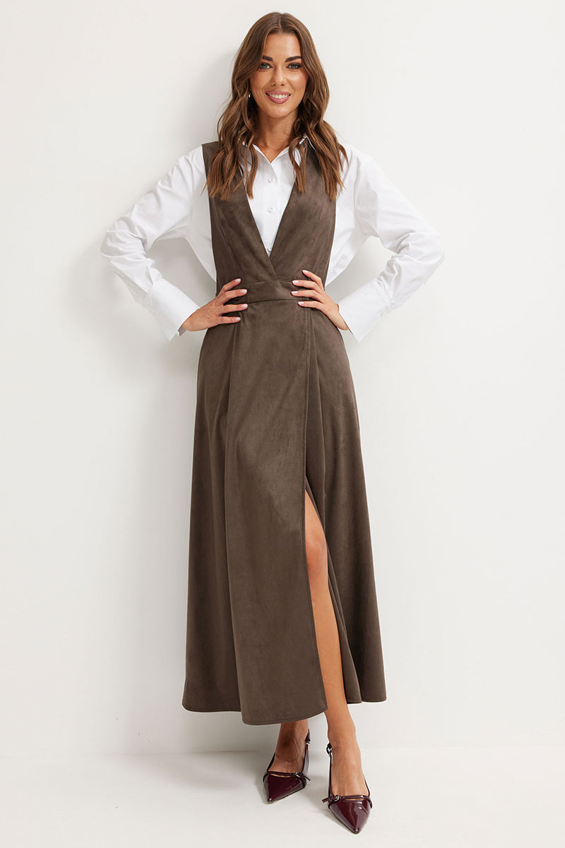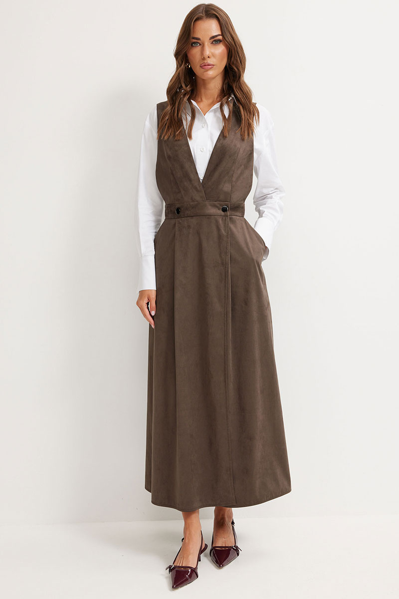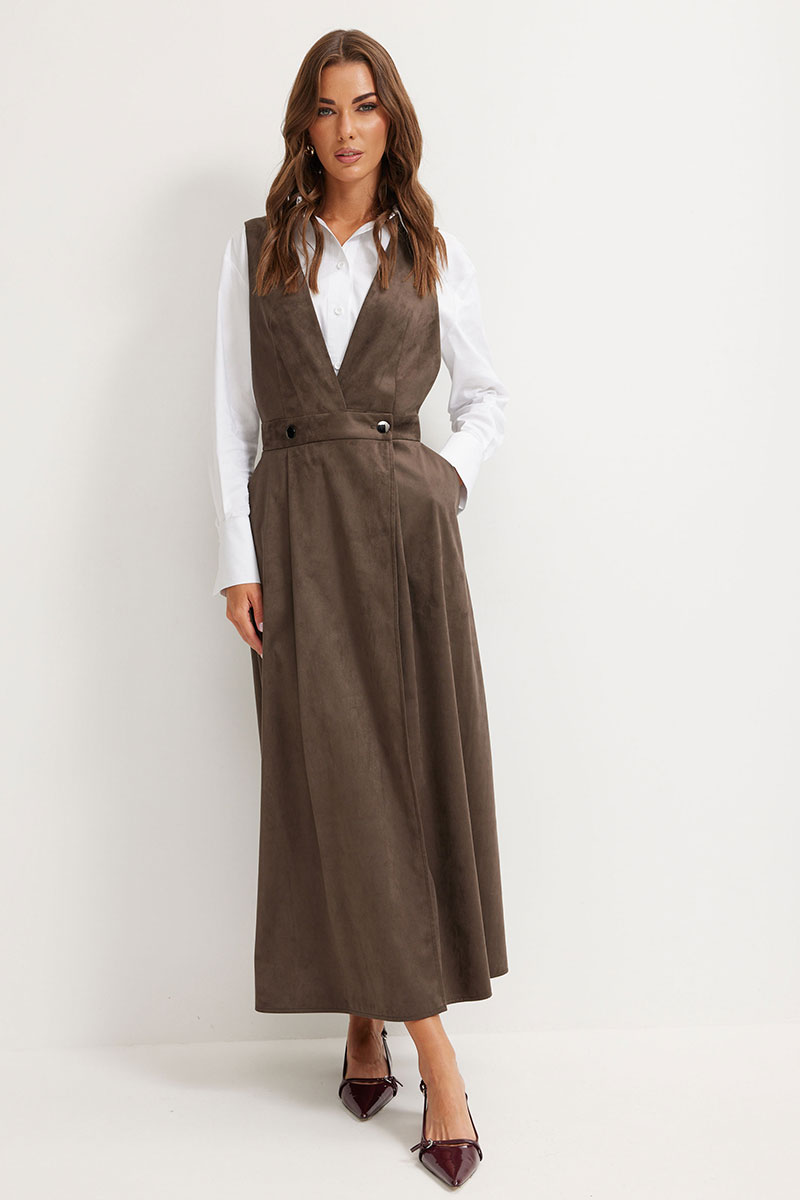 Сарафан полуприлегающего силуэта расширенный книзу из экозамши. Сарафан отрезной по линии талии с двубортной застежкой. По переду и спинке в области талии притачной пояс и талиевые вытачки. В боковых швах карманы. Сарафан частично на подкладке. Обращаем ваше внимание, что фурнитура может отличаться от фото.