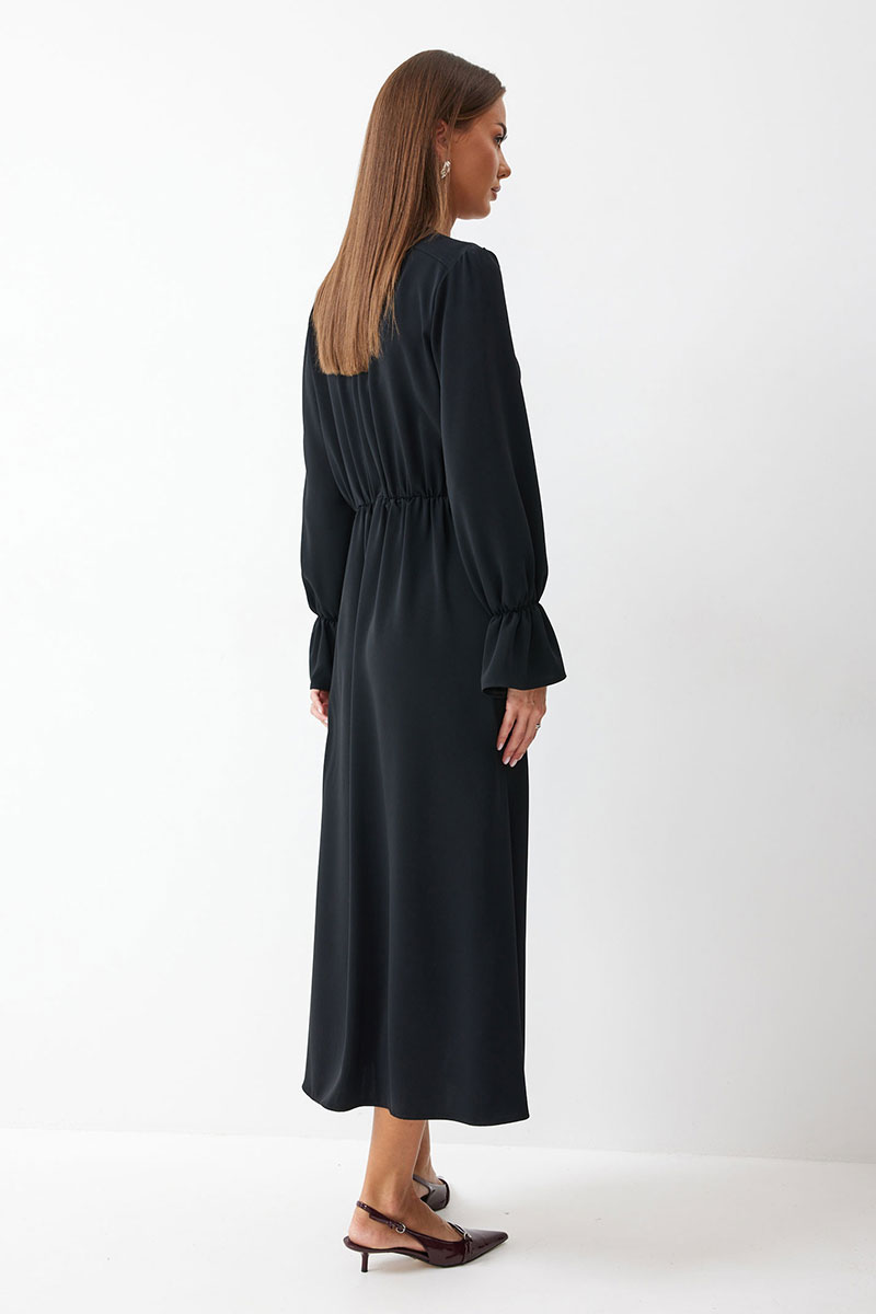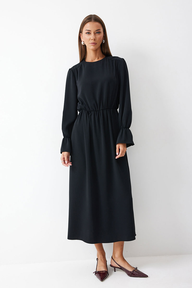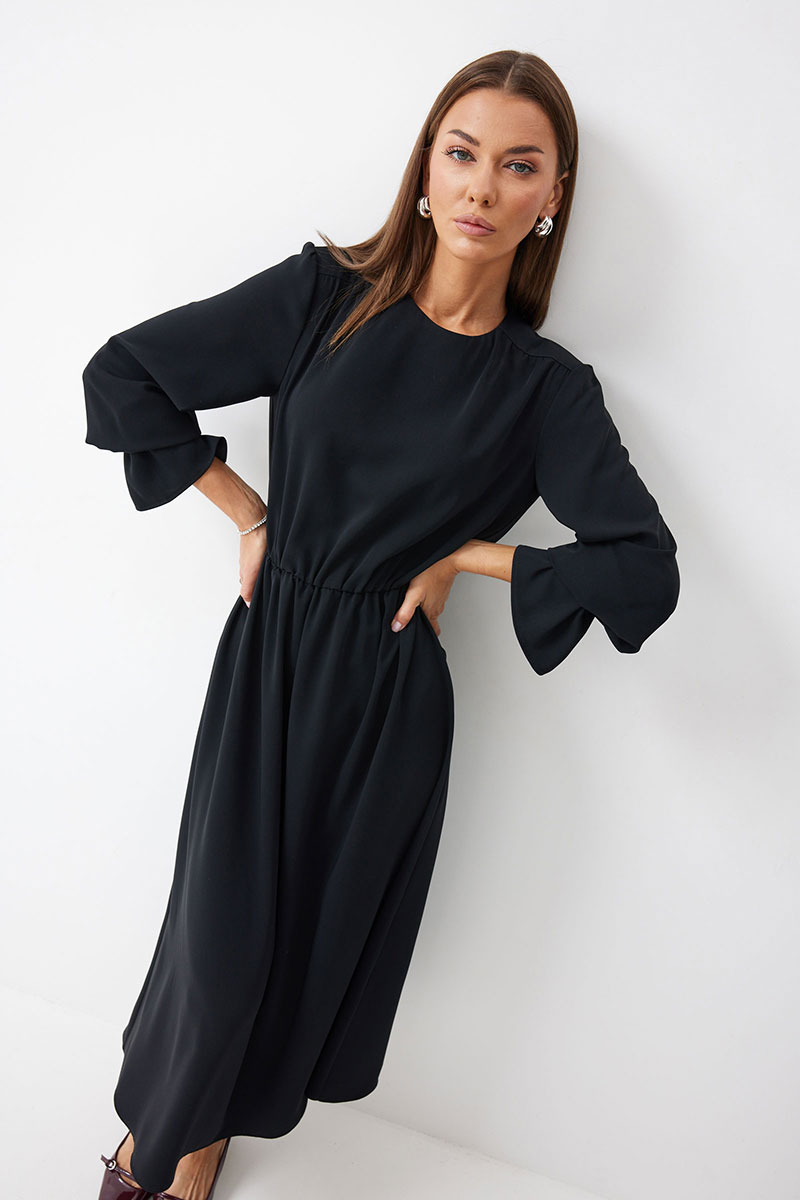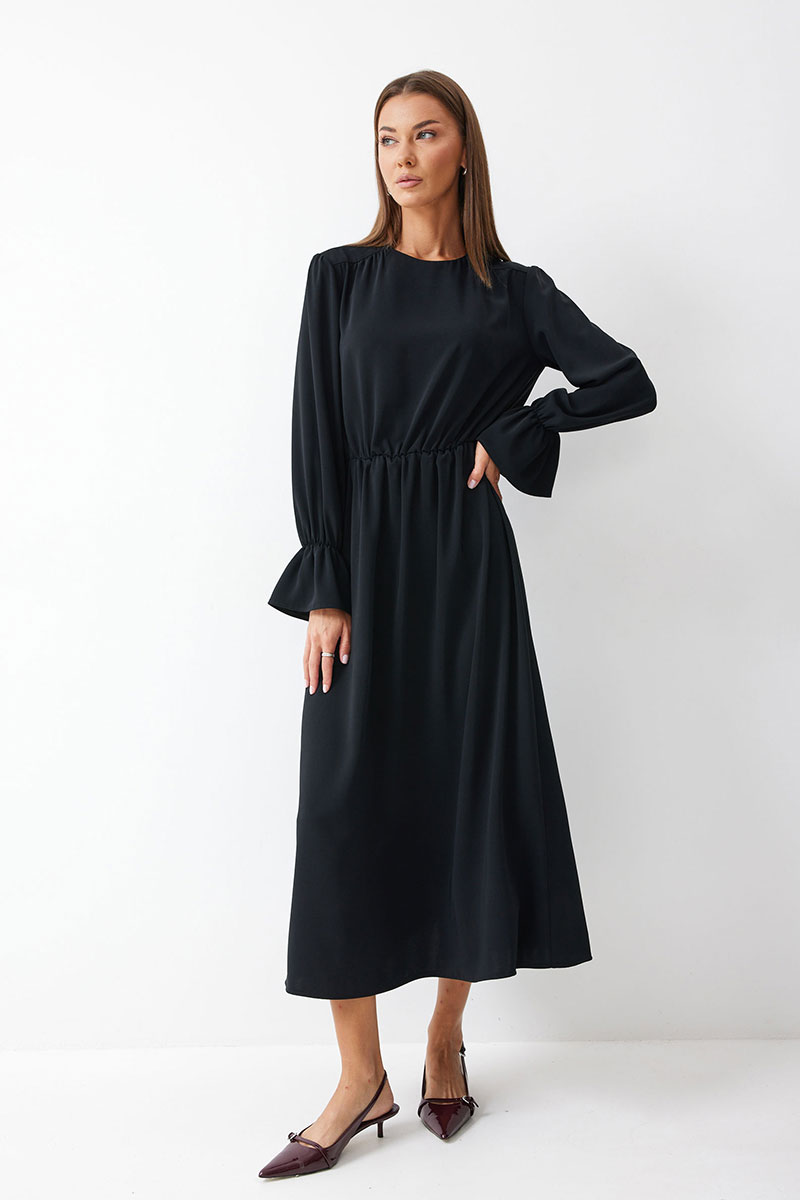 Платье полуприлегающего силуэта из струящейся ткани. В области талии расположен подрез, с эластичной тесьмой. Рукав втачной, со сборкой по плечу, по низу волан, собранный на резинку. Юбка А-силуэта.