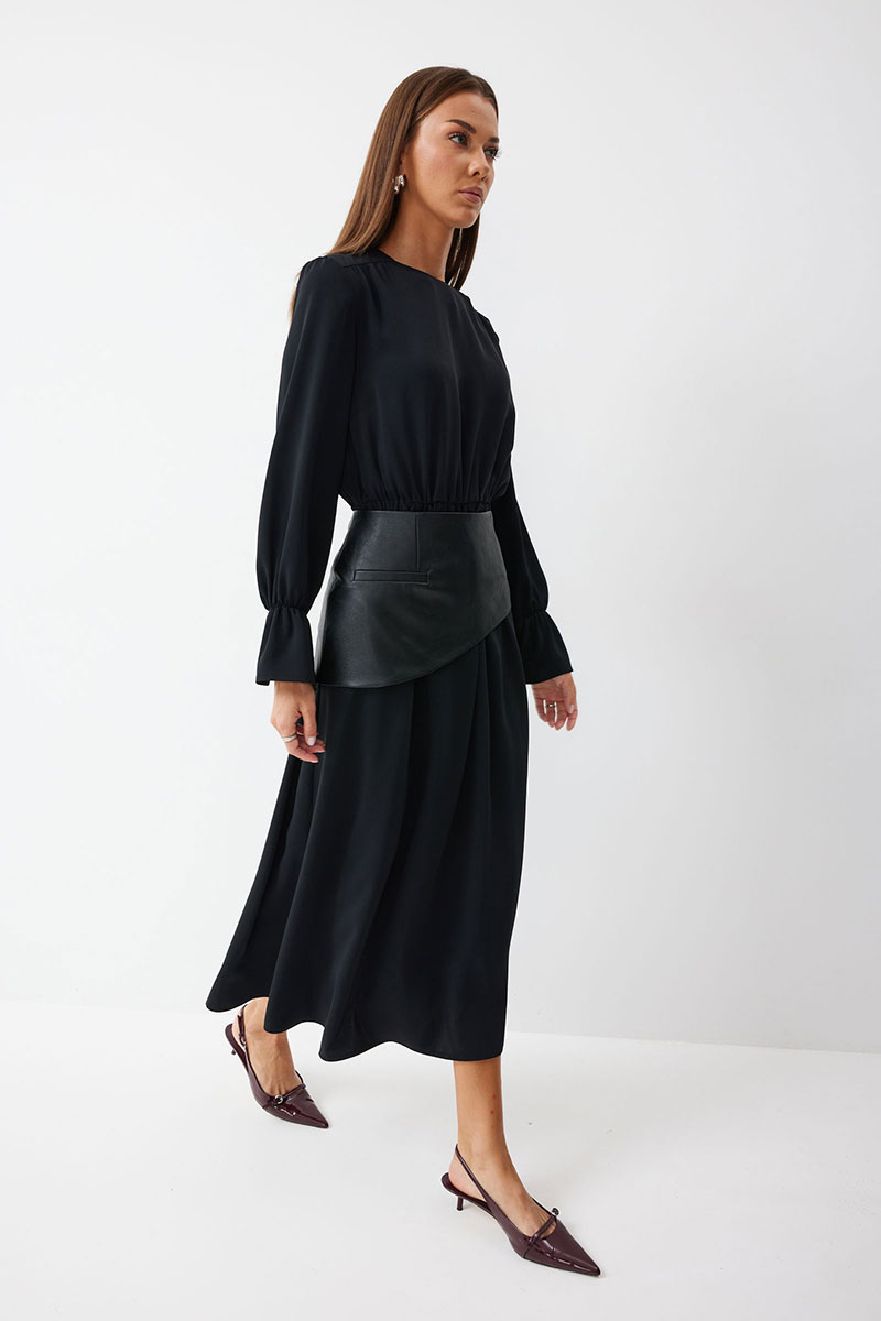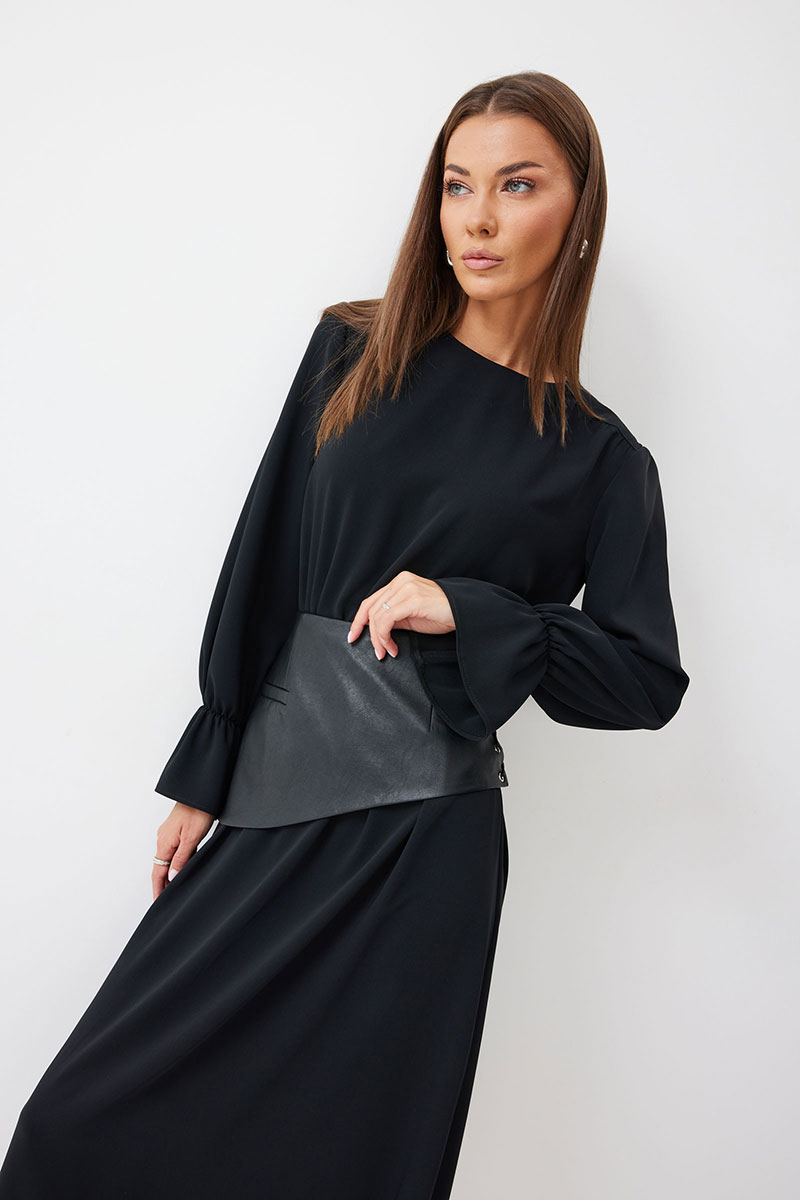 Платье дополняет съёмная деталь в виде баски из экокожи, с шнуровкой в боковом шве.