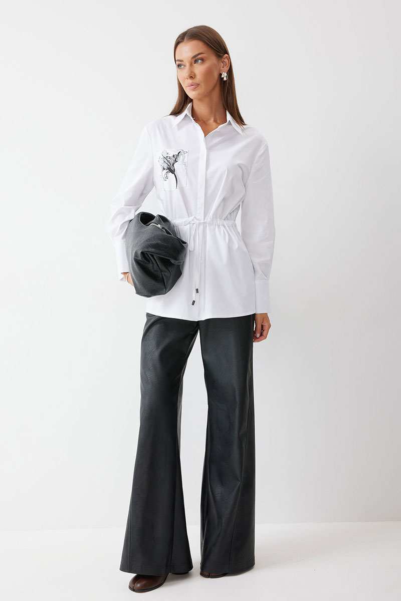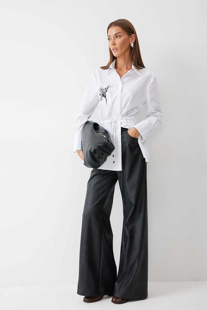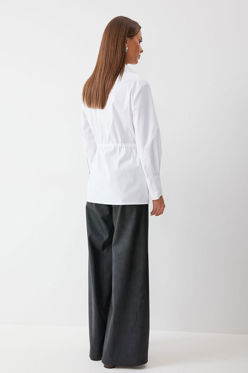 Блузка полуприлегающего силуэта. На уровне талии расположена кулиска с и завязками для регулирования степени прилегания. По центру супатная застежка, воротник рубашечный стояче-отложной. Рукав втачной. В верхней части полочки расположен накладной карман с дизайнерской печатью.