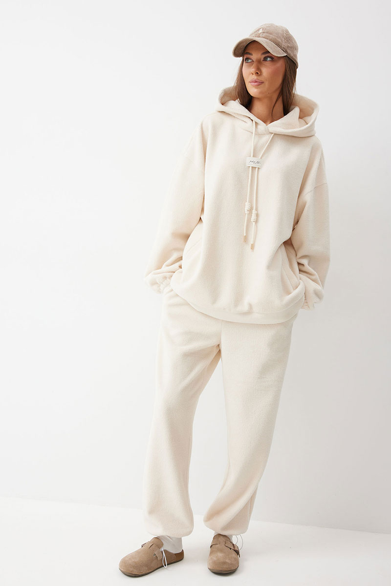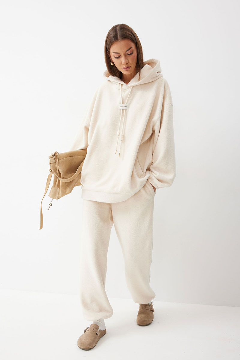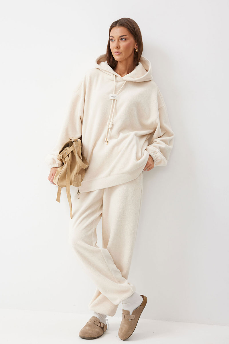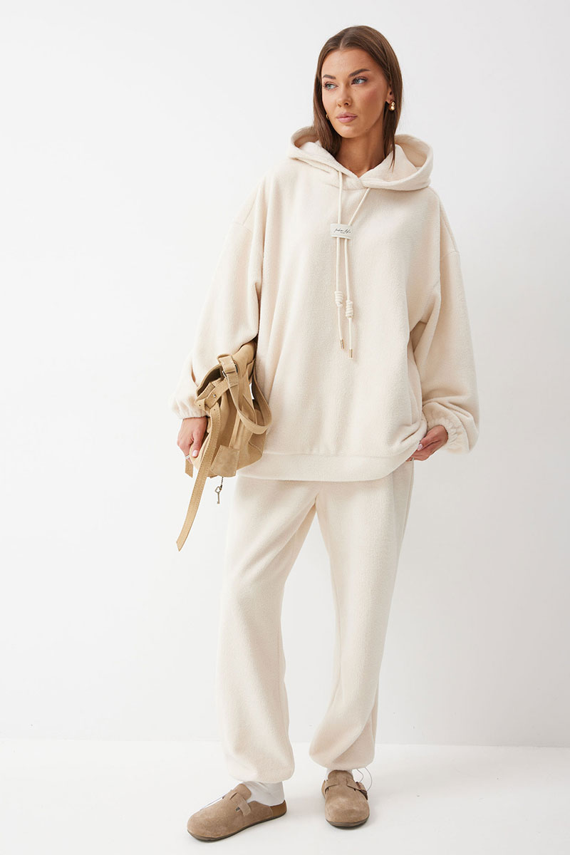 Джемпер прямого силуэта из комфортного трикотажного полотна. Горловина обработана капюшоном. Рукав со спущенной линией плеча, по низу на резинке. По низу джемпера притачной пояс. По переду декоративная нашивка и шнур.