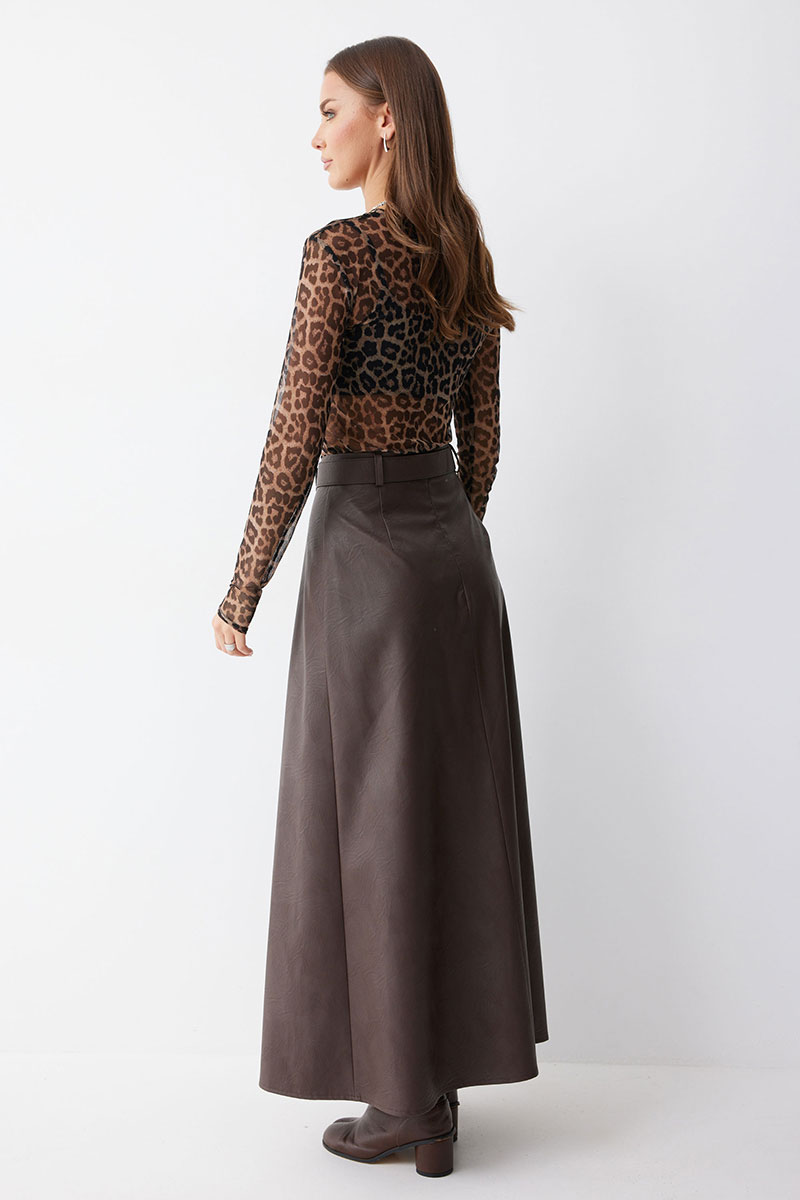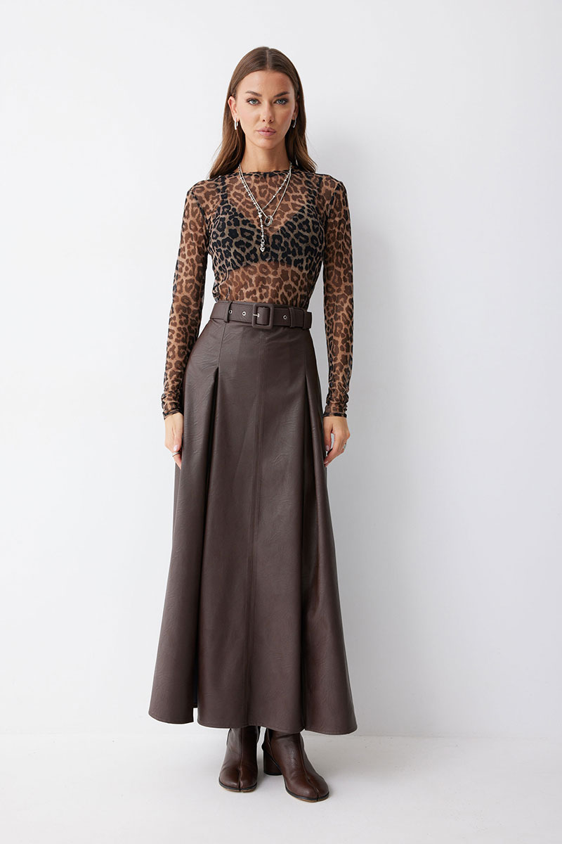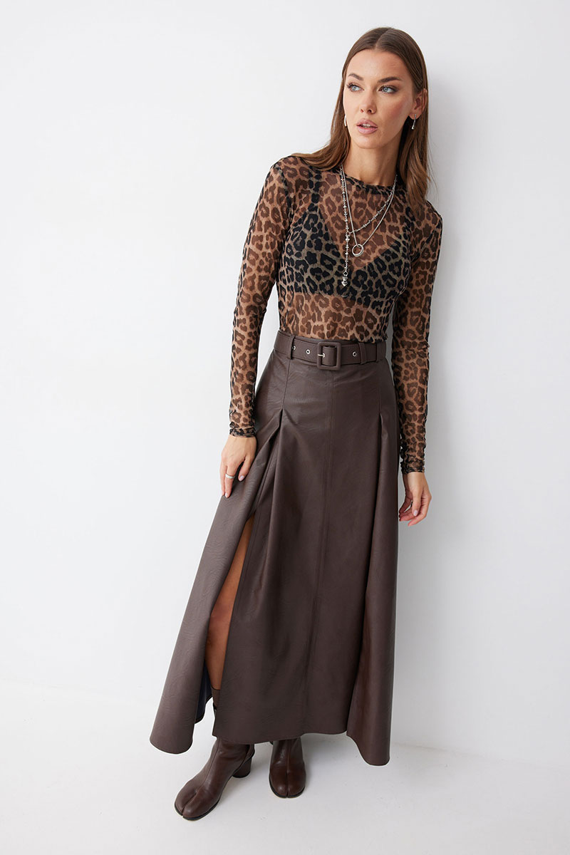 Стильная юбка А-силуэта из экокожи. По верху юбки притачной пояс со шлевками для ремня. На передних половинках расположены вытачки со встречной складкой и разрезами по низу. На задних половинках расположены талиевые вытачки. На спинке по центру потайная молния. В комплект входит ремень.