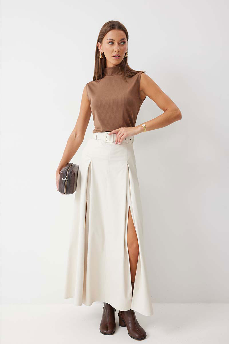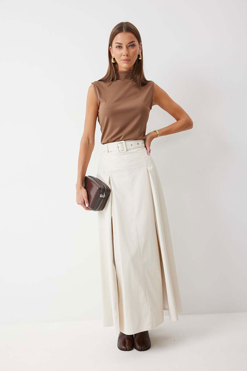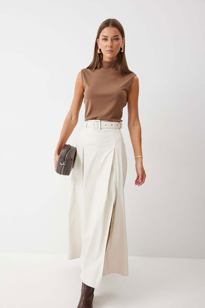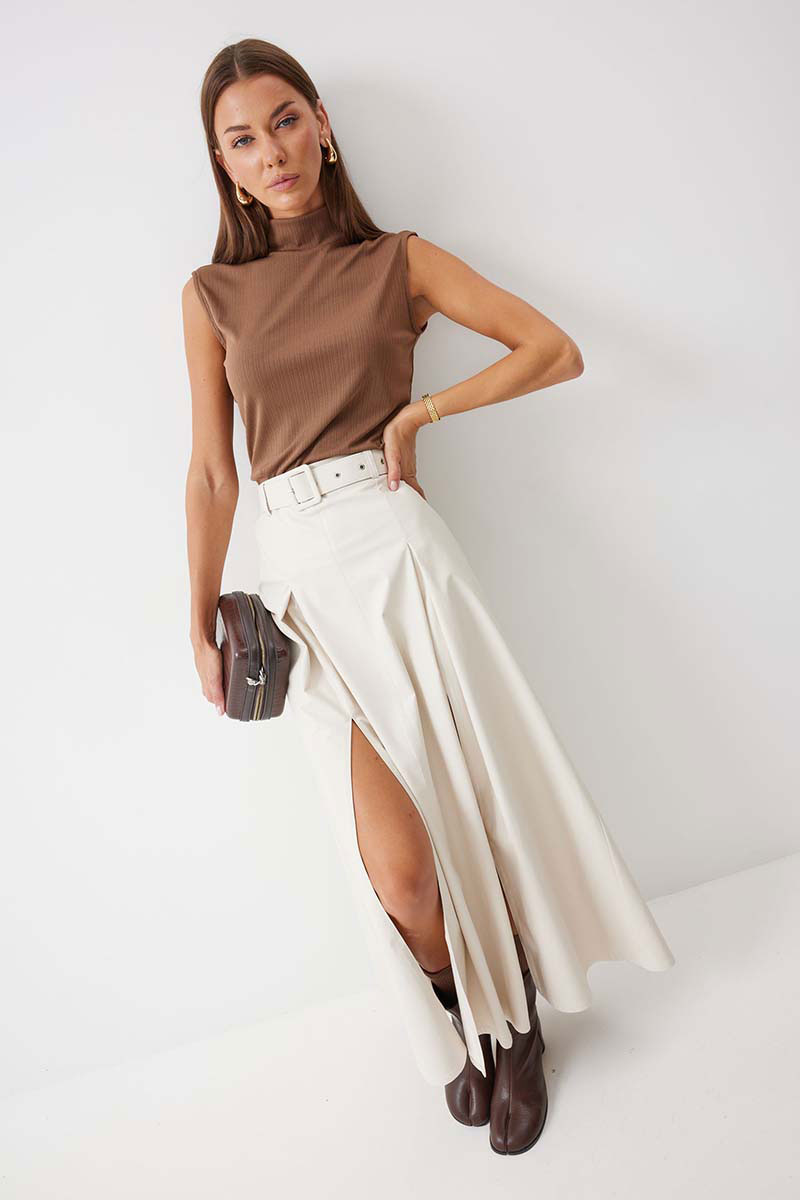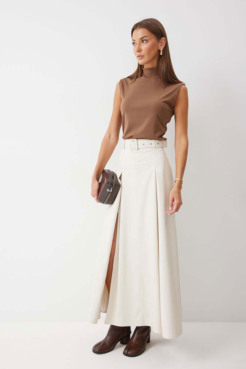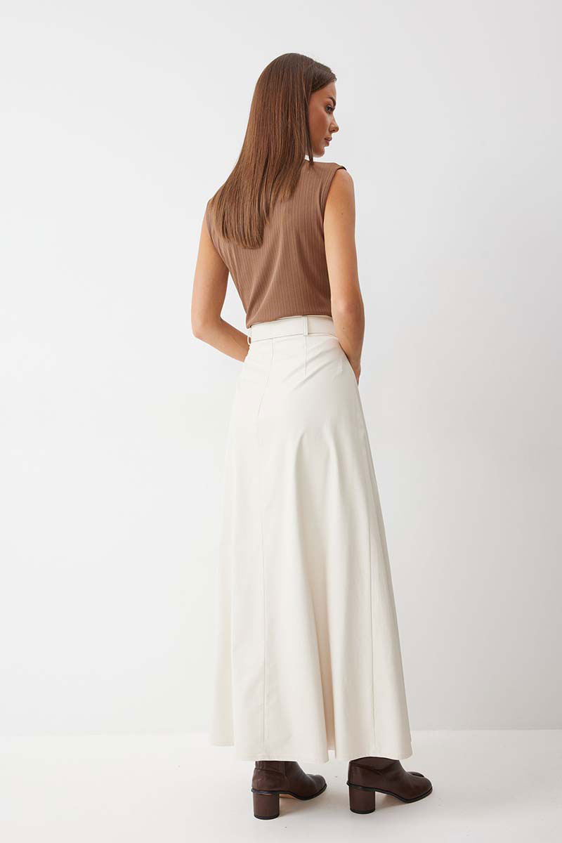 Стильная юбка А-силуэта из экокожи , длины макси. По верху юбки притачной пояс с шлевками для ремня. На передних половинках расположены вытачки со встречной складкой и разрезами по низу. На задних половинках расположены талиевые вытачки. На спинке по центру потайная молния. В комплект входит ремень.