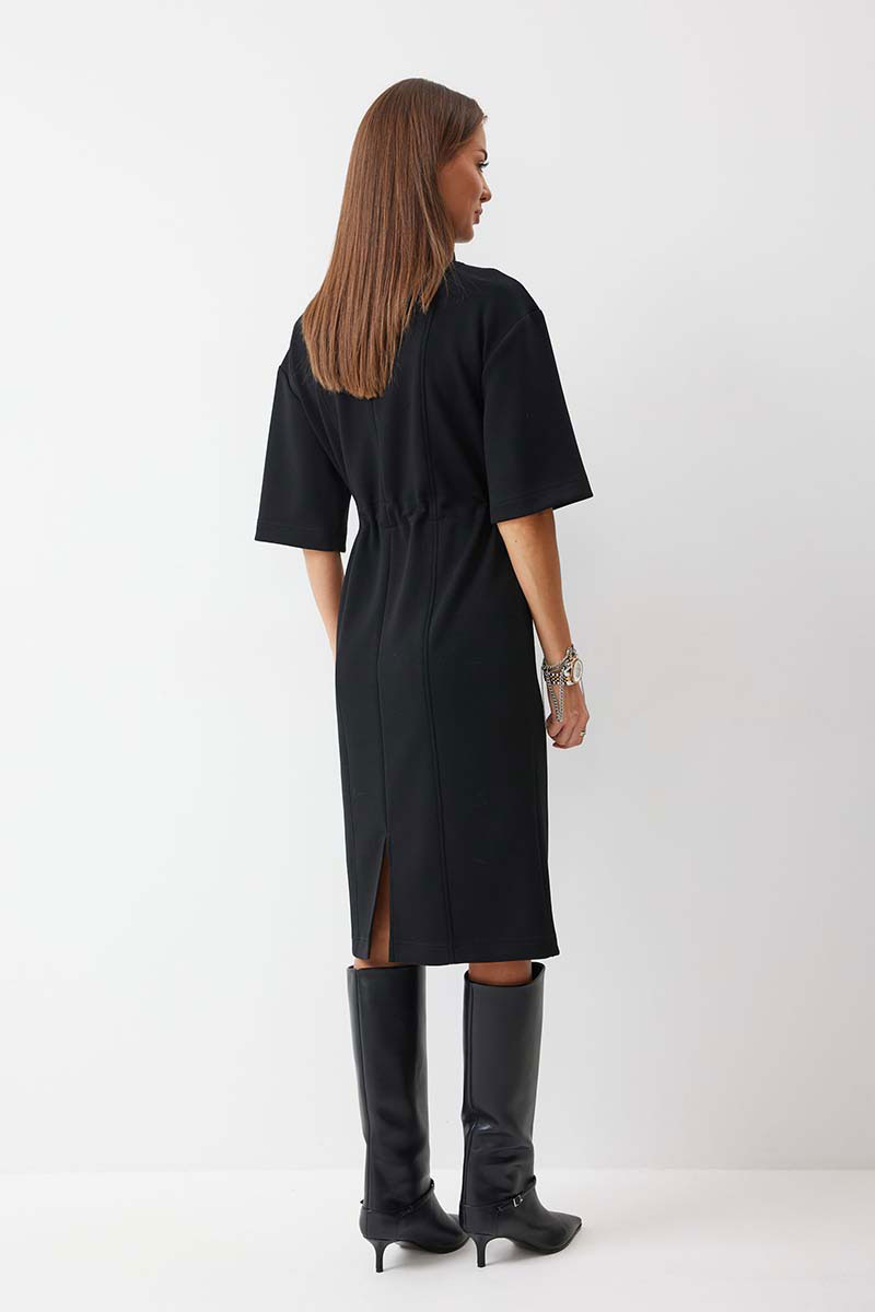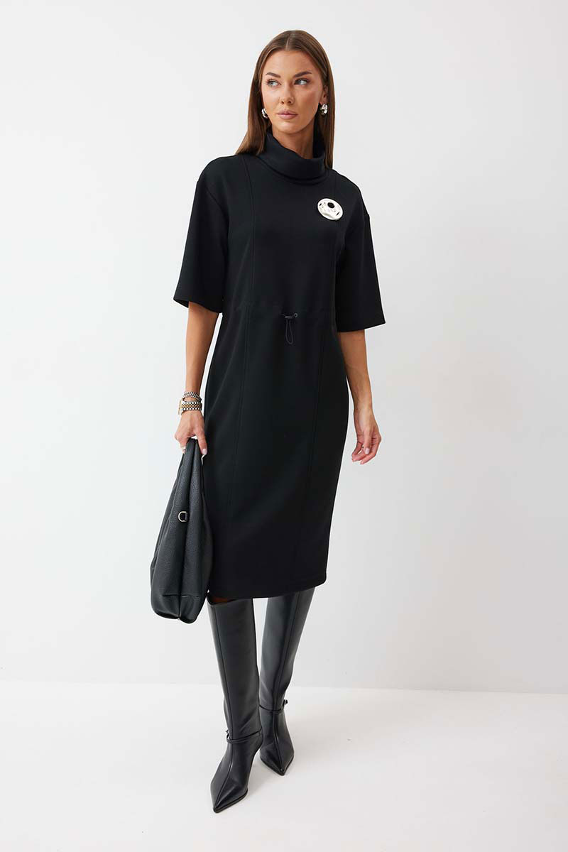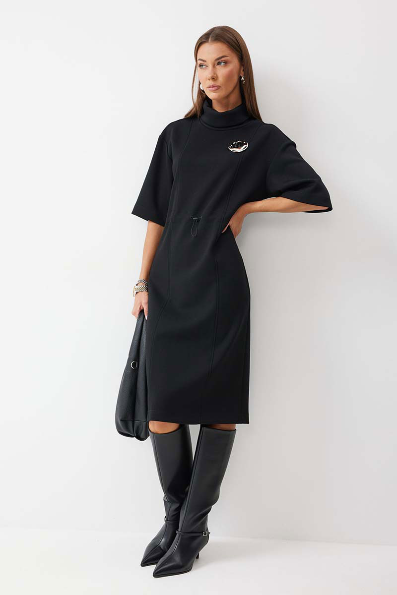 Платье прямого силуэта из трикотажного полотна. Горловина-стойка. Рукав со спущенной линией плеча, с коротким рукавом. На спинке в центральном шве по низу разрез. По переду и спинке декоративные рельефы. В районе талии кулиса с фиксатором для регулирования степени прилегания. В комплект входит съемная брошь. Обращаем ваше внимание, что фурнитура может отличаться от фото.