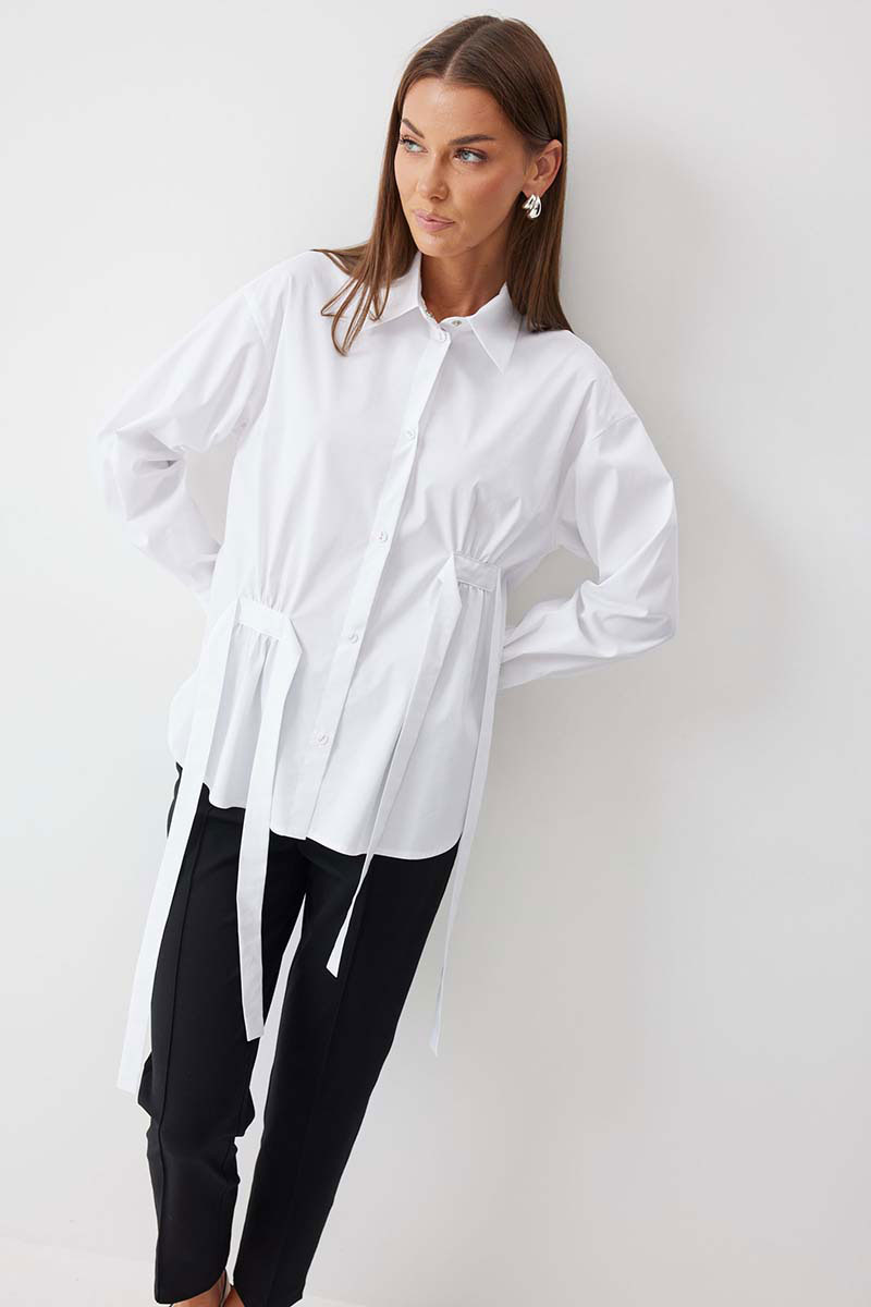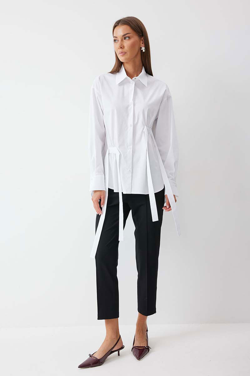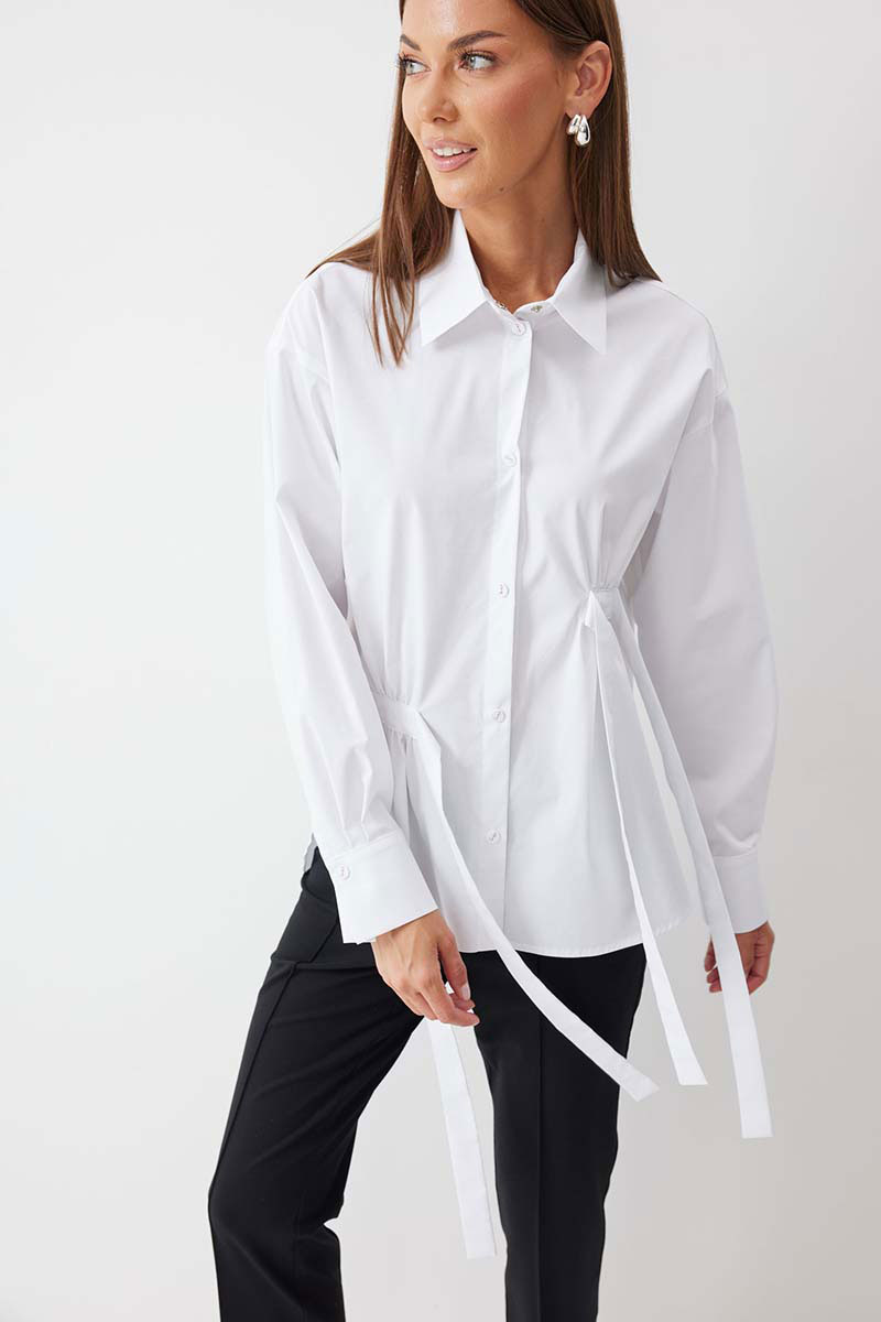 Блузка прямого силуэта из хлопковой ткани с фигурным низом. Воротник рубашечного типа по центру с застежкой на кнопки. Рукав со спущенной линией плеча, по низу манжета с застежкой на кнопку. На спинке кокетка и складки. По переду декоративные элементы со сборкой. Обращаем ваше внимание, что фурнитура может отличаться от фото.