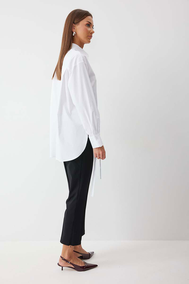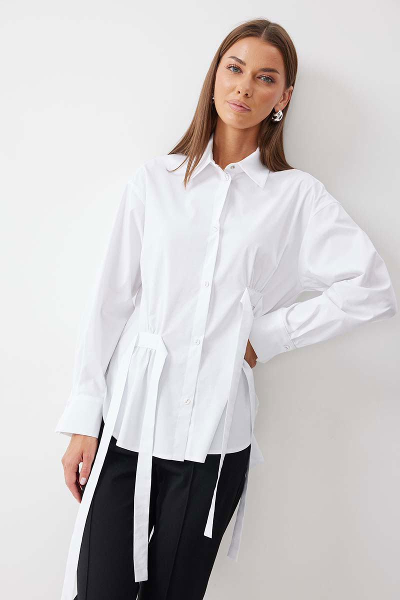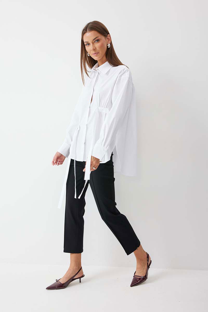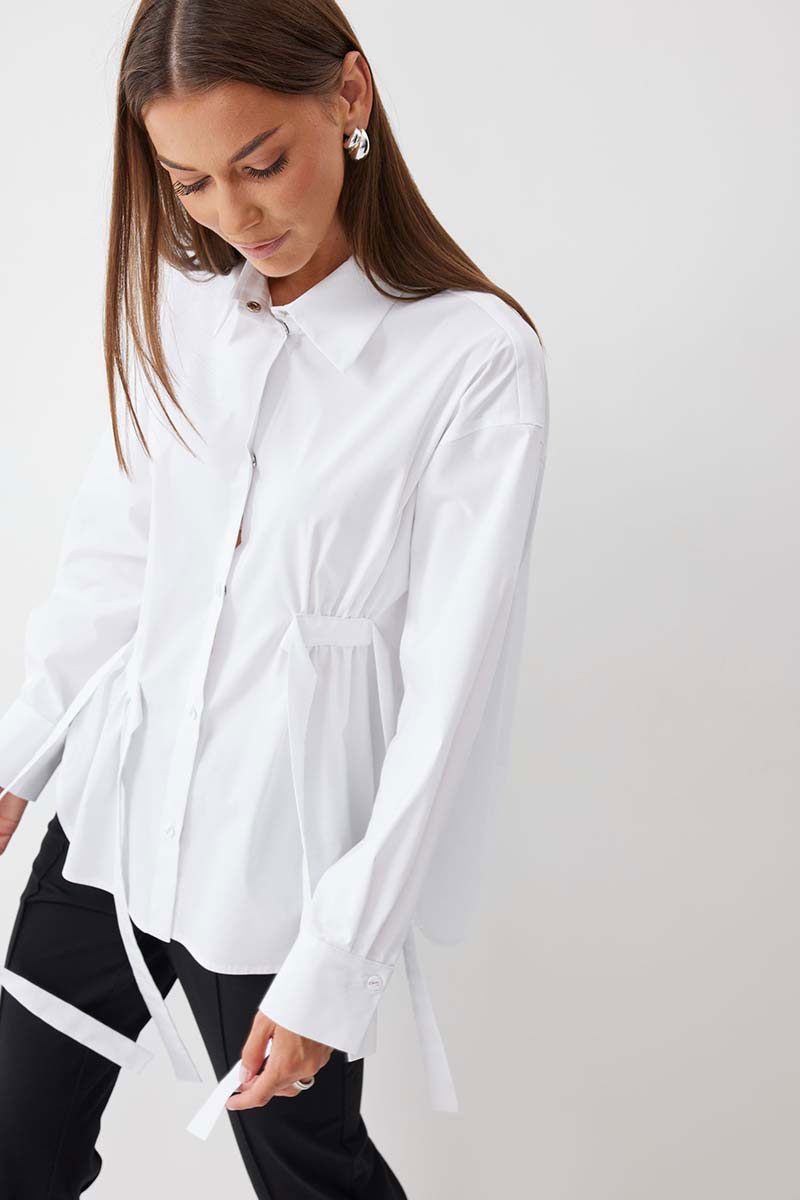 Блузка прямого силуэта из хлопковой ткани с фигурным низом. Воротник рубашечного типа по центру с застежкой на кнопки. Рукав со спущенной линией плеча, по низу манжета с застежкой на кнопку. На спинке кокетка и складки. По переду декоративные элементы со сборкой. Обращаем ваше внимание, что фурнитура может отличаться от фото.