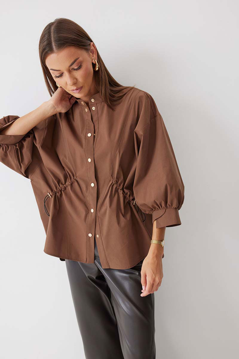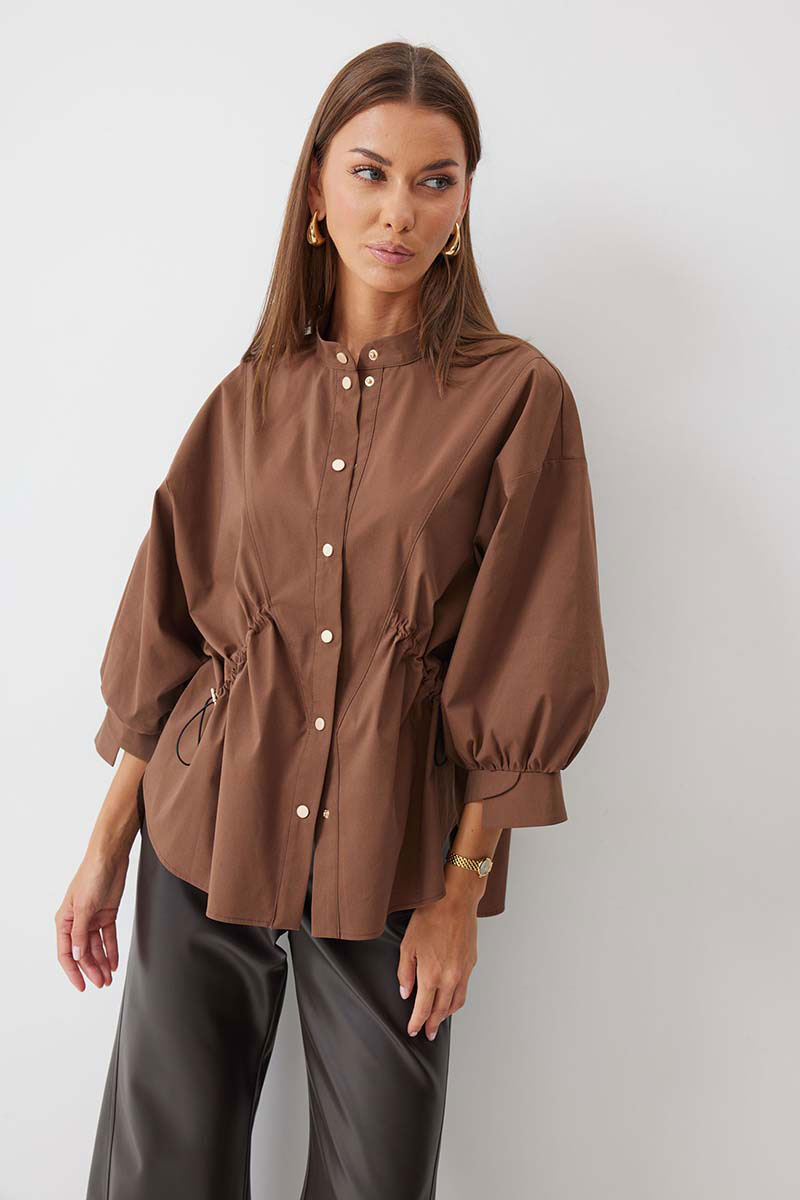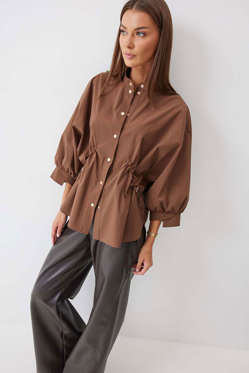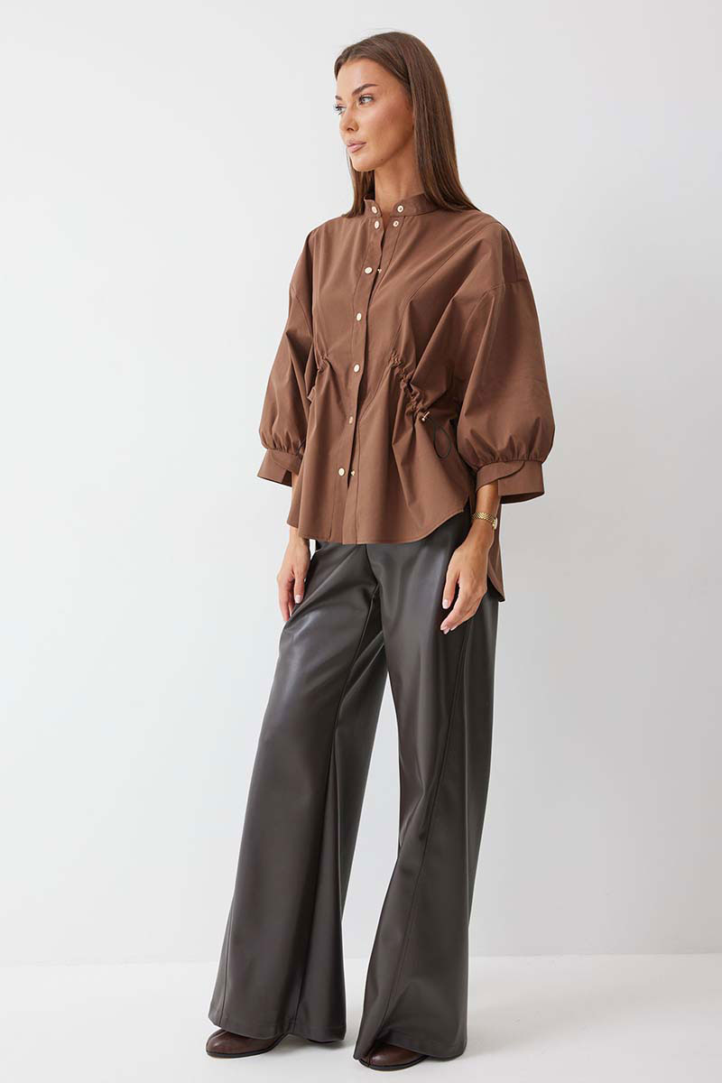 Блузка прямого силуэта из хлопковой ткани с фигурным низом. Воротник –стойка, по центру застежка на кнопки. Рукав спущенный с заниженной проймой, по низу рукава сборка и декоративная манжета. По переду декоративная кулиса с фиксаторами для регулирования степени прилегания изделия. На спинке кокетка и сборка по центру. Обращаем ваше внимание, что фурнитура может отличаться от фото.