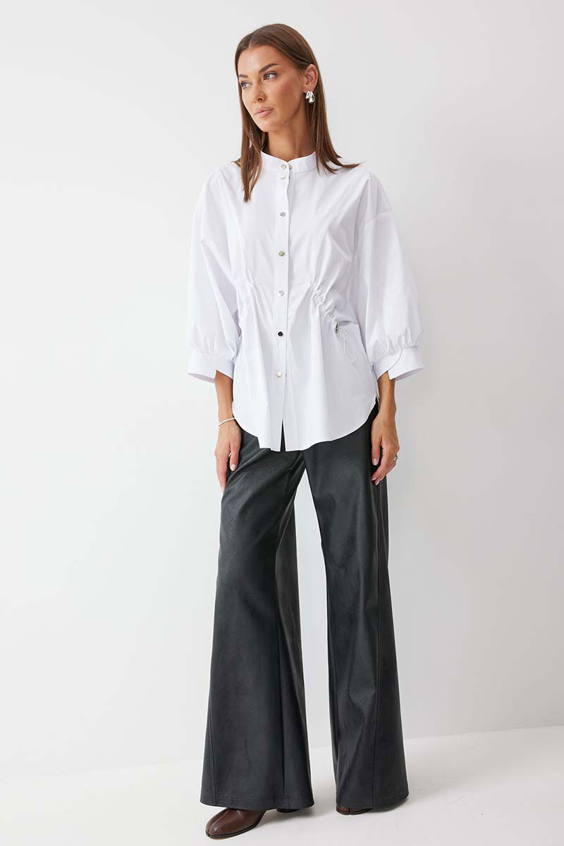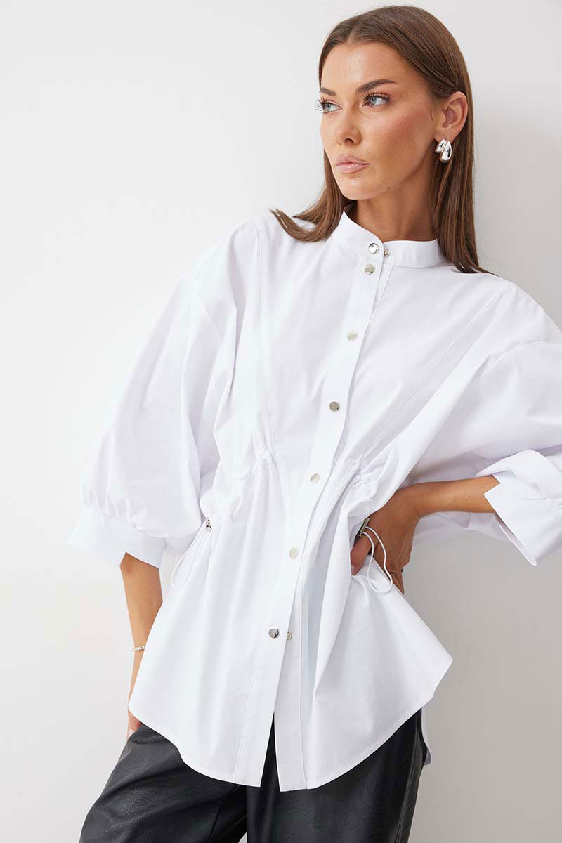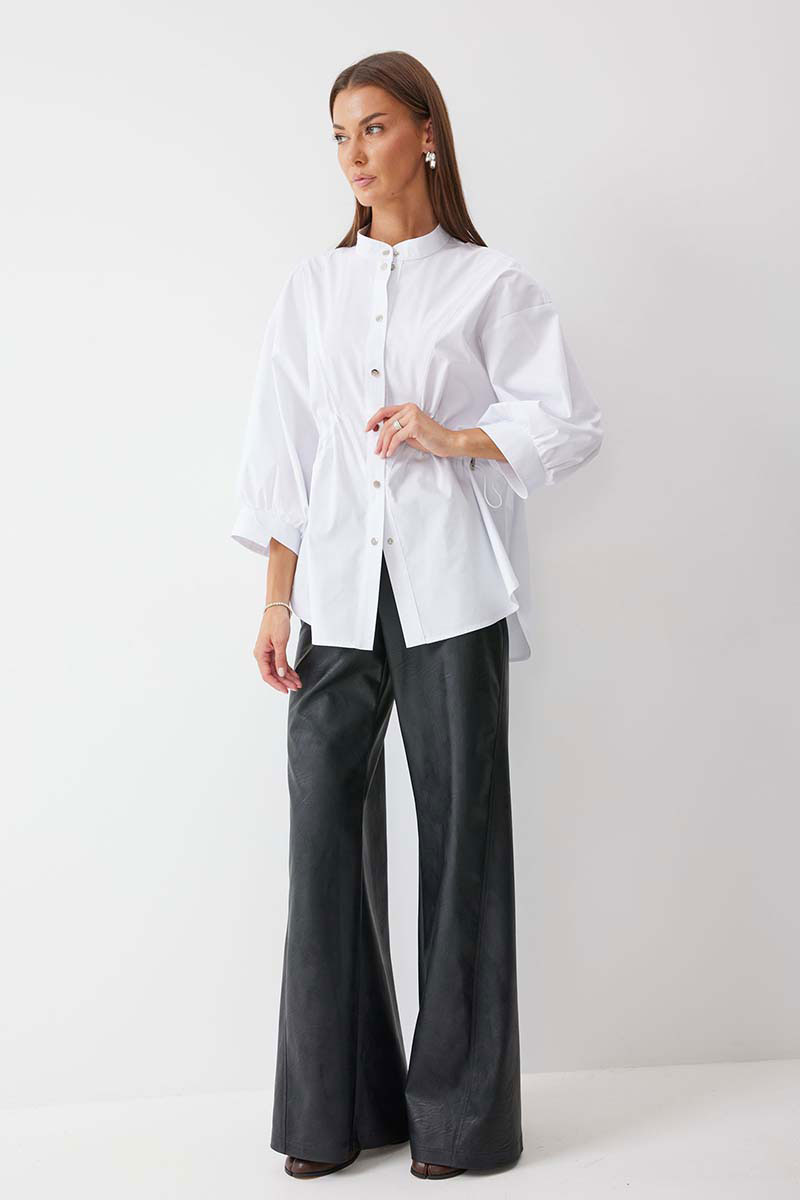 Блузка прямого силуэта из хлопковой ткани с фигурным низом. Воротник –стойка, по центру застежка на кнопки. Рукав спущенный с заниженной проймой, по низу рукава сборка и декоративная манжета. По переду декоративная кулиса с фиксаторами для регулирования степени прилегания изделия. На спинке кокетка и сборка по центру. Обращаем ваше внимание, что фурнитура может отличаться от фото.