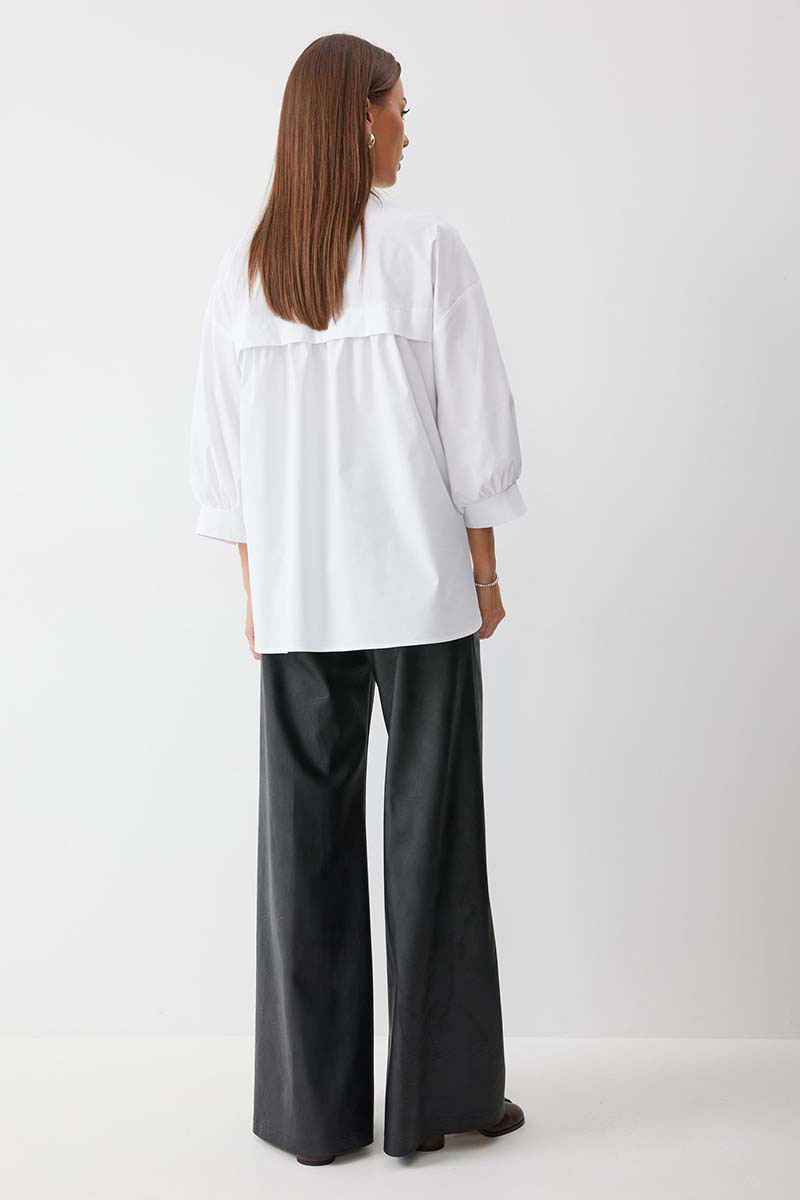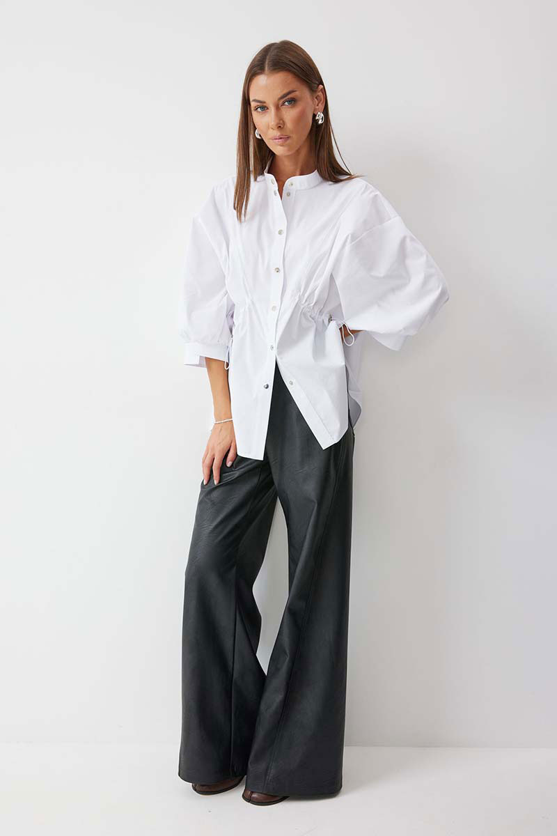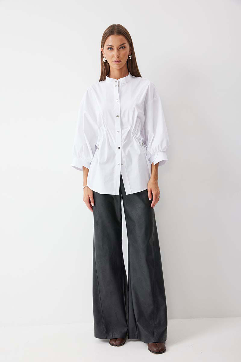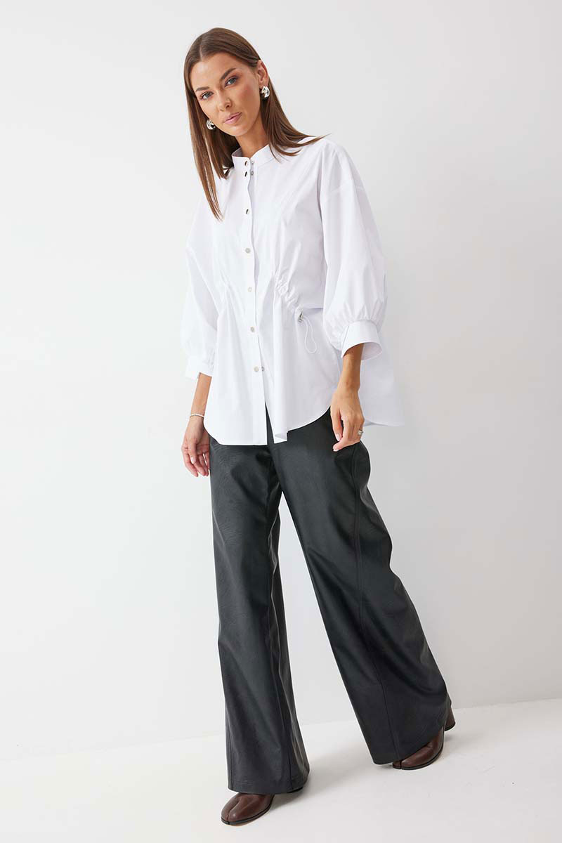 Блузка прямого силуэта из хлопковой ткани с фигурным низом. Воротник –стойка, по центру застежка на кнопки. Рукав спущенный с заниженной проймой, по низу рукава сборка и декоративная манжета. По переду декоративная кулиса с фиксаторами для регулирования степени прилегания изделия. На спинке кокетка и сборка по центру. Обращаем ваше внимание, что фурнитура может отличаться от фото.