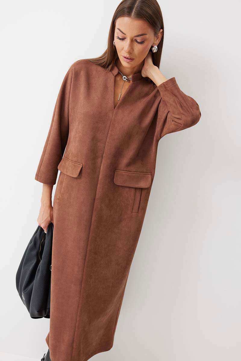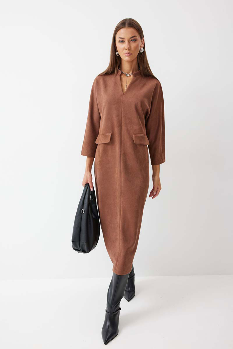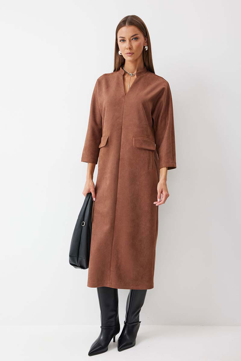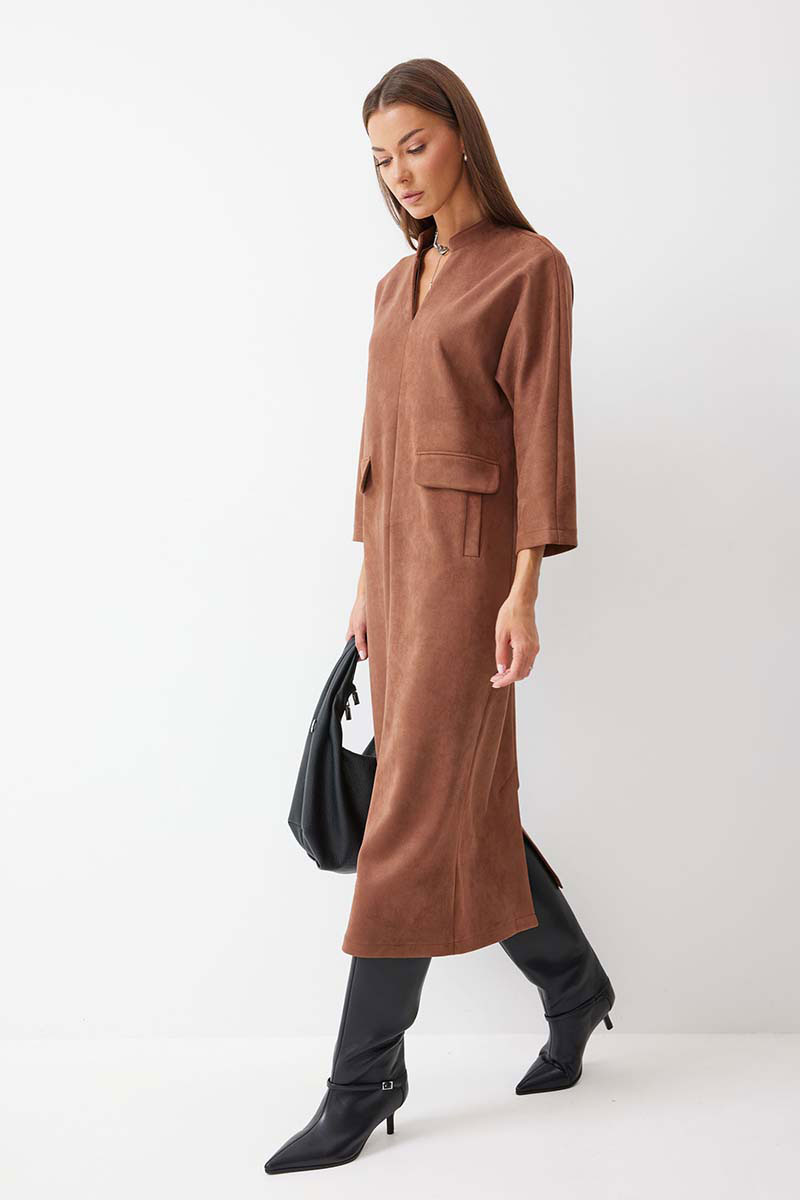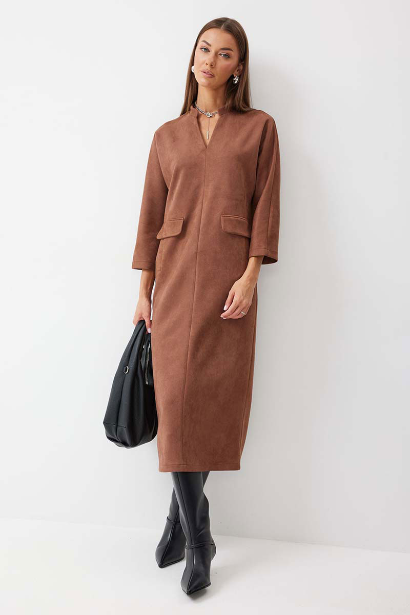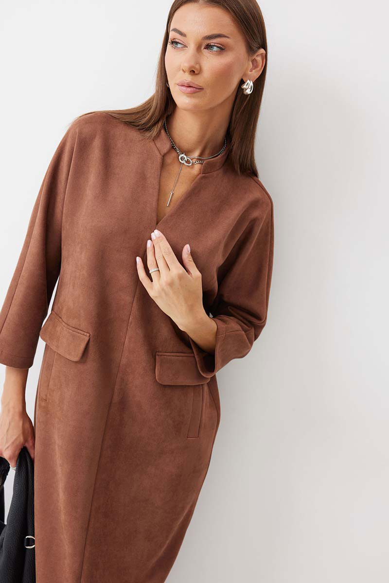Платье прямого силуэта из трикотажного полотна длины миди. Рукав цельнокроеный, длиной ¾. Воротник-стойка. На передних половинках обработаны прорезные карманы с втачной листочкой и декоративным клапаном. По спинке расположен центральный шов с шлицей по низу.