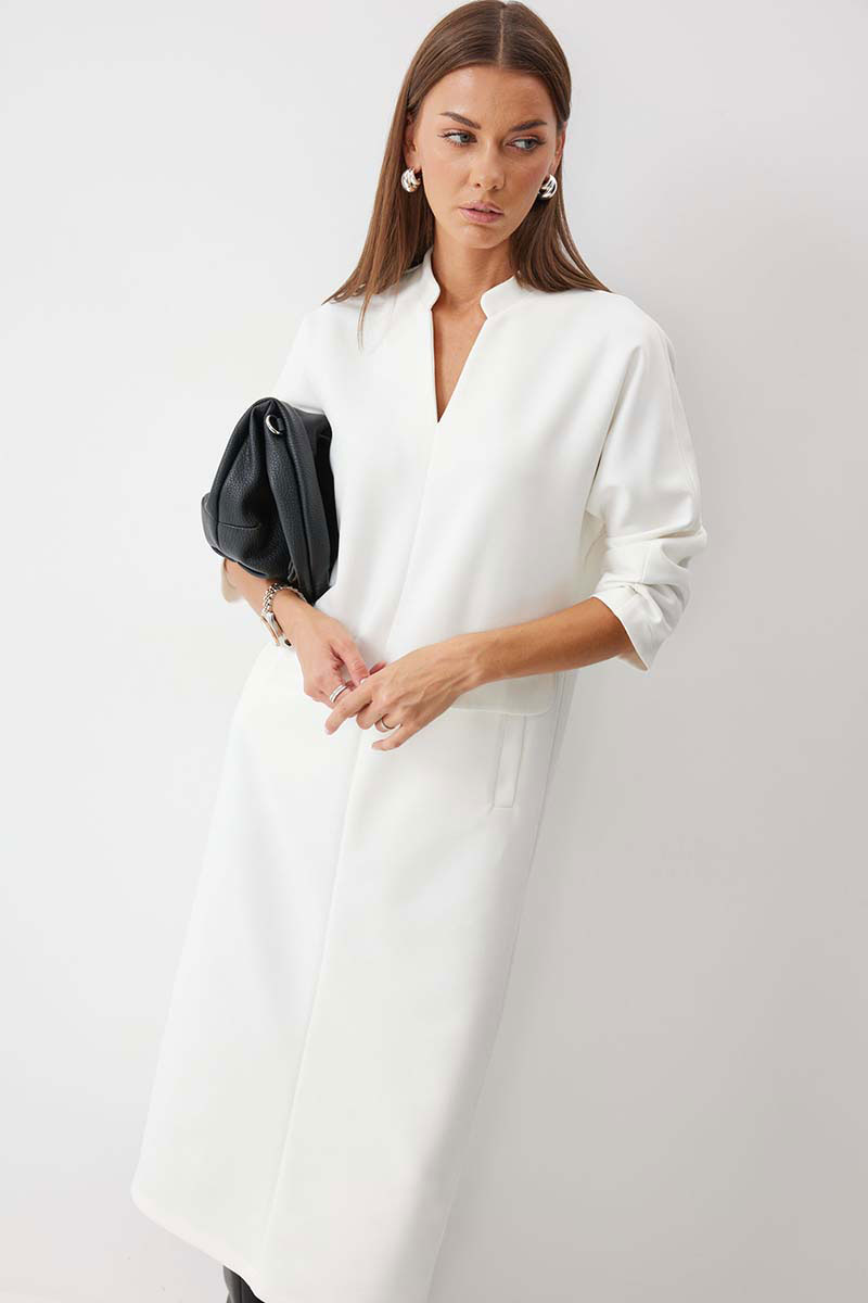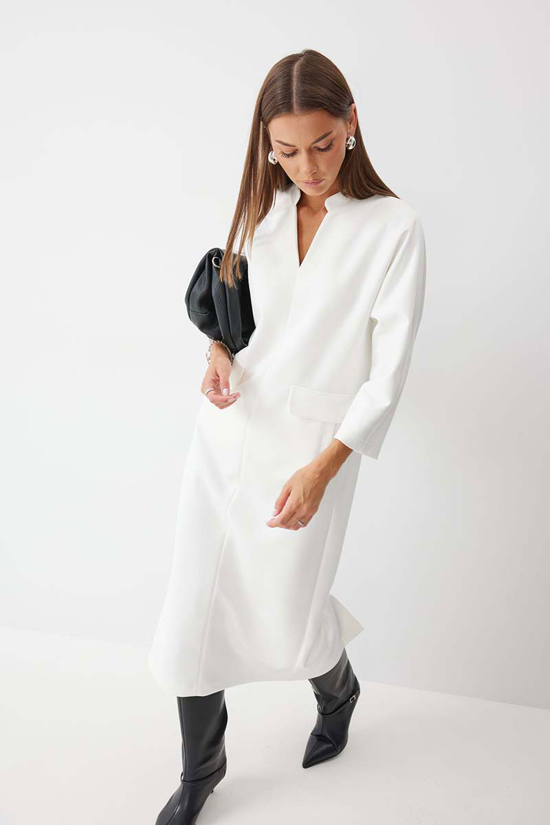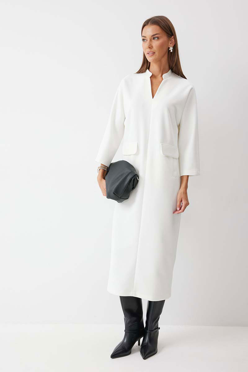 Платье прямого силуэта из трикотажного полотна длины миди. Рукав цельнокроеный, длиной ¾. Воротник-стойка. На передних половинках обработаны прорезные карманы с втачной листочкой и декоративным клапаном. По спинке расположен центральный шов с шлицей по низу.